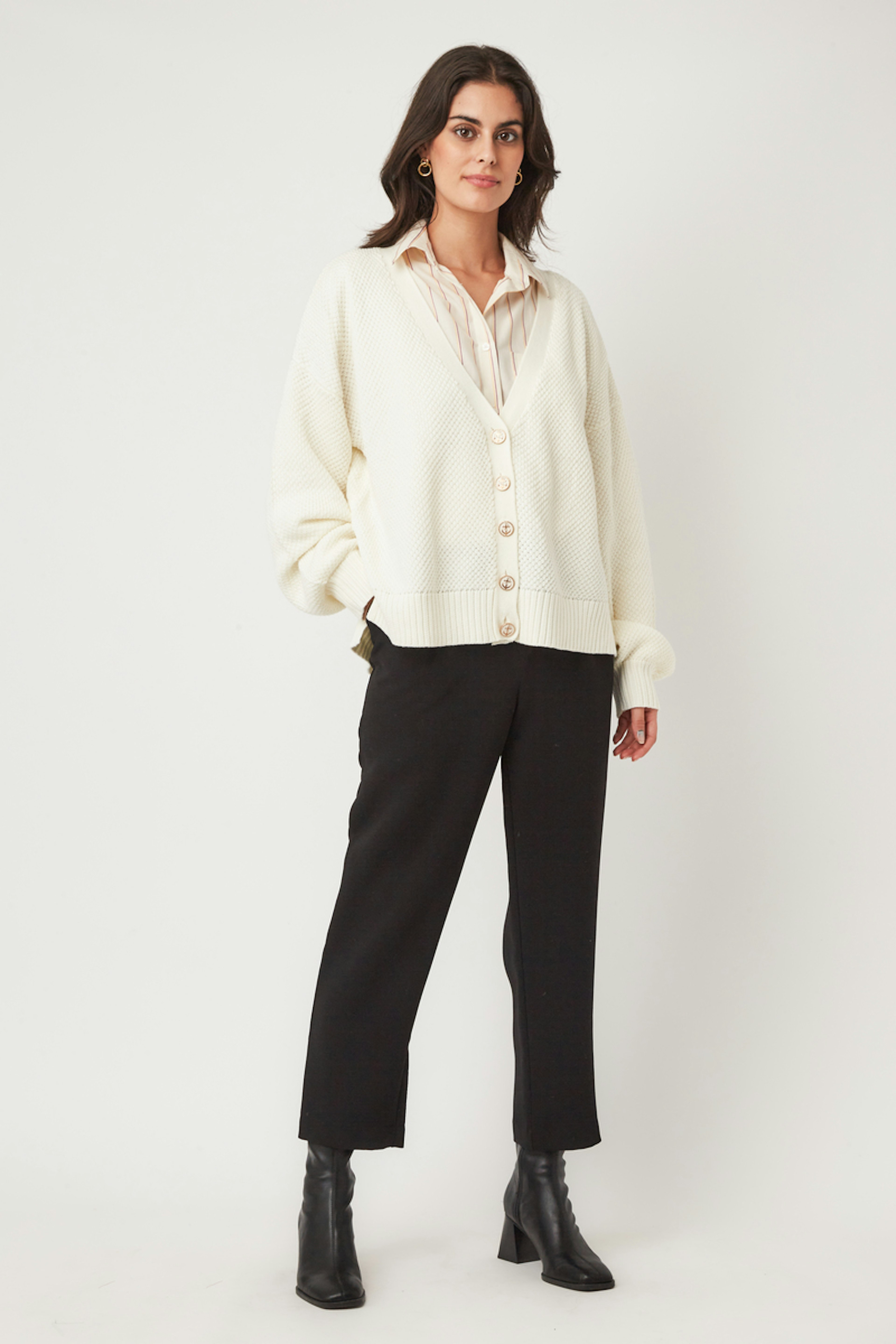 โข Cardigan en mailles blanc โข Fermeture boutonnรฉe ร l'avant (5 gros boutons avec encres) โข Manches longues โข Encolure en V โข Bords cรดtelรฉs