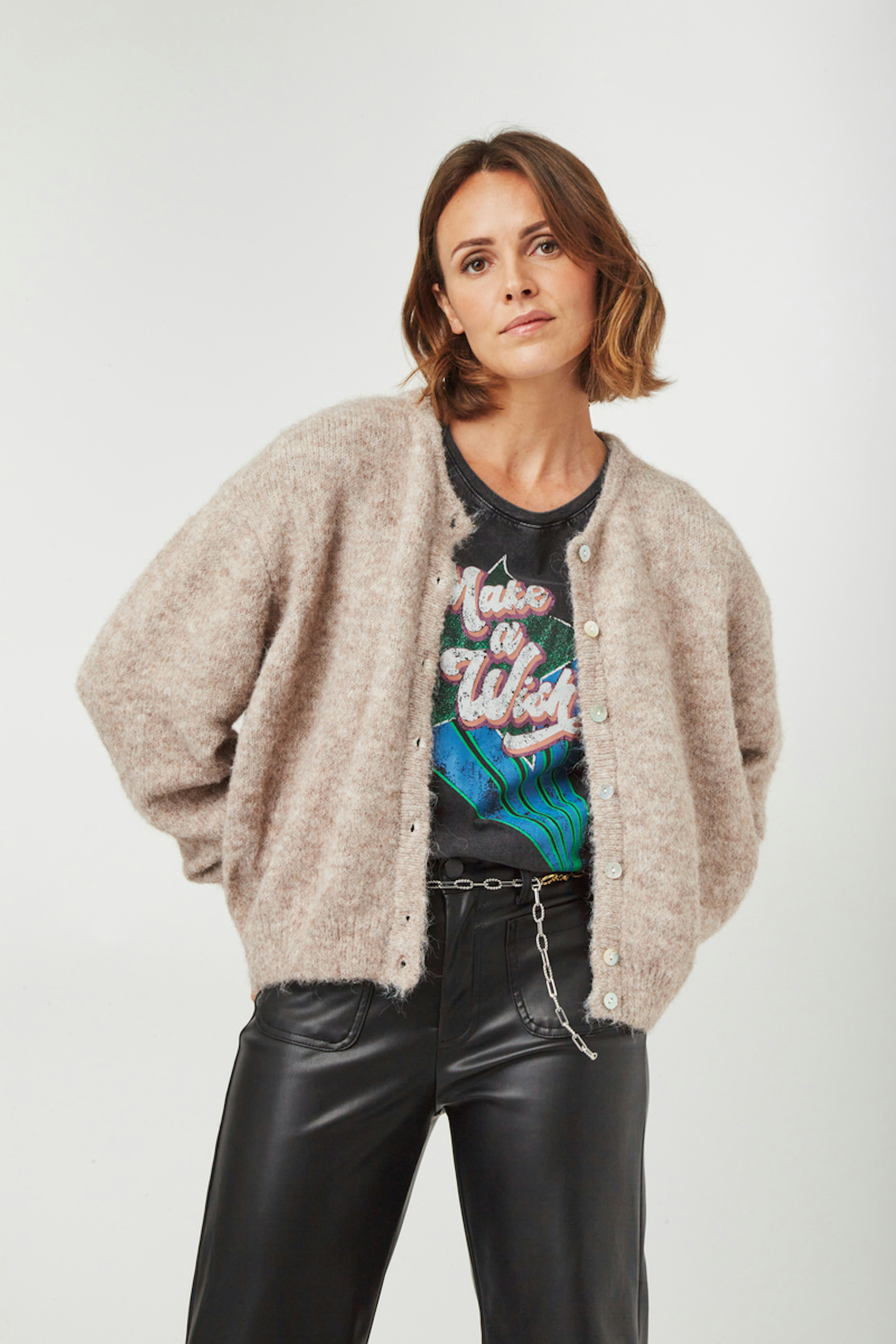 โข La taille unique convient du 34 au 40 โข Cardigan ร manches longues taupe โข Fermeture boutonnรฉe โข Tricot รฉpais โข Ourlet et poignets larges โข Col rond