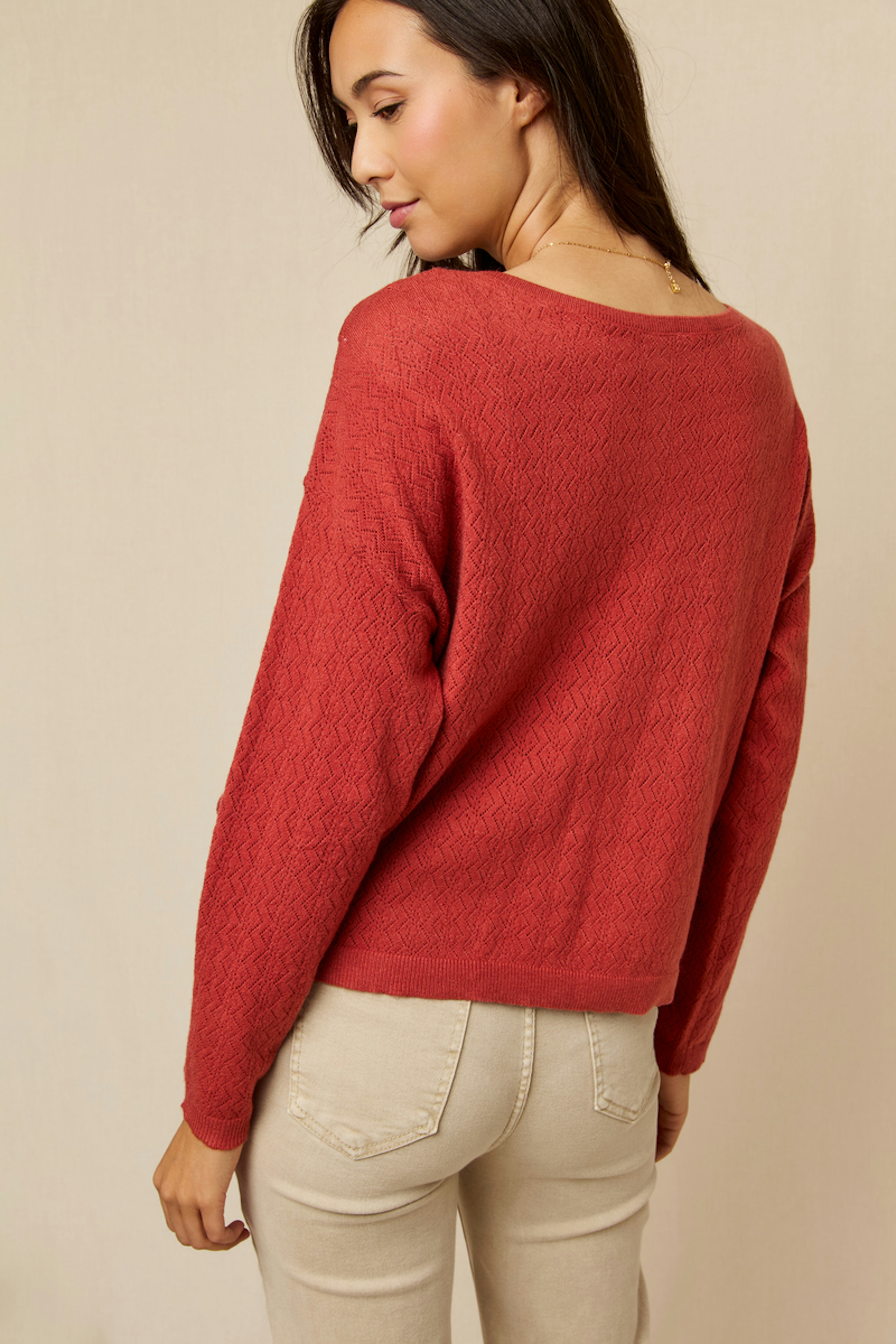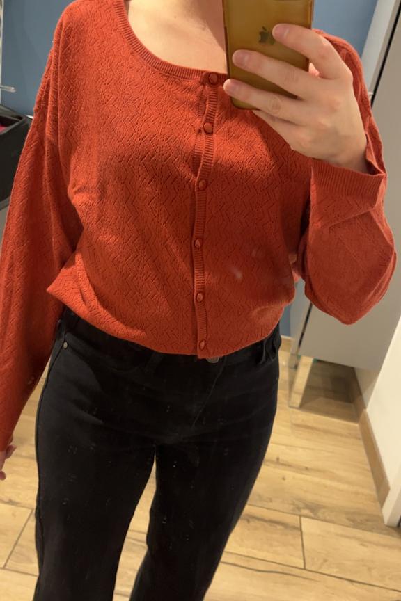 “La couleur est moins rouge que sur la photo, c'est plutôt "feuille d'automne". Le gilet est fin mais doux, très joli en pull.”