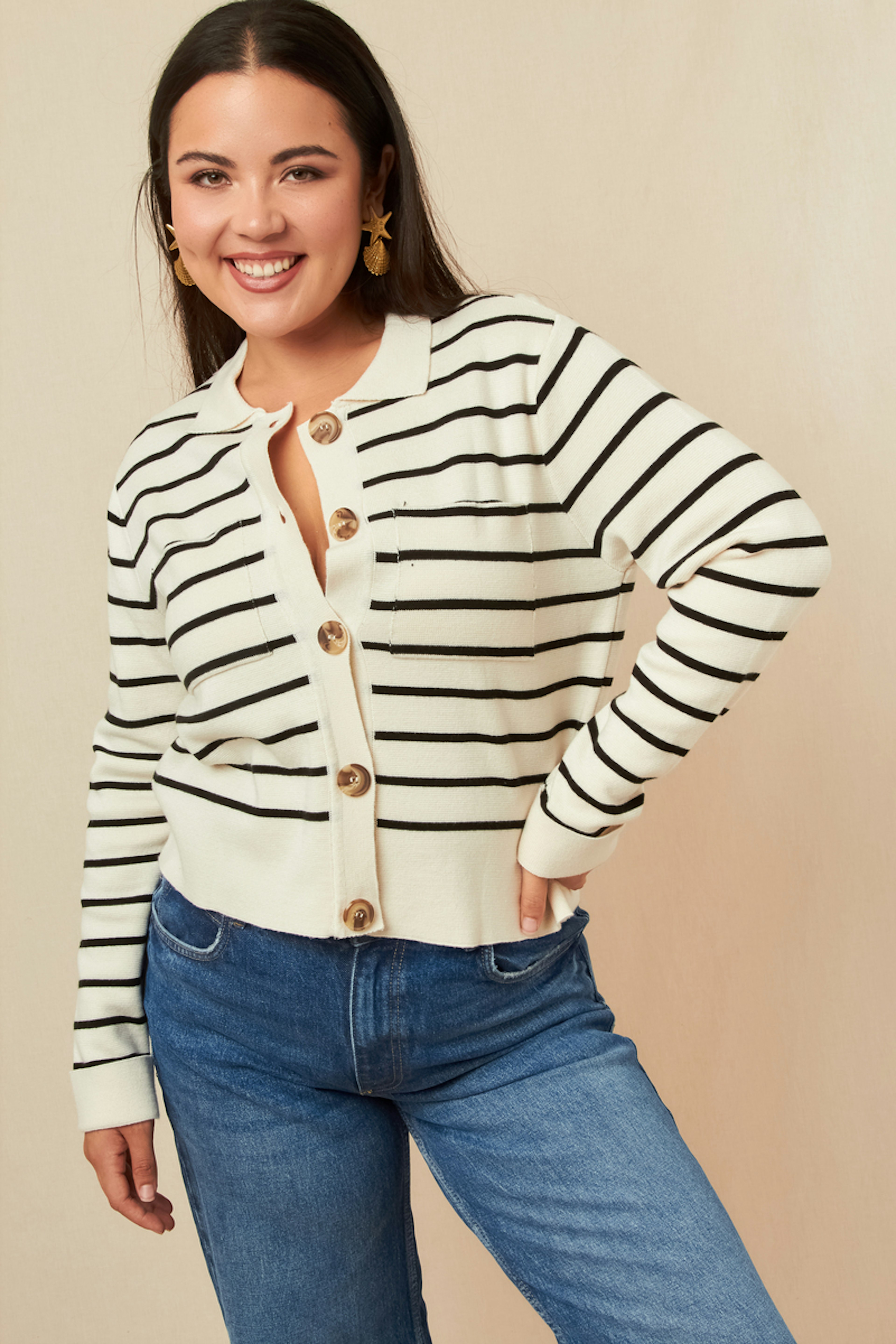 Associez ce gilet à rayures avec un jean taille haute pour un look décontracté et chic. Parfait en toute saison. • Gilet rayé • Manches longues • Col chemise • Fermeture à boutons • Toucher doux et confortable