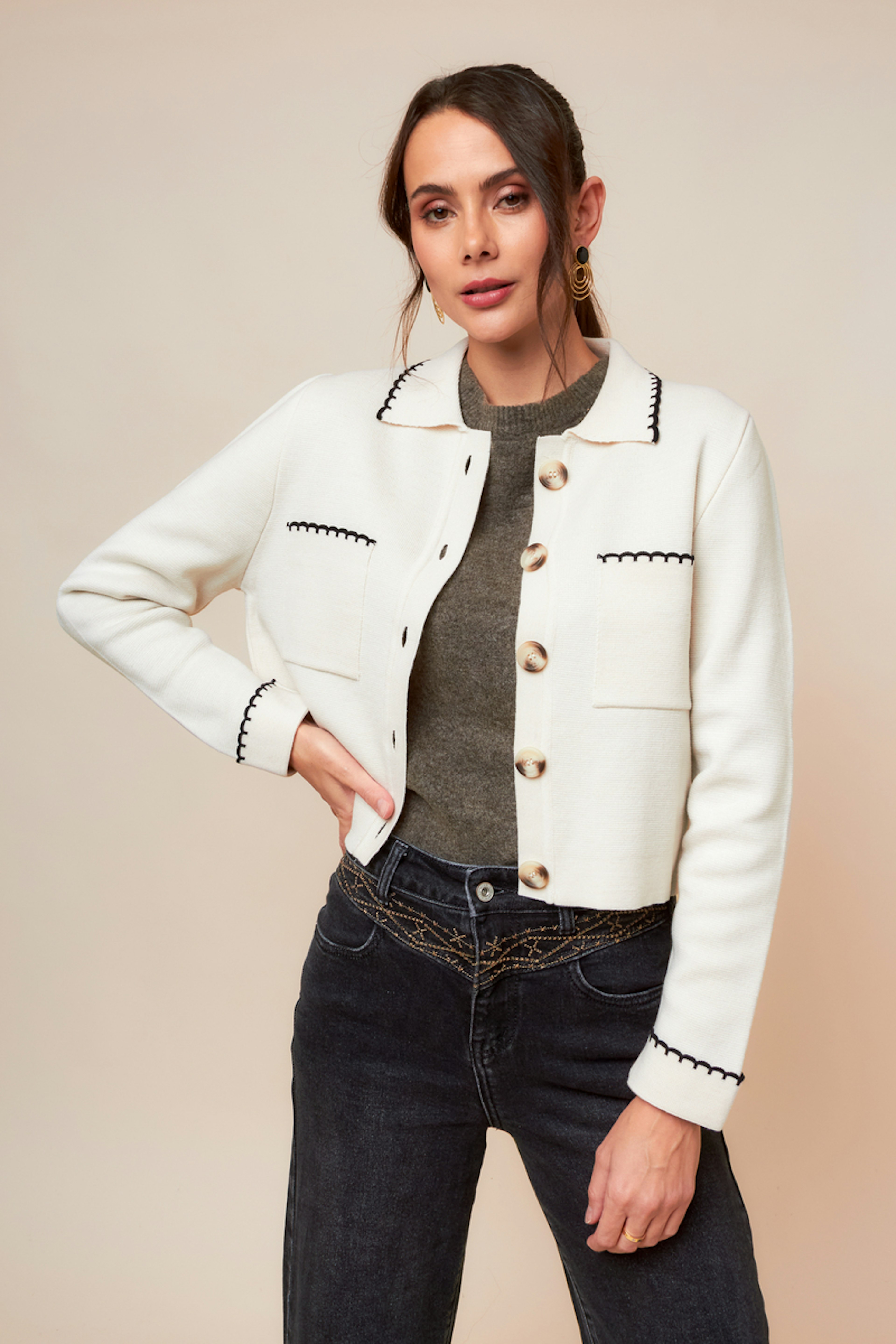 Associez ce gilet élégant avec un jean noir et des bottines pour un look chic. Idéal pour la saison hivernale. • Gilet en laine • Fermeture boutonnée • Détail couture contrastante • Poches plaquées avant • Col classique