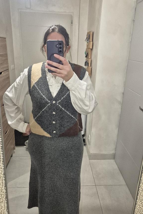 Optez pour un look chic en superposant ce gilet sur une chemise blanche, complรฉtez avec des bottes en cuir marron pour une touche sophistiquรฉe. โข Gilet en laine recyclรฉe โข Coupe droite โข Encolure en V โข Fermeture par boutons โข Motif ร rayures