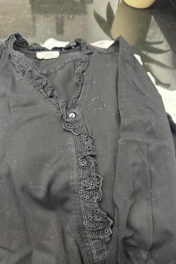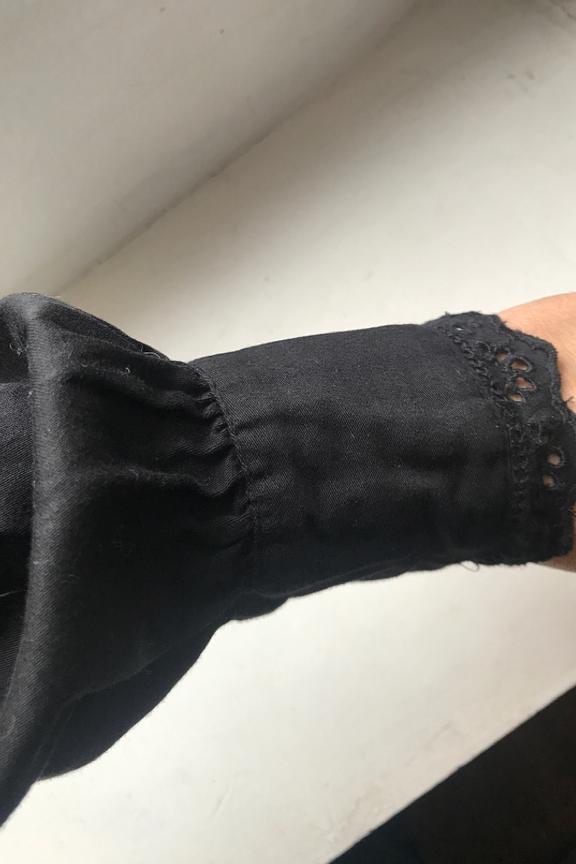 โข Chemise noire ร manches longues โข Broderies anglaises qui entourent la boutonniรจre et le col โข Dรฉcolletรฉ en V