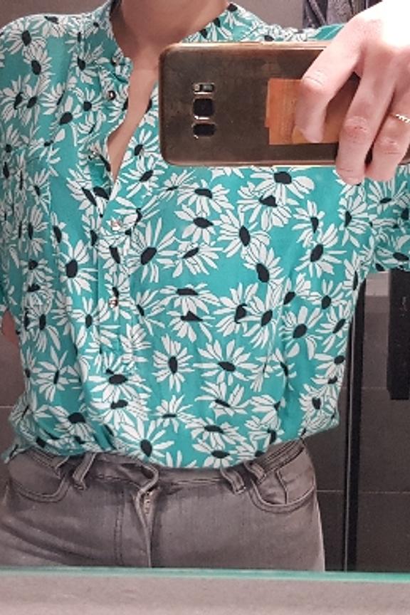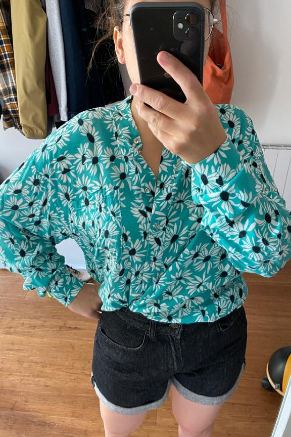 Alphonse, cโest la chemise au look chic tout en imprimรฉ Daisy Turquoise. Sa matiรจre trรจs souple lui donne beaucoup de fluiditรฉ. โข Grande chemise manches longues, col mao, fermรฉe par de petits boutons dorรฉs sur la patte polo devant et aux poignets โข Imprimรฉ turquoise fleuri โข Grande poche plaquรฉe cรดtรฉ coeur