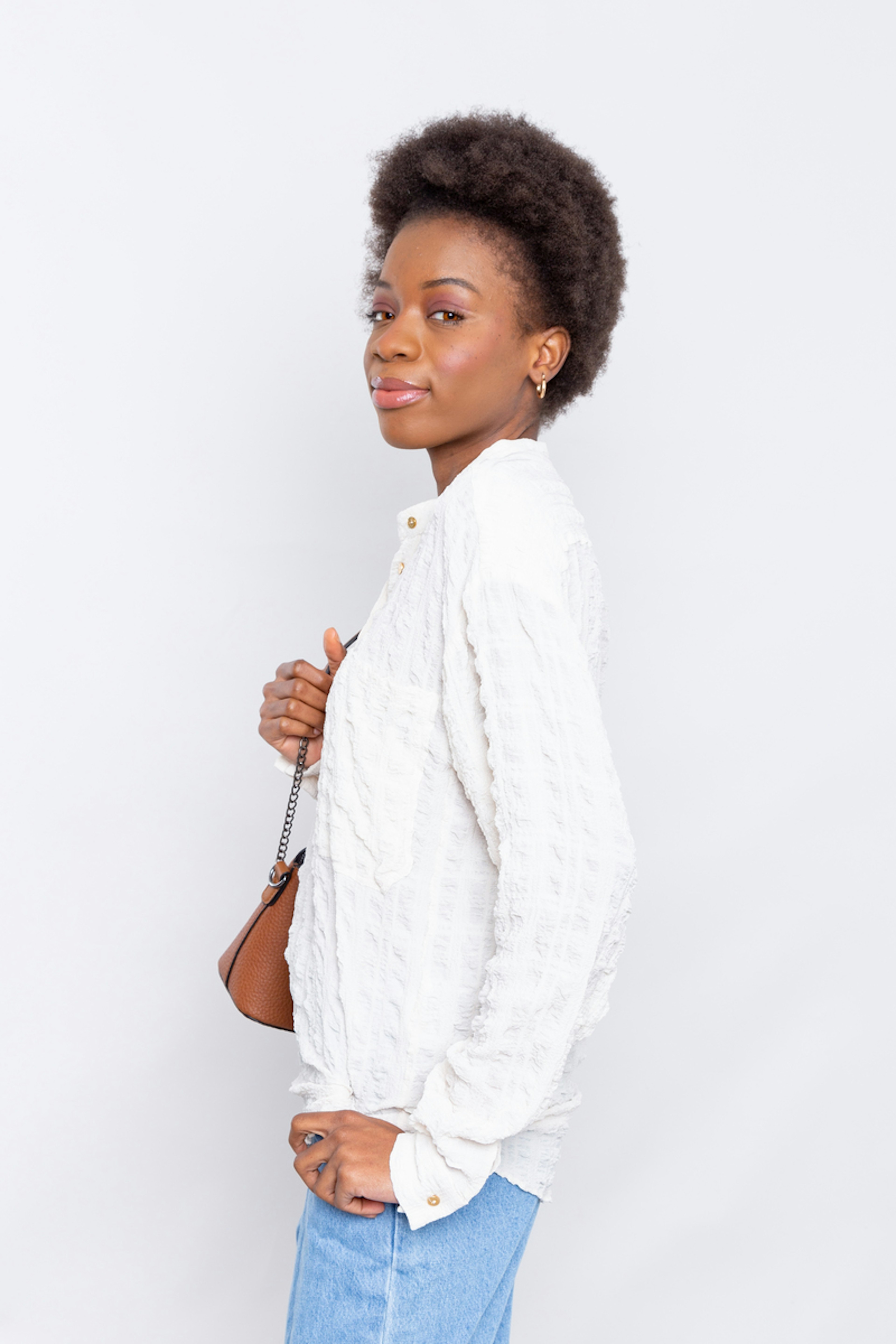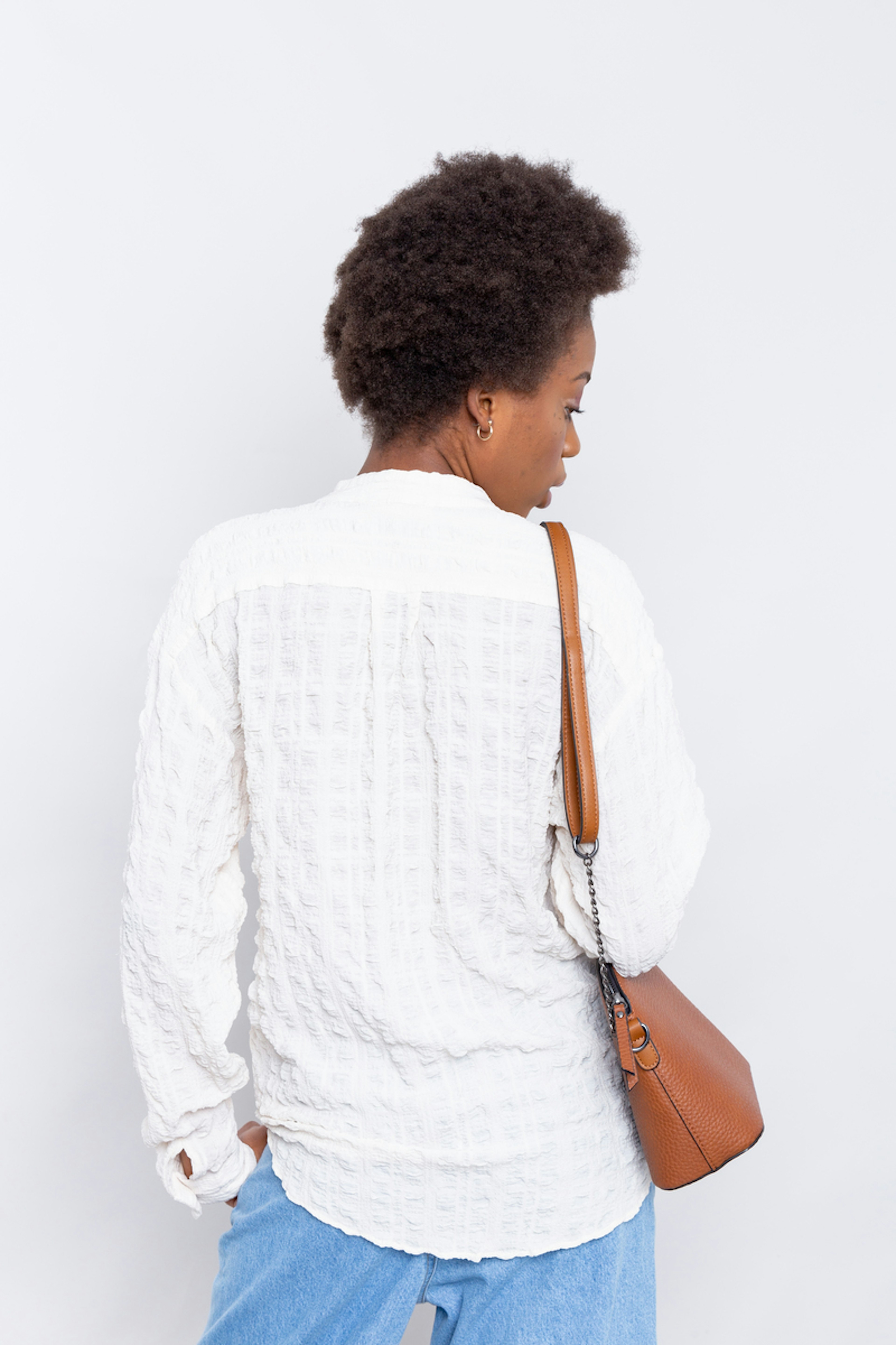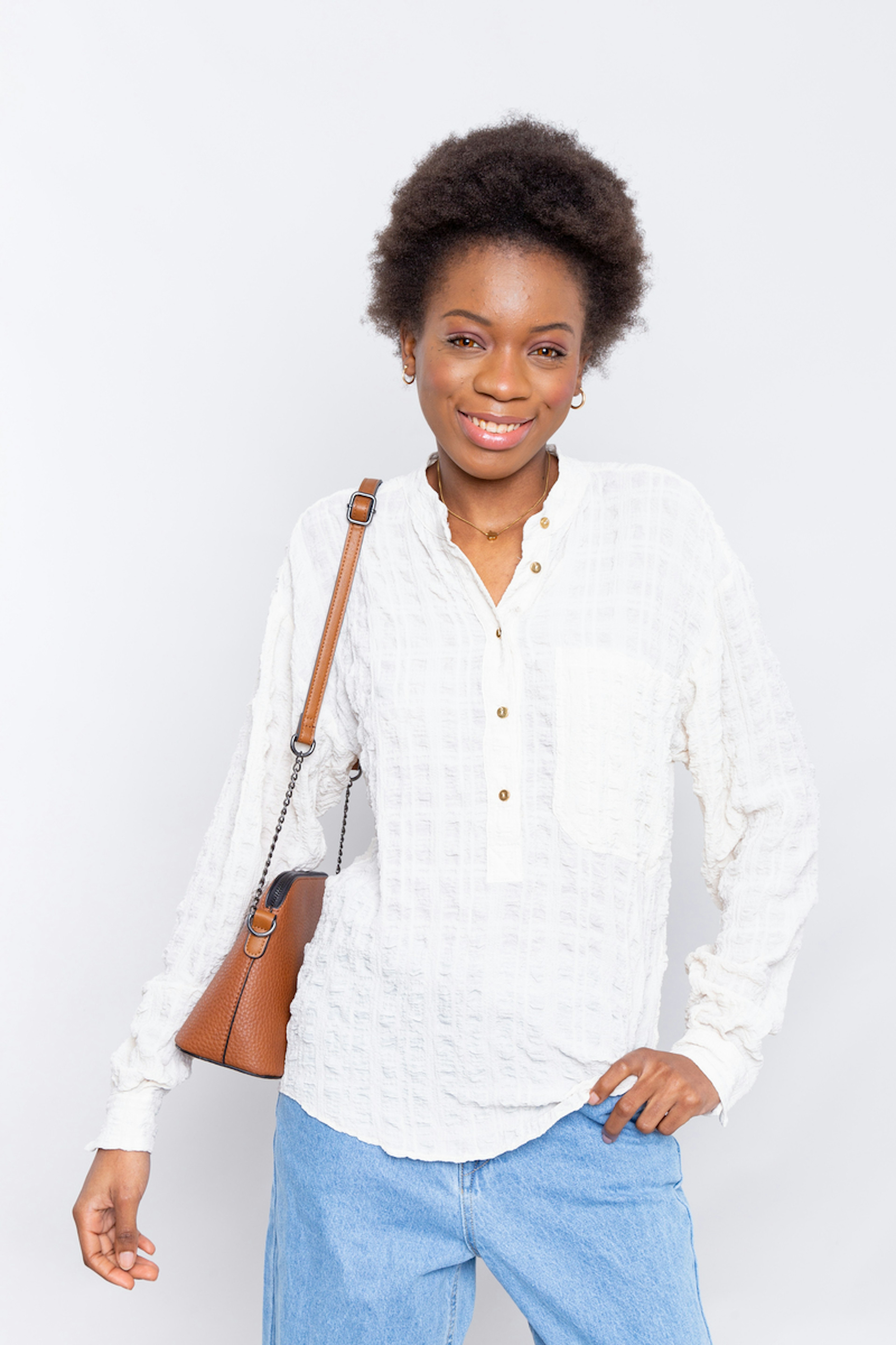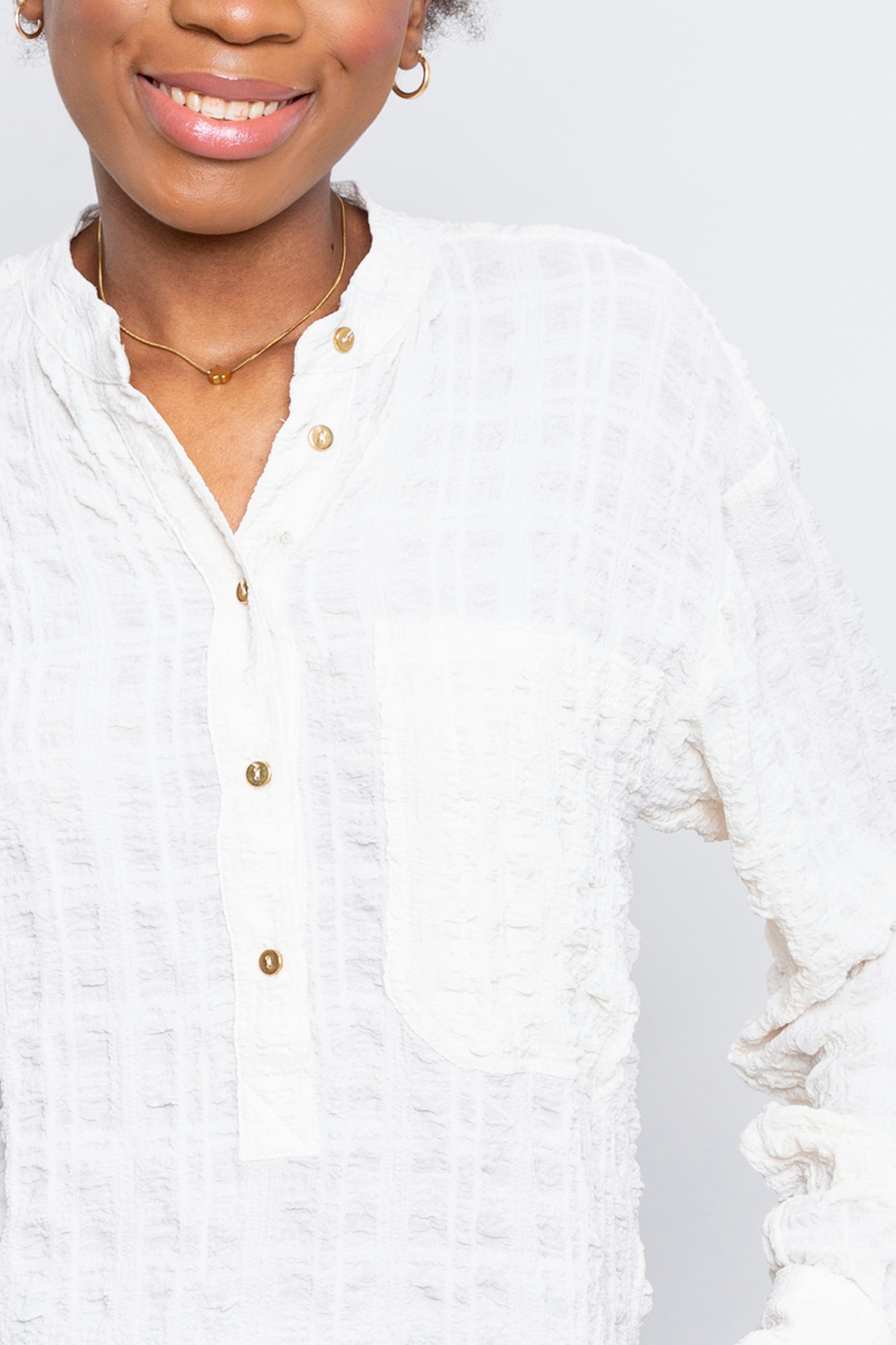 Alphonse, cโest la chemise au look bohรจme, en version gaufrรฉe รฉcru. Sa matiรจre moelleuse viendra complรฉter vos essentiels. โข Grande chemise manches longues, col mao, fermรฉe par de petits boutons dorรฉs sur la patte polo devant et aux poignets โข Grande poche plaquรฉe cรดtรฉ coeur