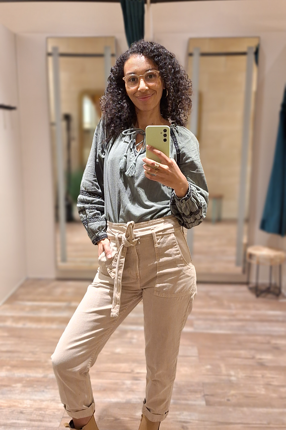 โBlouse trรจs chouette, je fais entre S et M en haut et la taille S est trรจs bien car coupe ample. Je lโai portรฉe plusieurs fois. Jolie couleur et style.โ