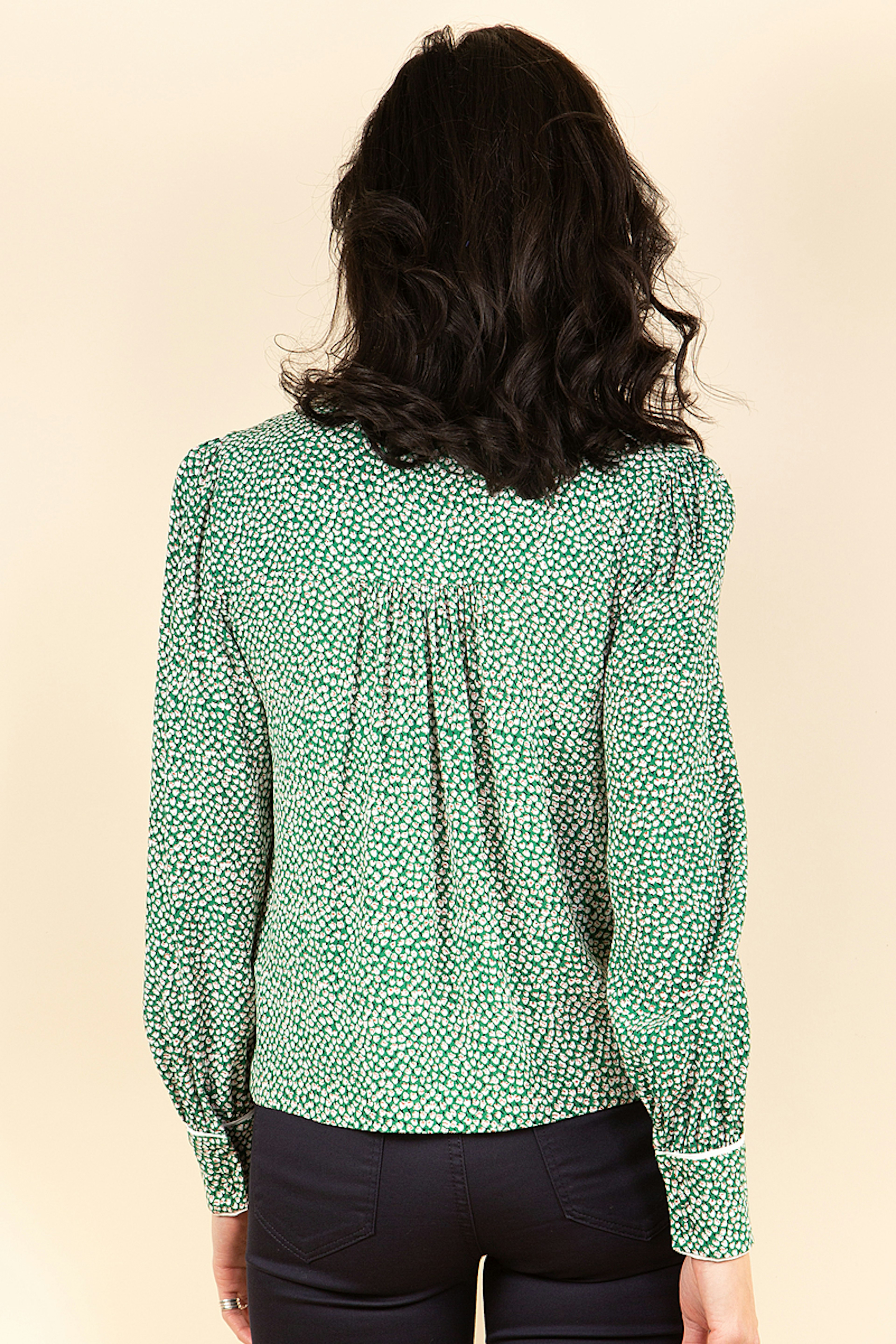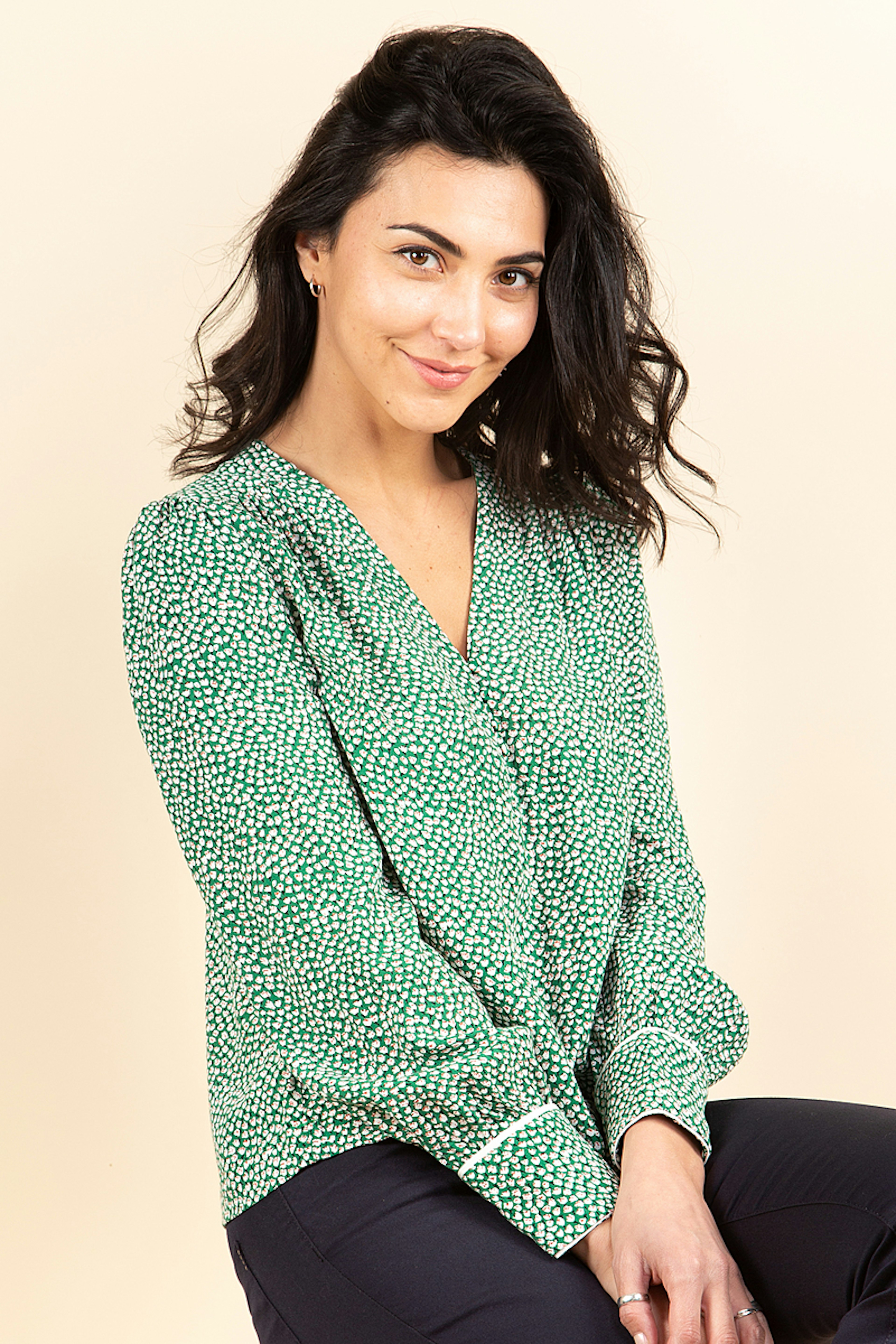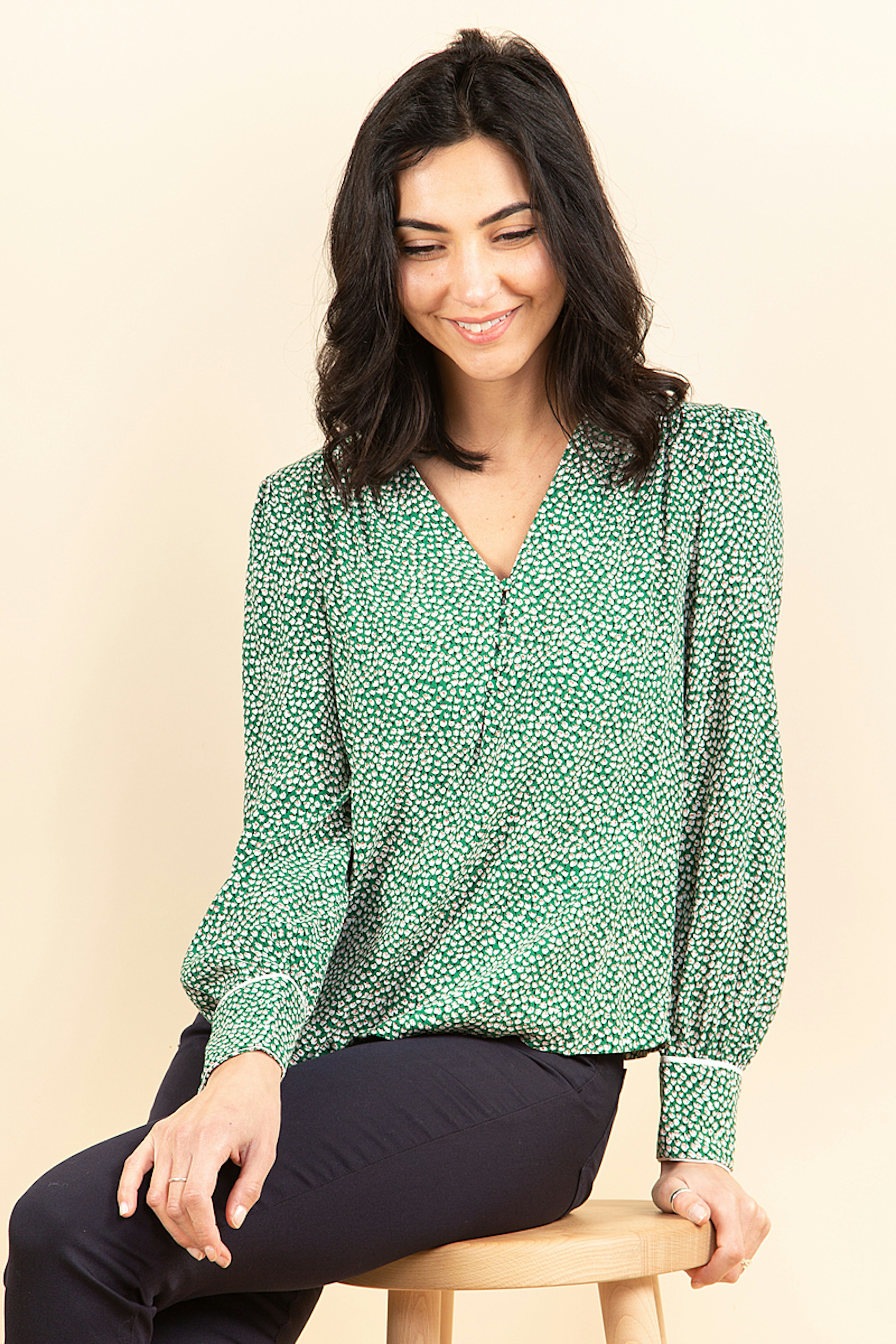 On adore le top Bambi imprimรฉ en viscose. Son micro motif dans les tons verts s'associe ร toutes vos tenues. Le dรฉtail en plus ? Le passepoil รฉcru soigneusement cousu sur les manches de ce chemisier.