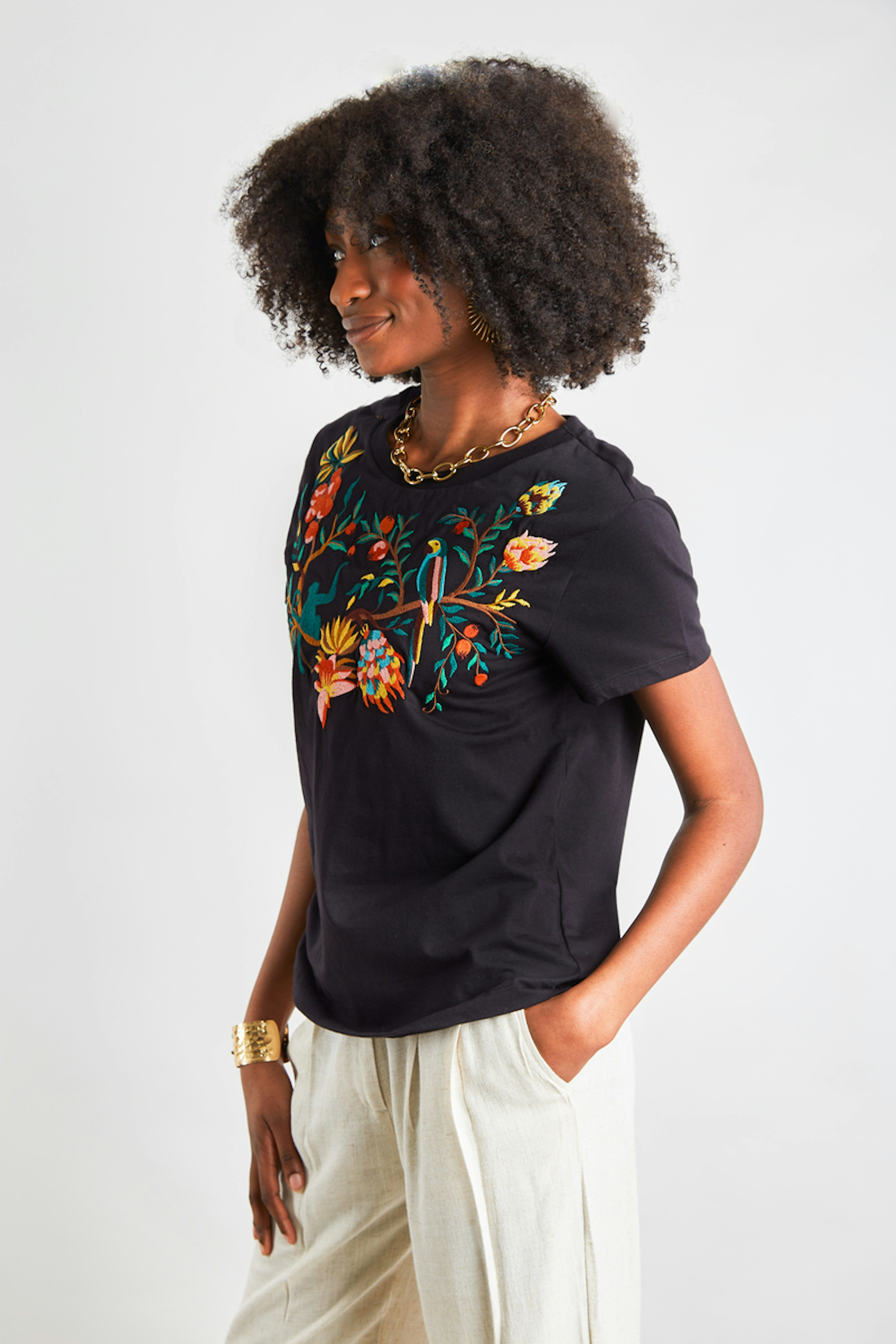โข Haut barelli โข Encolure ronde โข Manches courtes โข Coupe droite โข Finition bord cรดtes ร l'encolure โข Ourlet surpiquรฉ ton sur ton en bas des manches et bas du tee-shirt โข Broderie exclusive sur le milieu devant