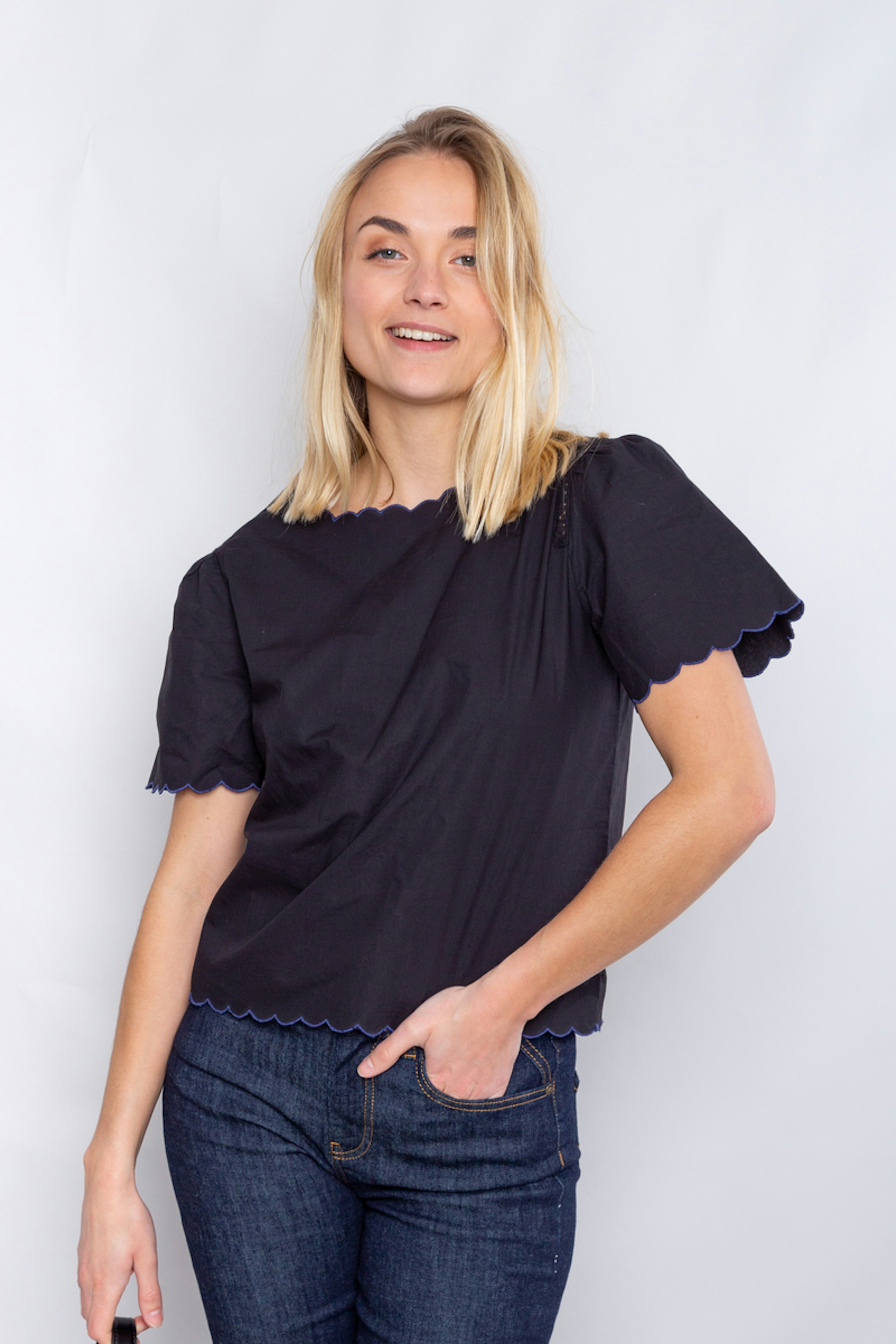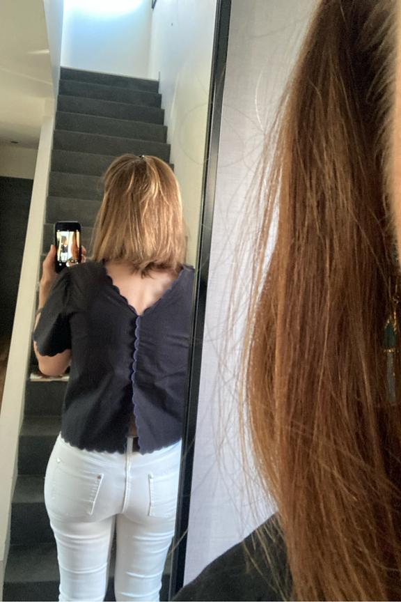 โข Top en popeline de coton biologique uni โข Manches courtes et encolure V โข Toutes les finitions sont festonnรฉes brodรฉes en contraste