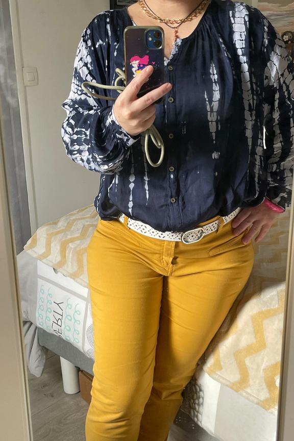 โข Blouse ร manches longues โข Coupe ample et loose โข Encolure ronde โข Tissu en viscose satinรฉ ร imprimรฉ tie and dye marine et blanc โข Fronces aux รฉpaules et aux poignets โข Boutonnage intรฉgral avec boutons nacrรฉs