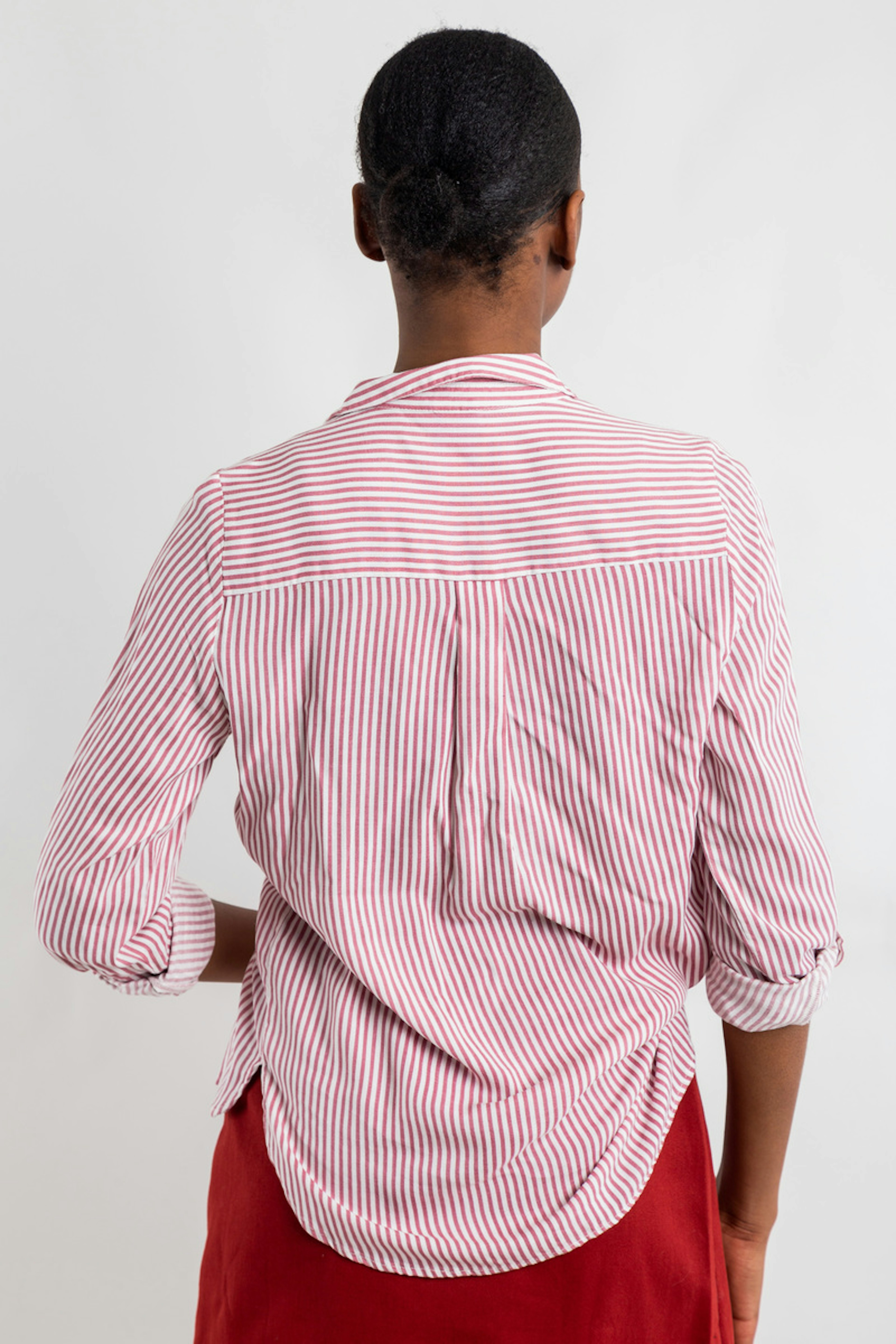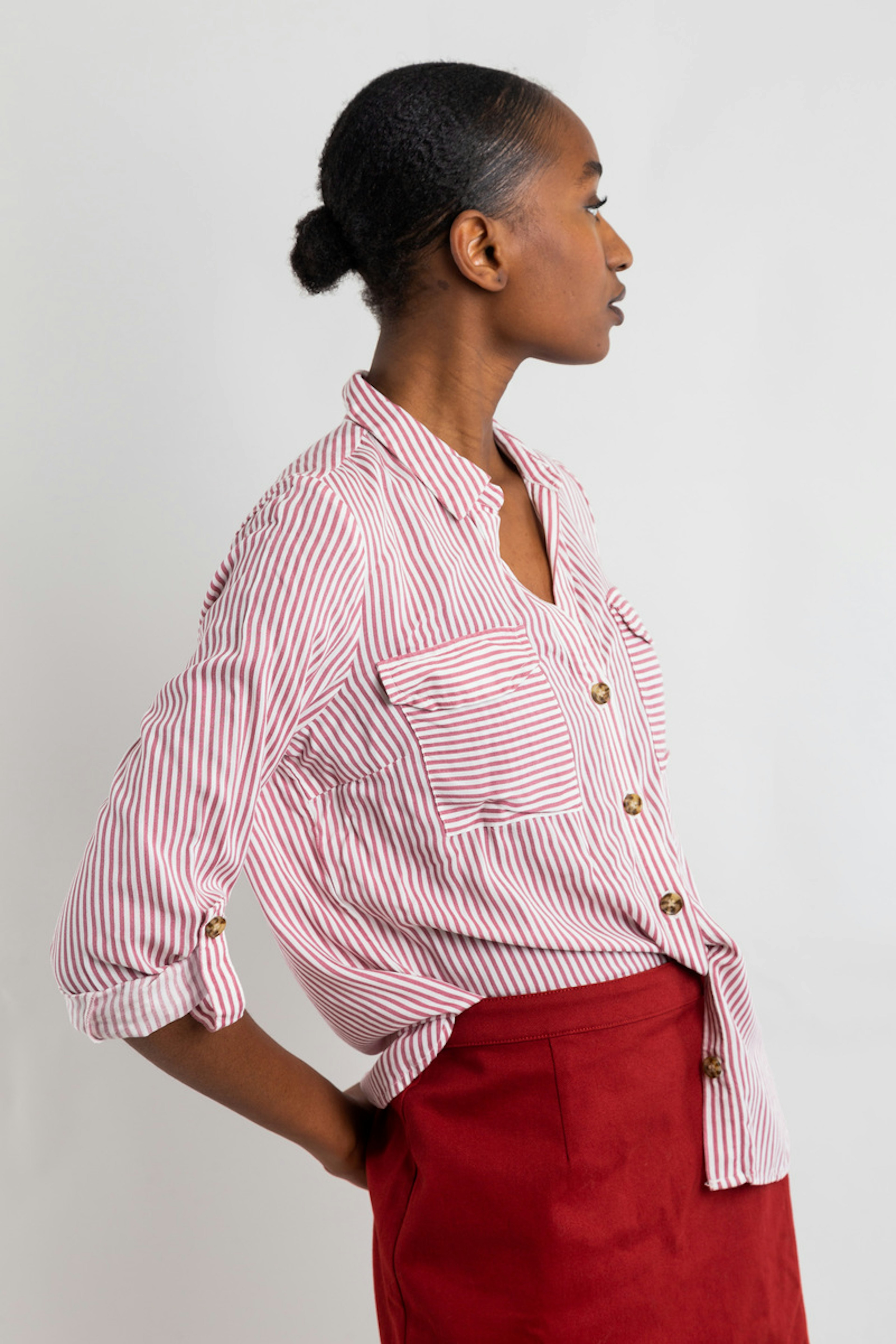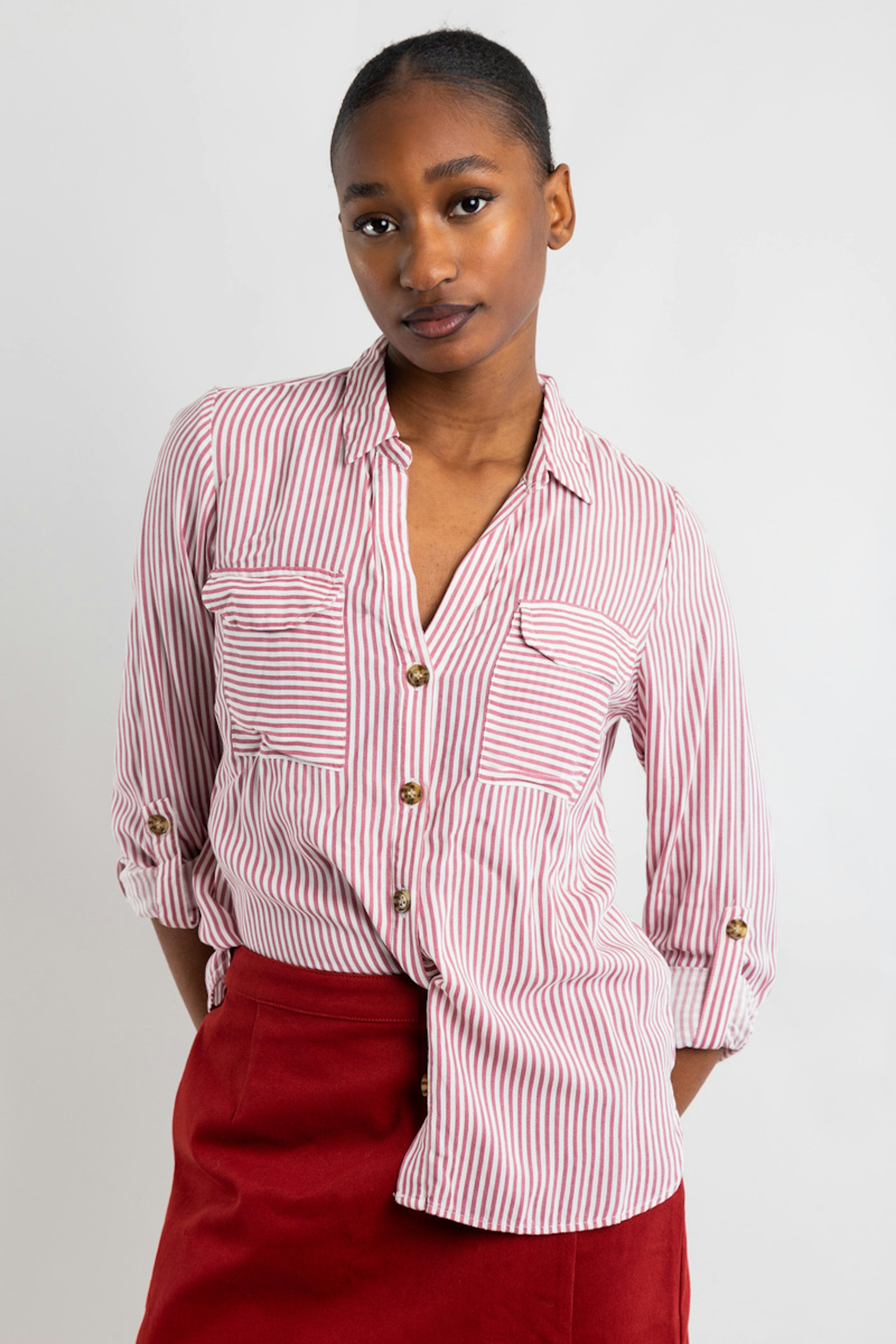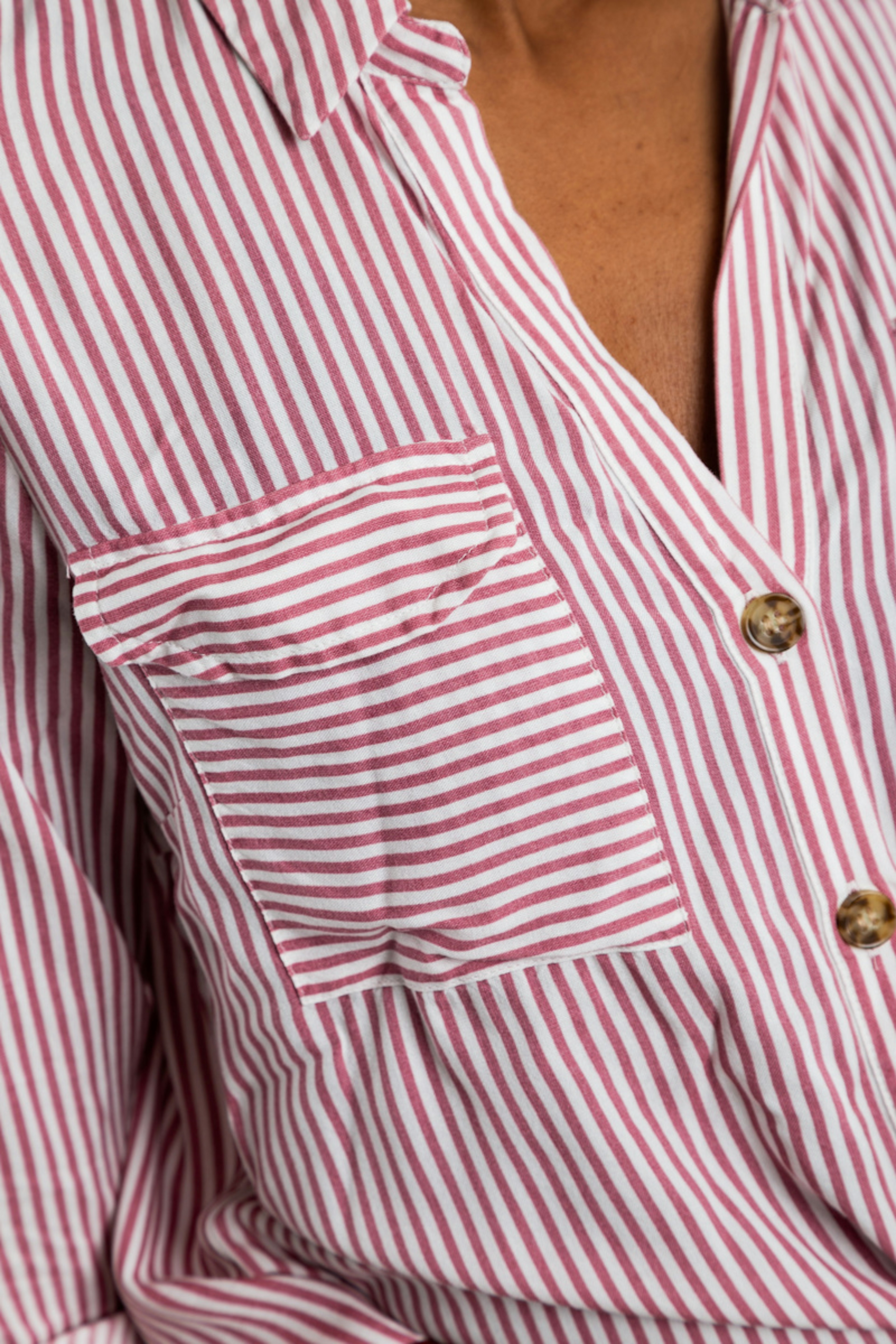 โ€ข Les manches longues, avec leurs ourlets boutonnรฉs retroussรฉs, apportent une touche casual ร  la piรจce โ€ข Le col en V, typique de la chemise, ajoute une touche de sensualitรฉ en dรฉvoilant subtilement votre dรฉcolletรฉ โ€ข Ses poches plaquรฉes ร  rabats sur la poitrine, apportent une touche chic et รฉlรฉgante ร  n'importe quelle tenue โ€ข La coupe droite de ce chemisier confรจre une allure intemporelle et moderne โ€ข Ce chemisier ร  rayures blanches et roses est une piรจce idรฉale pour toutes les occasions, qu'il s'agisse de travail ou de sorties en ville