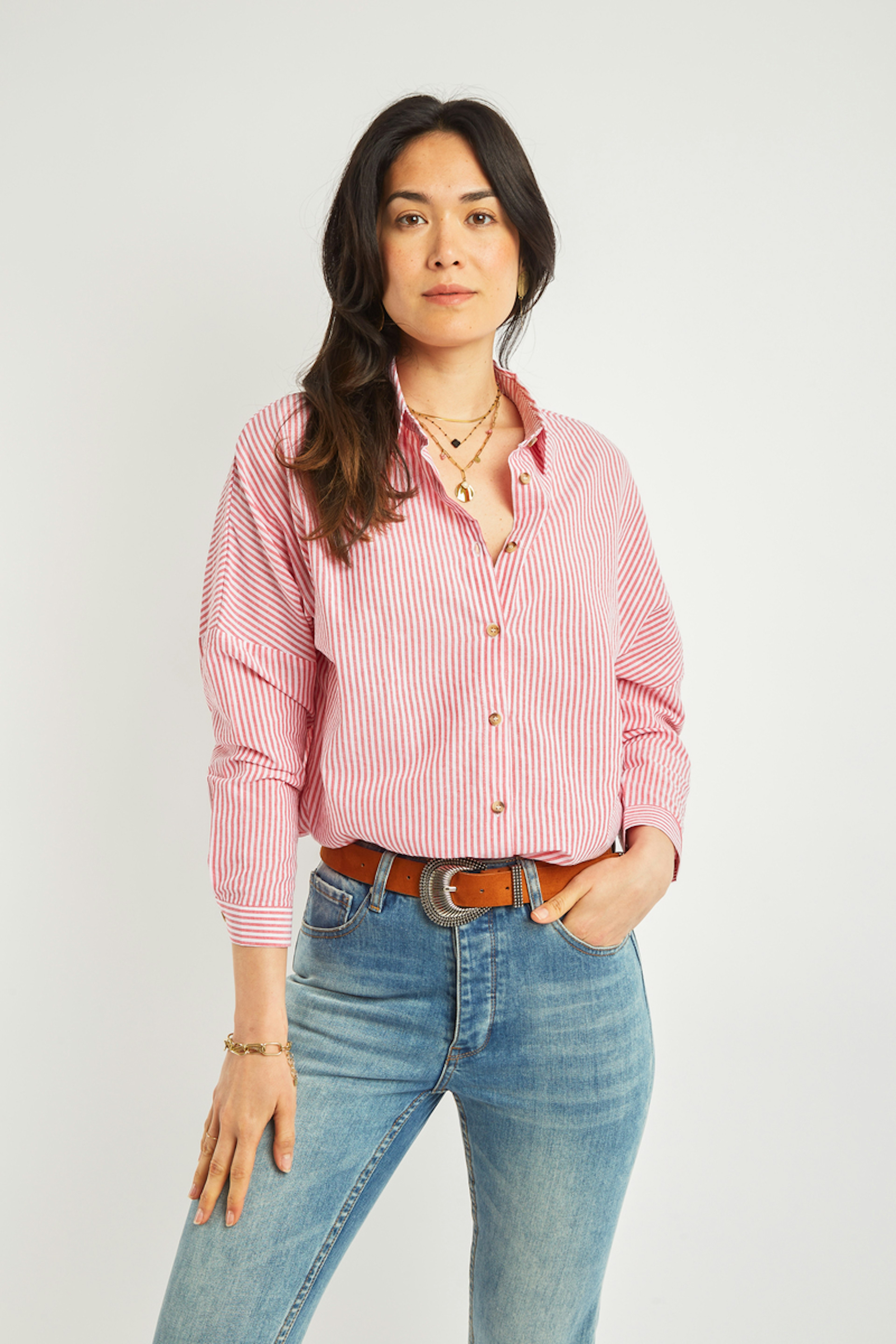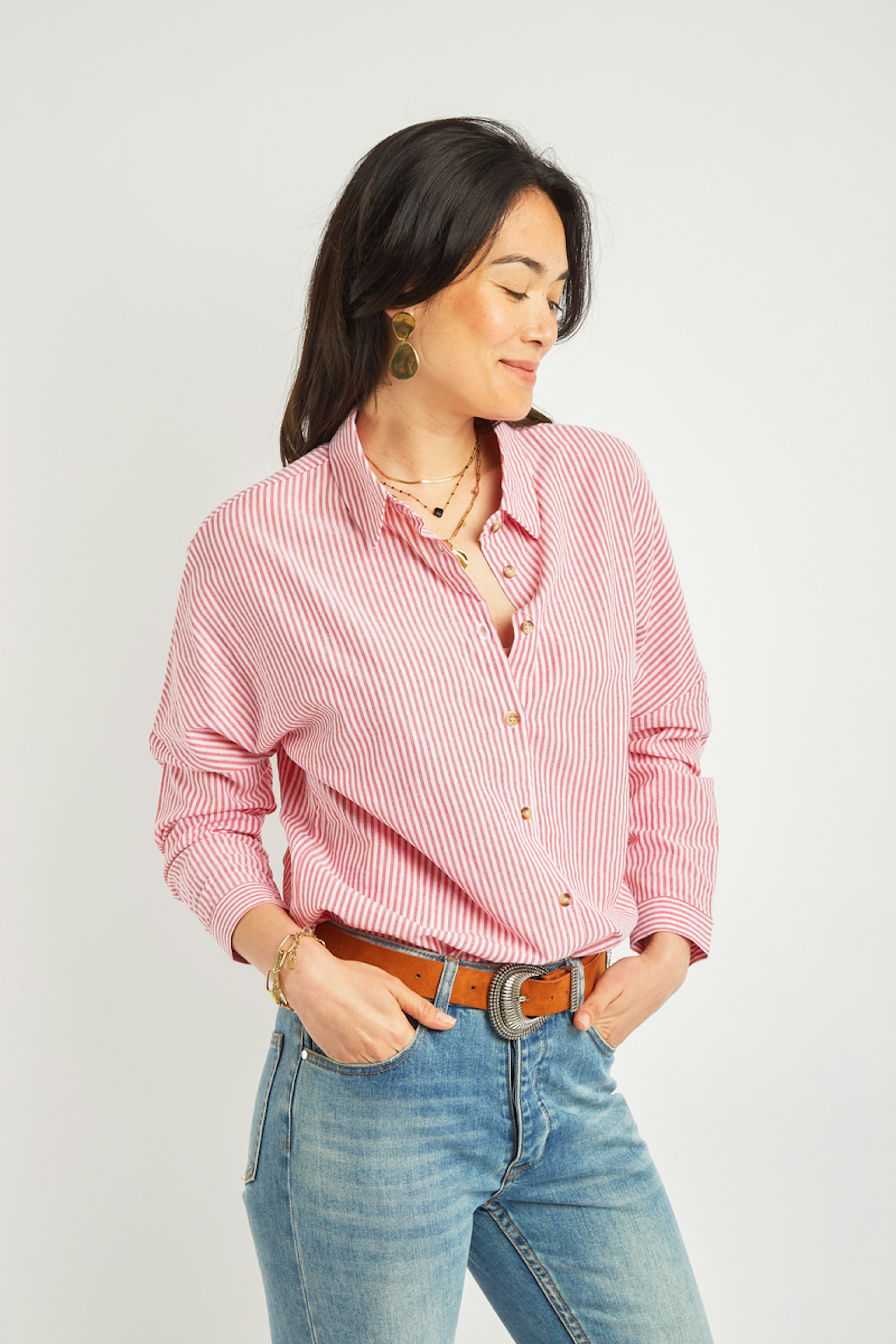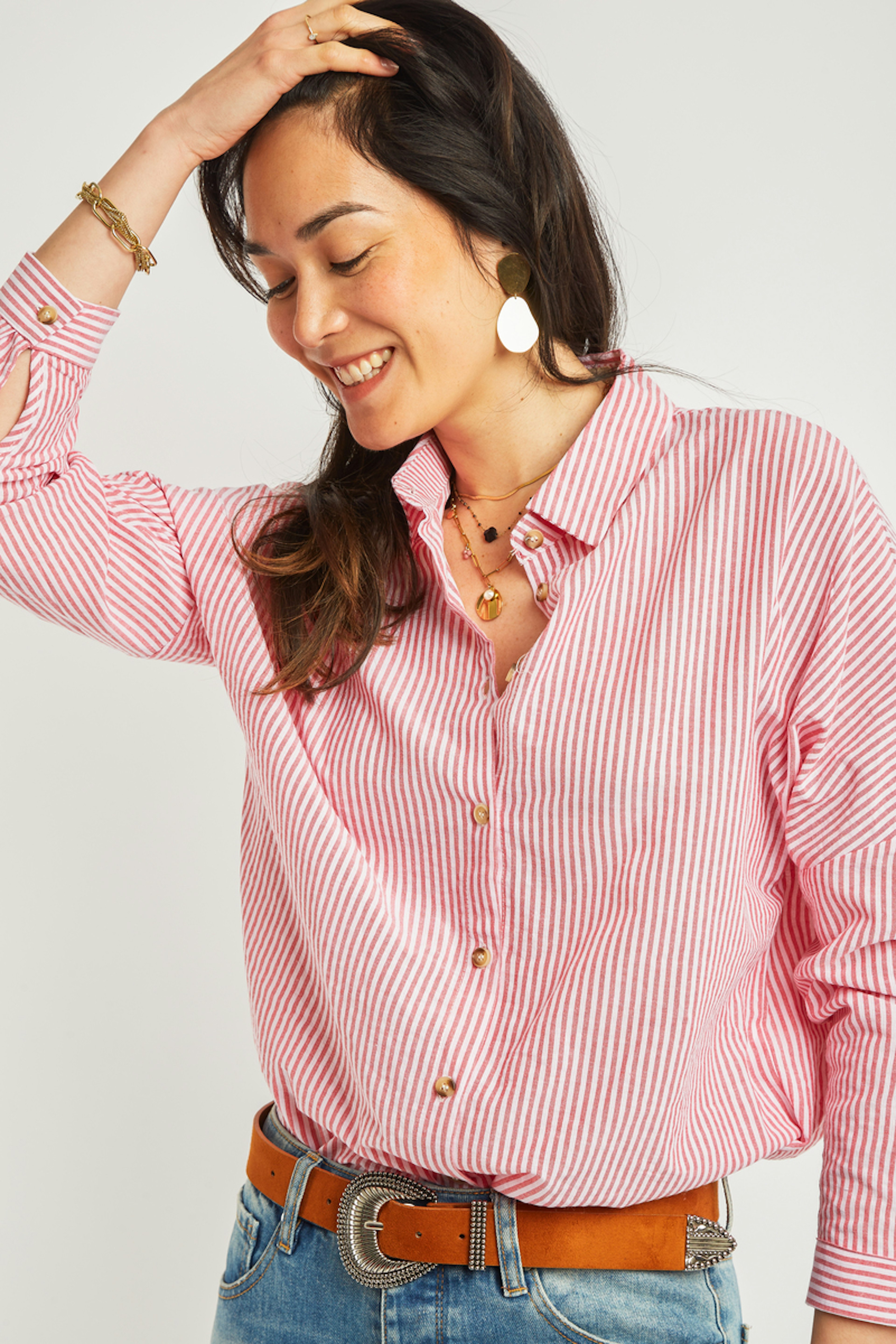 โข Chemise ร rayures blanches et rouges โข Boutons motifs รฉcailles โข Col italien โข ร porter avec quelques boutons ouvert pour un look habillรฉ mais dรฉcontractรฉ !