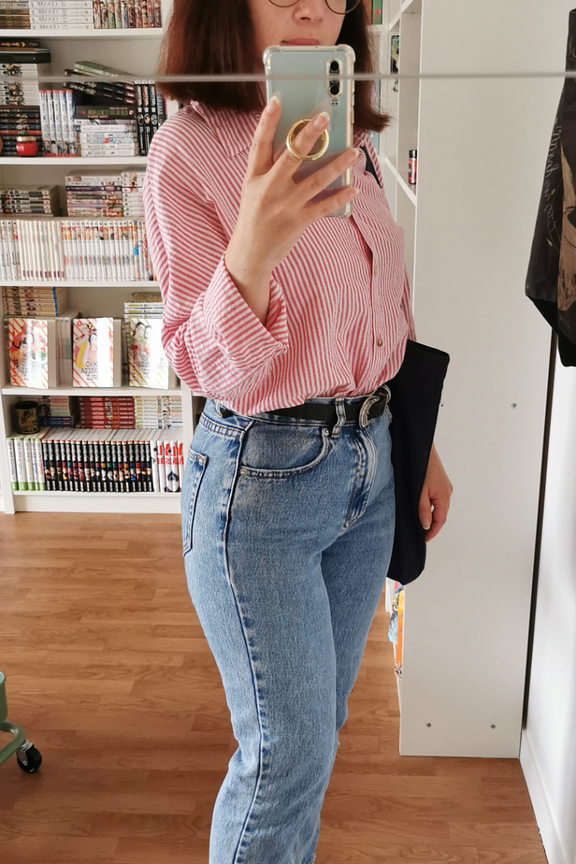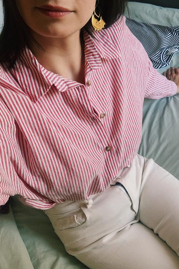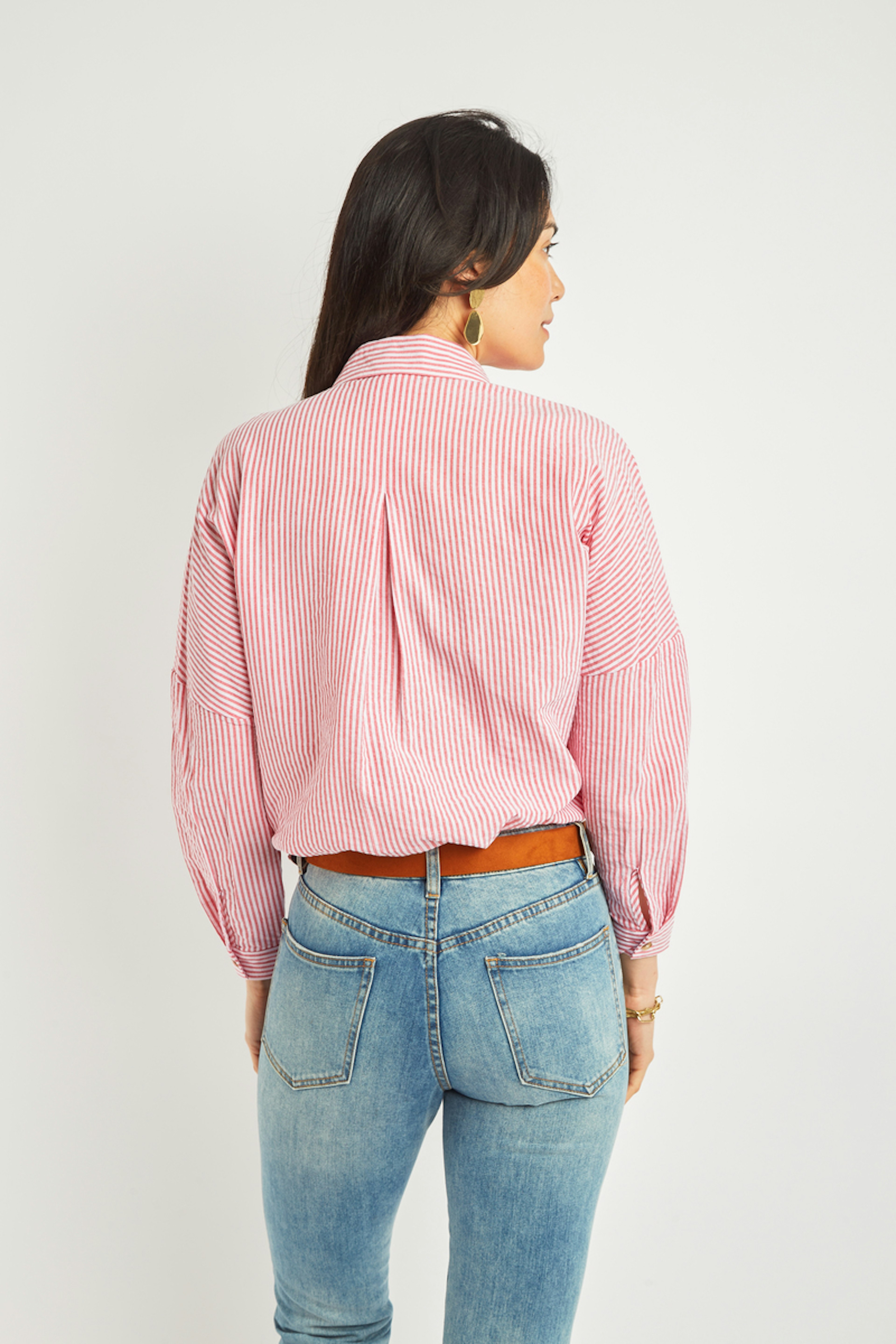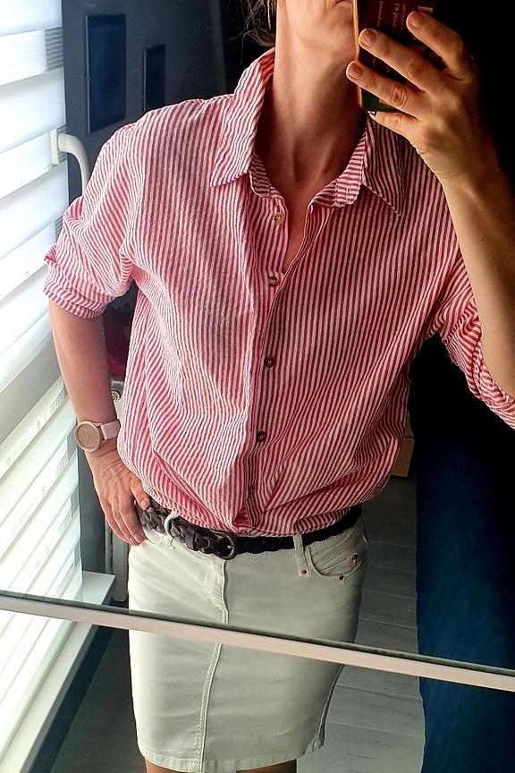โข Chemise ร rayures blanches et rouges โข Boutons motifs รฉcailles โข Col italien โข ร porter avec quelques boutons ouvert pour un look habillรฉ mais dรฉcontractรฉ !