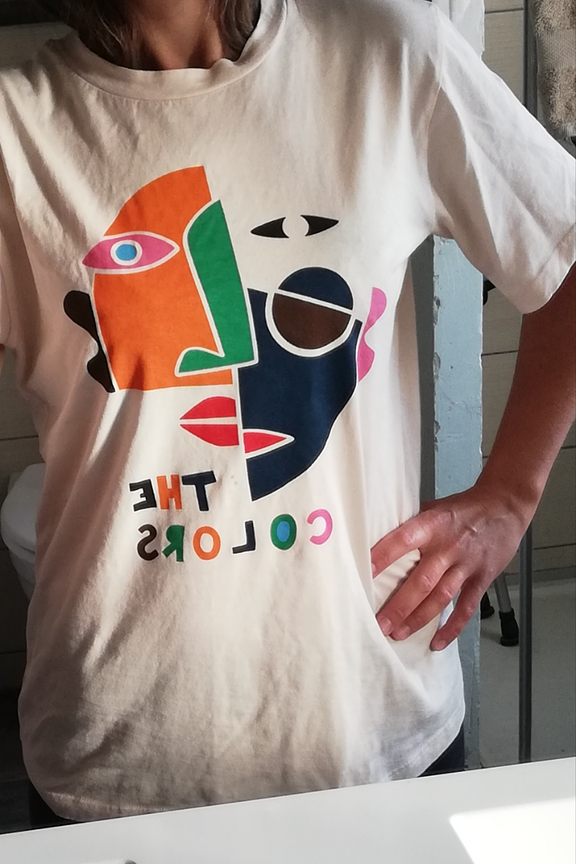 Colors est un t-shirt repensรฉ et conรงu dans une matiรจre รฉco-responsable. โข T-shirt beige ร manches courtes โข Sรฉrigraphie colorรฉe sur le devant โข Conรงu en coton bio