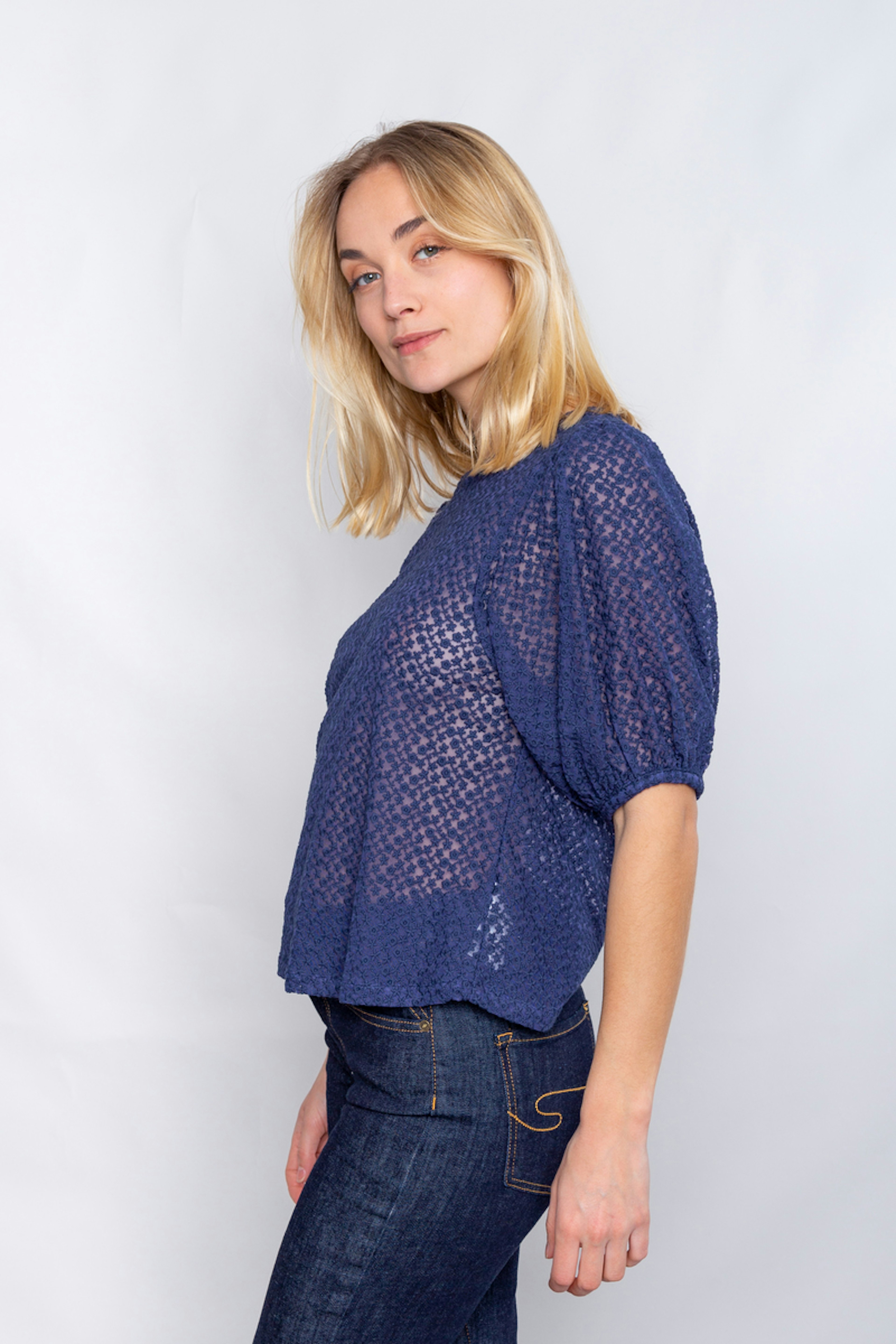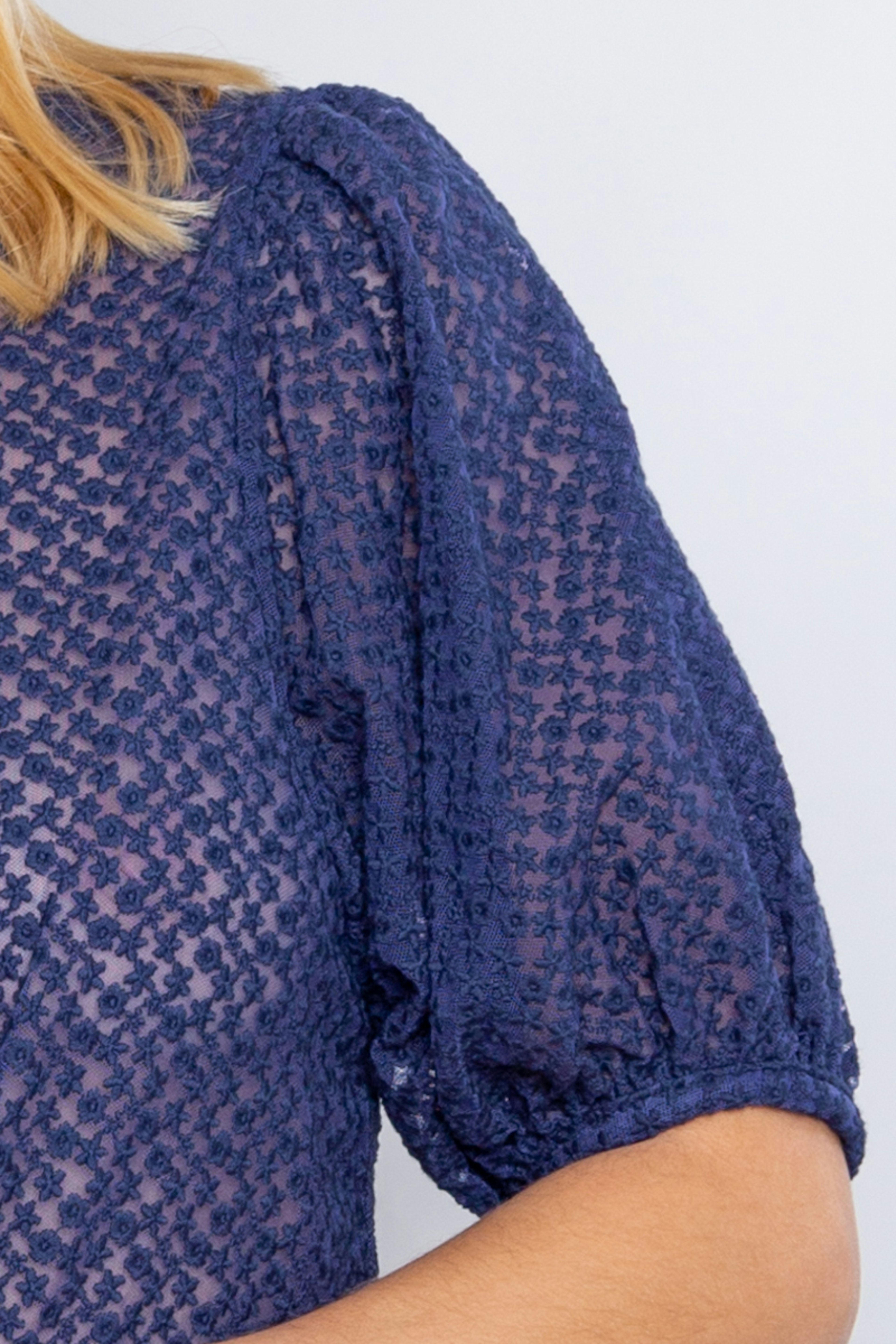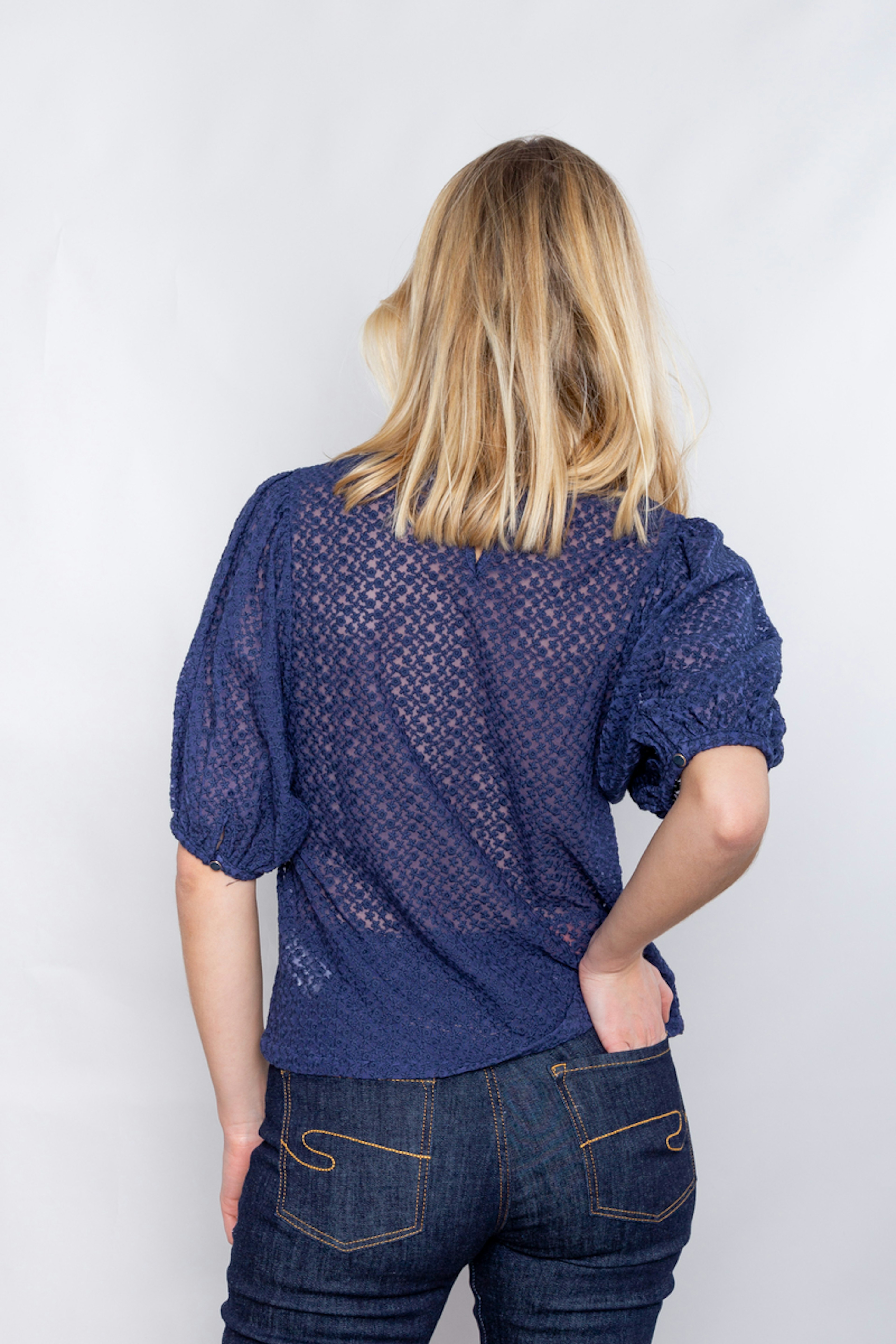 โข Top intรฉgralement en dentelle marine โข Manches 3/4 bouffantes โข Dentelle transparente, ร porter avec une brassiรจre โข Ouverture boutonnรฉe dans le dos