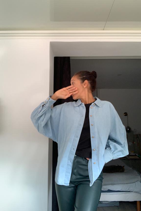 โข Chemise en jean ร manches longues bleue ciel โข Patte de boutonnage โข Coupe droite โข Manches ballons