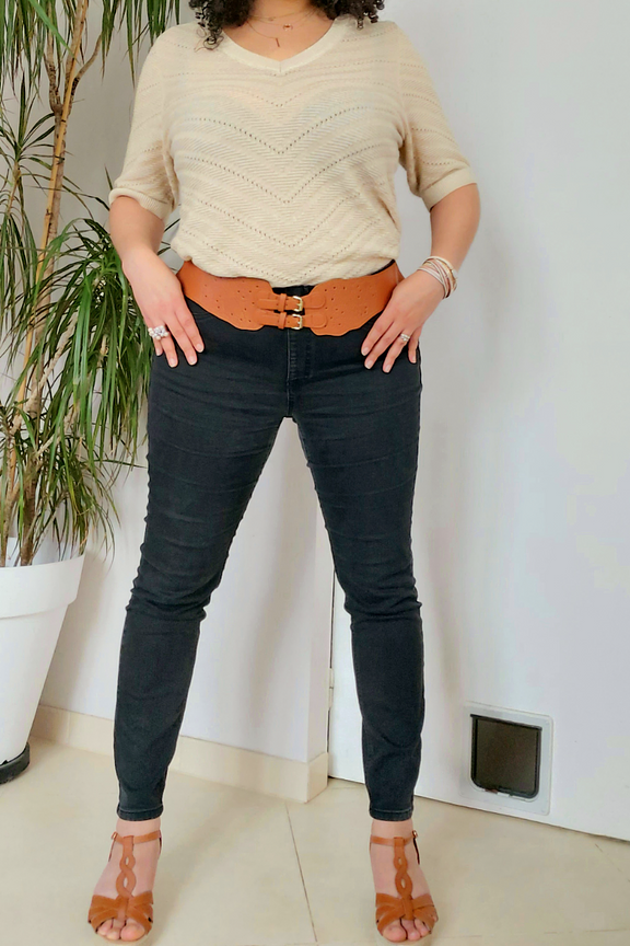 “Ça ne se voit pas sur la photo mais il est brillant, il est fait avec des fils dorés. Légèrement transparent également, à porter avec un debardeur couleur chair en dessous.”
