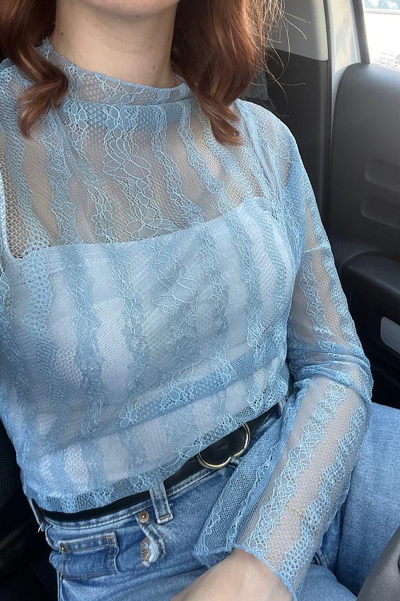 Portez ce haut délicat en dentelle bleue avec un jean taille haute pour un look estival chic. Parfait pour les soirées d'été fraîches. • Haut en dentelle • Manches longues • Col rond • Coupe ajustée • Motif dentelle florale