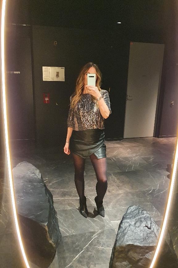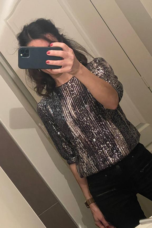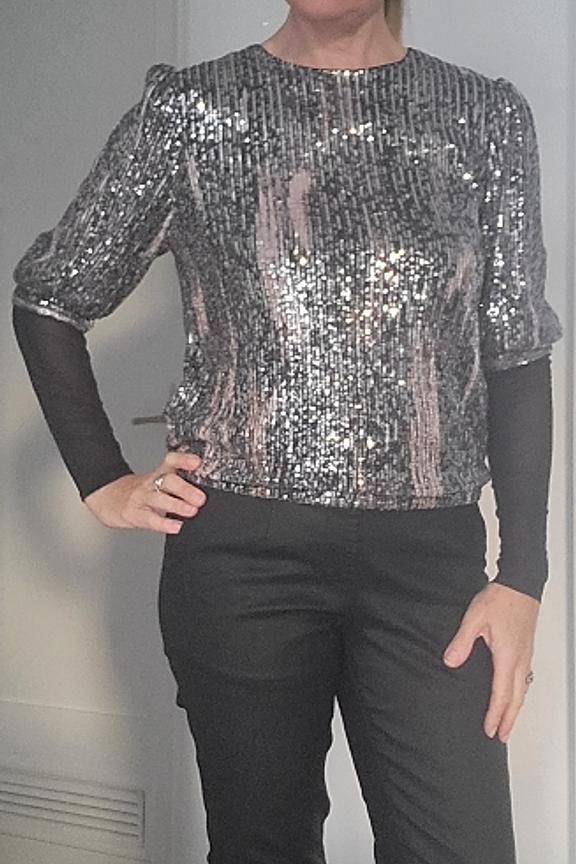 Associez ce top scintillant ร un pantalon noir ajustรฉ et des talons pour une allure chic et festive. Parfait pour illuminer vos soirรฉes ! โข Top ร manches courtes โข Sequins argentรฉs et noirs โข รpaules avec รฉpaulettes โข Encolure arrondie โข Ourlet รฉlastiquรฉ
