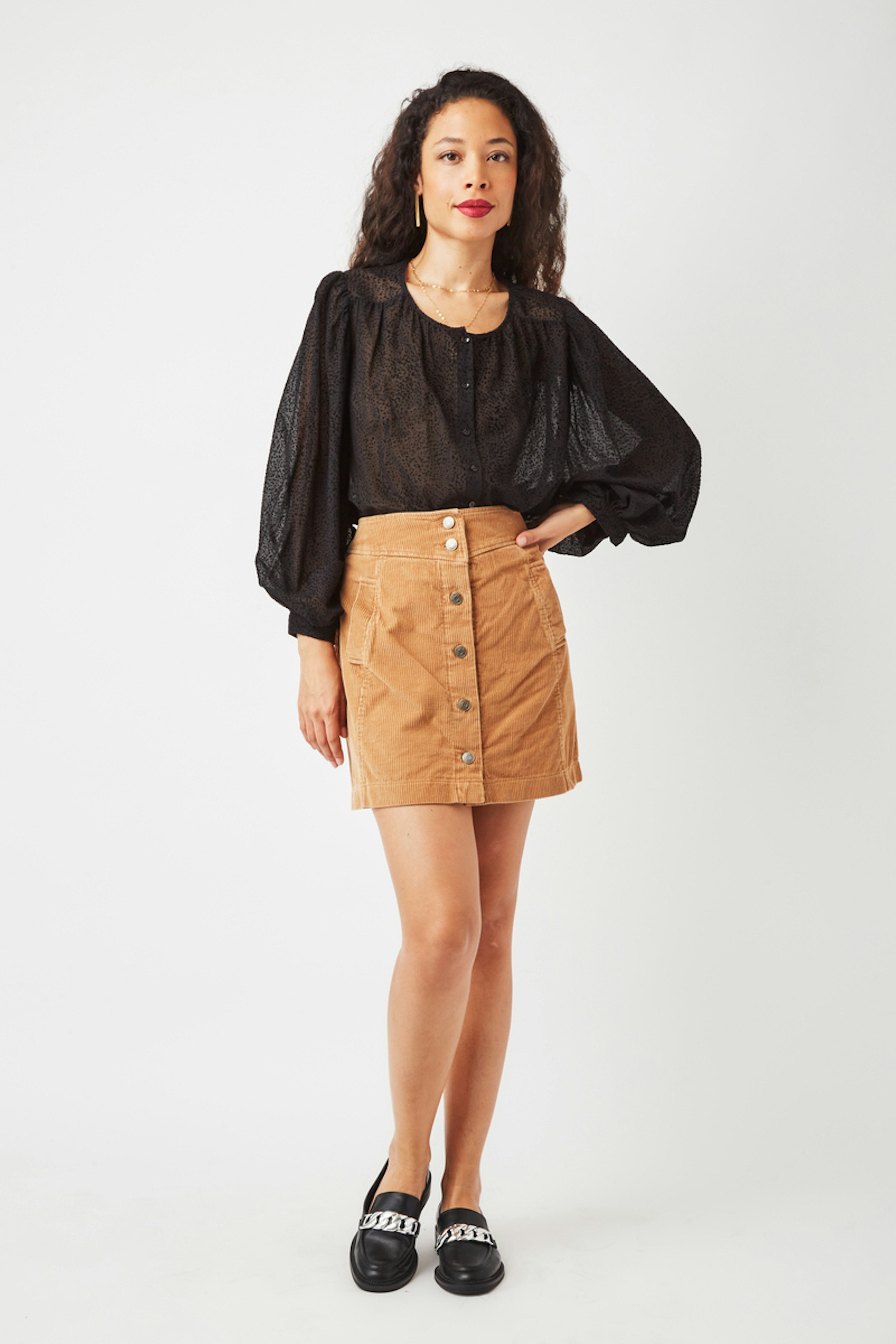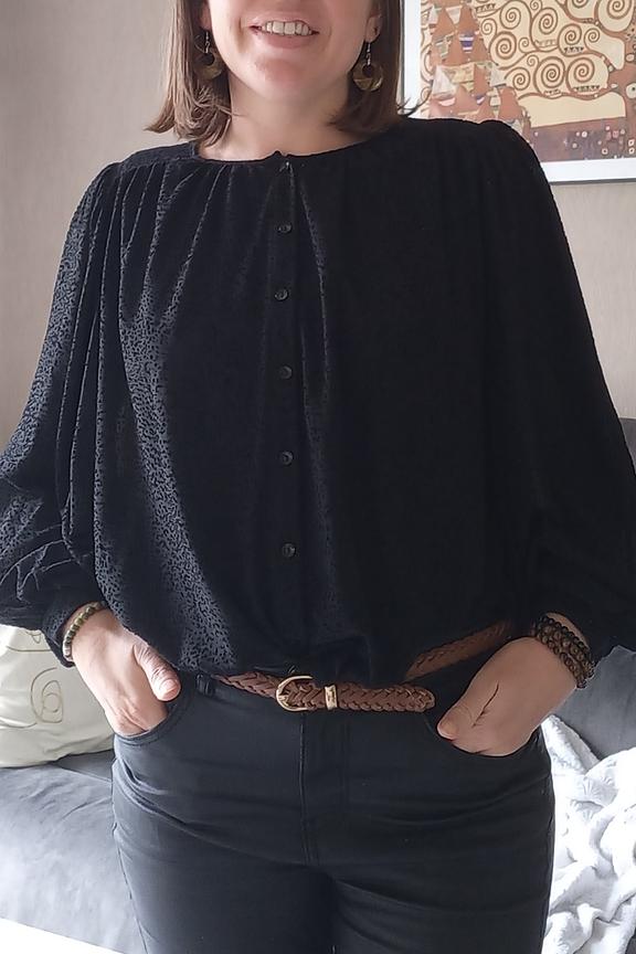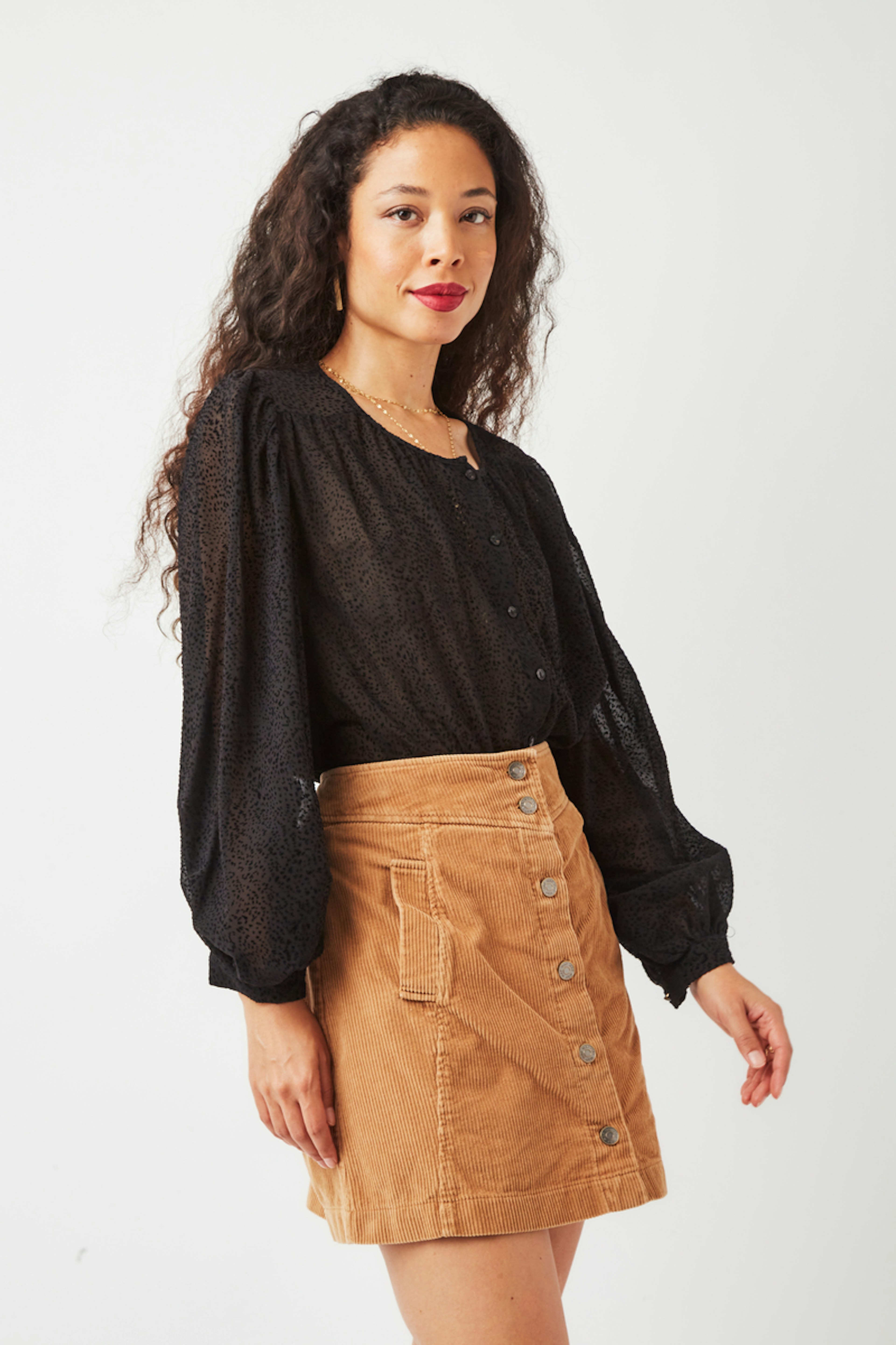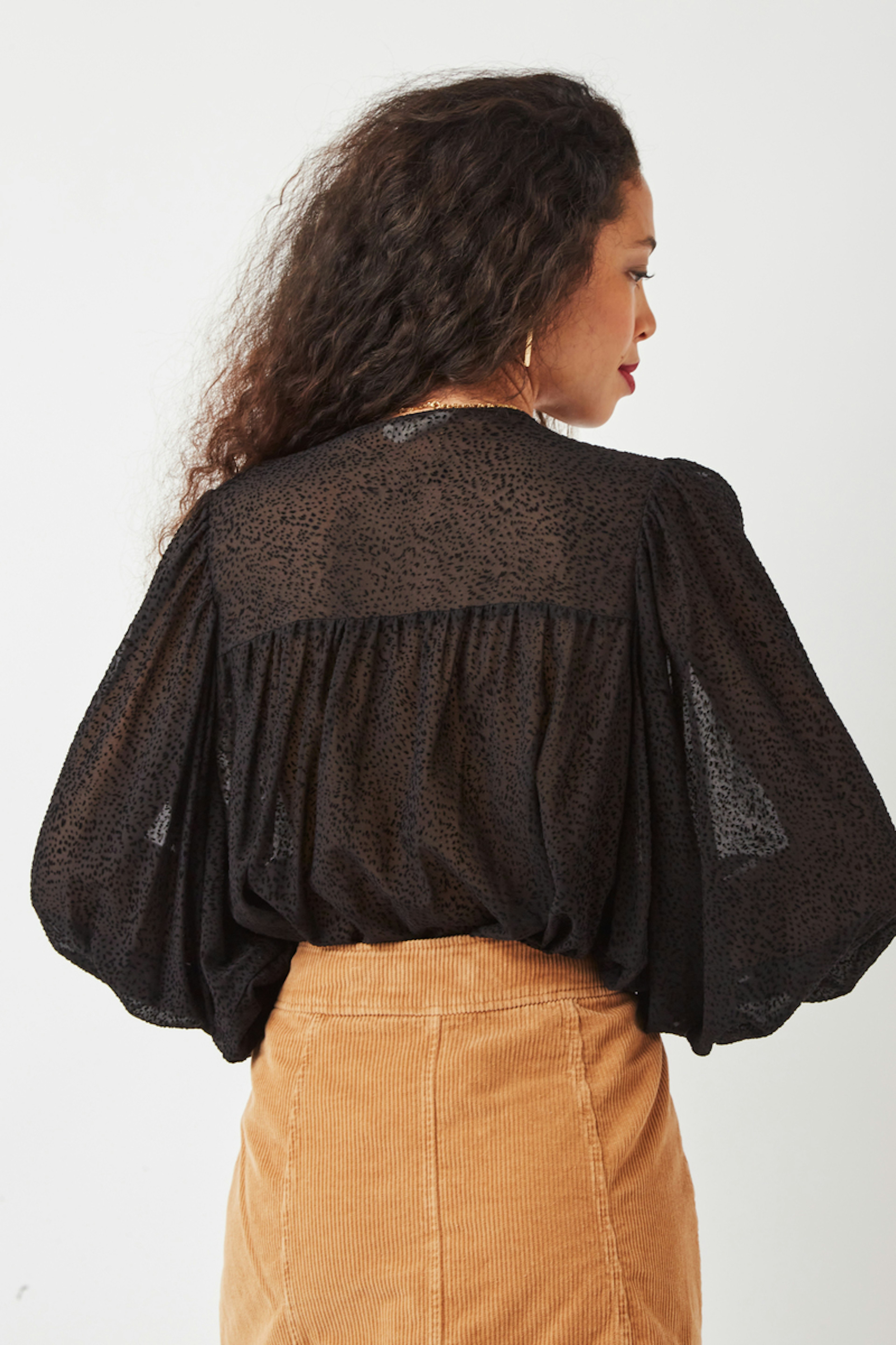 โ€ข Blouse en voile floquรฉ motif animalier noire โ€ข Encolure ronde boutonnรฉe jusquโ€™en bas โ€ข Manches longues ballon et trรจs รฉvasรฉes ร  poignets boutonnรฉs โ€ข Tissu transparent โ€ข Coupe loose