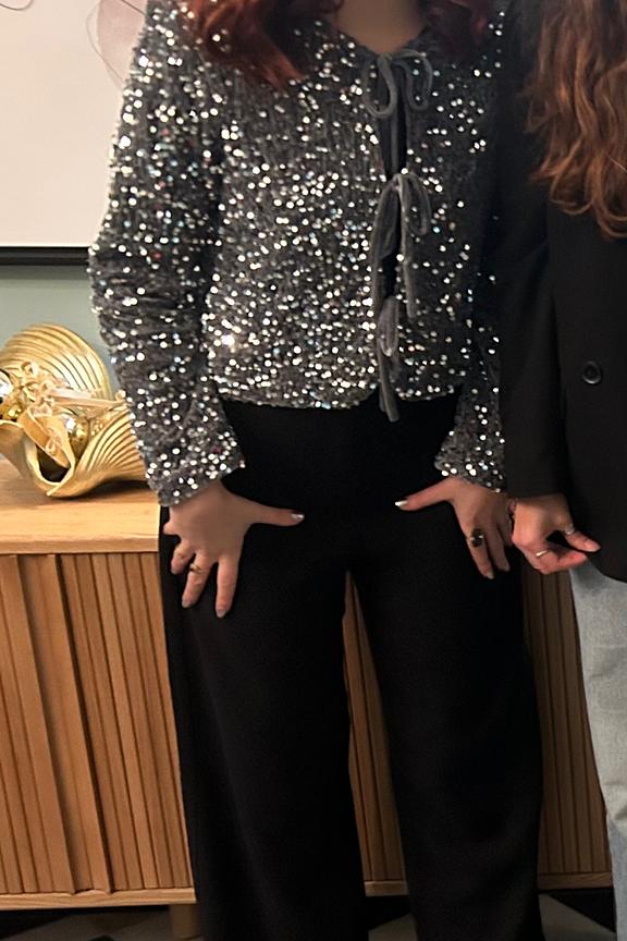 Ajoutez une jupe crayon noire et des escarpins pour un look chic et festif. Idรฉal pour les soirรฉes hivernales. โข Haut ร sequins โข Coupe courte โข Manches longues โข Fermeture ร nลuds โข Effet brillant