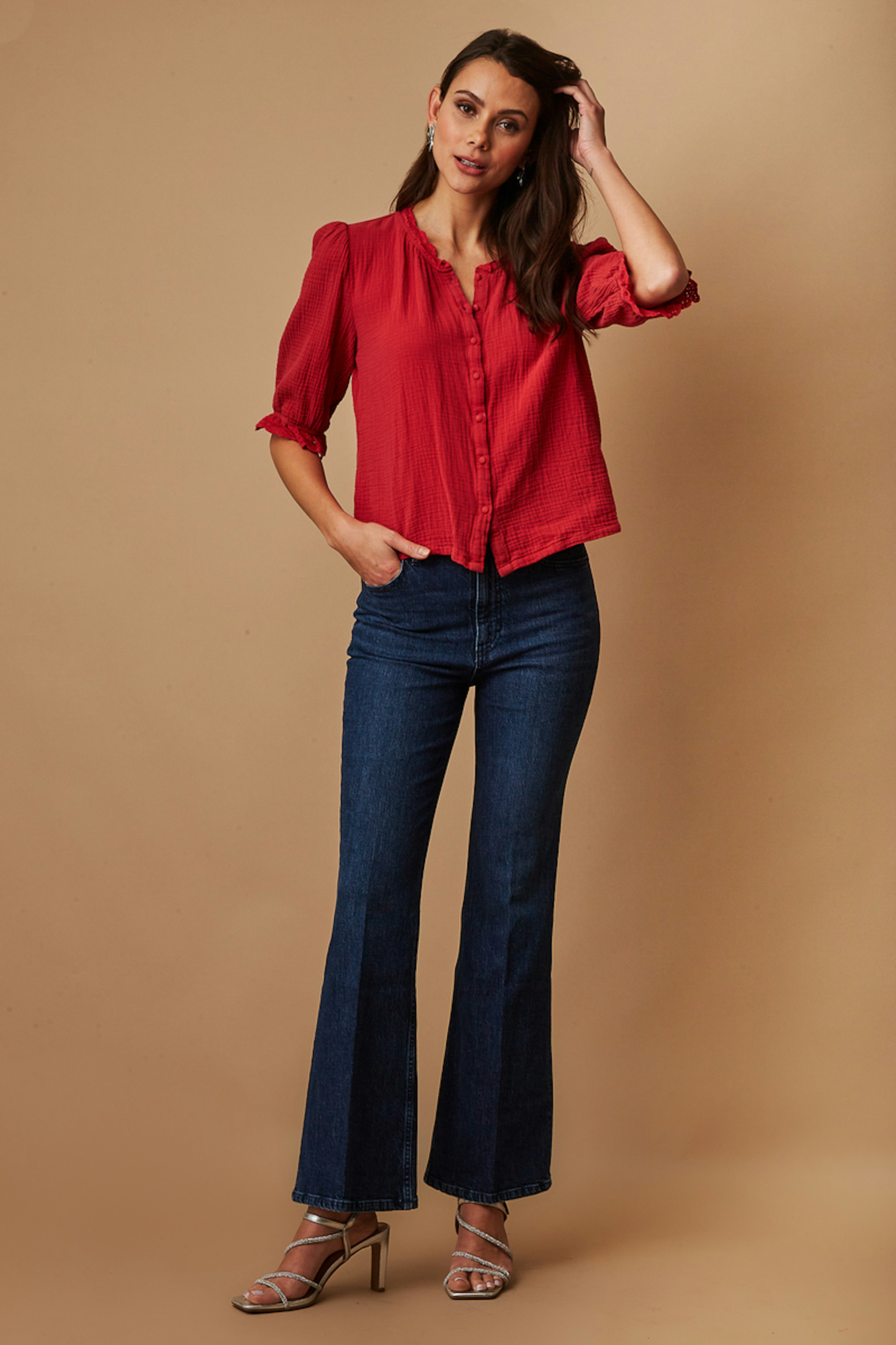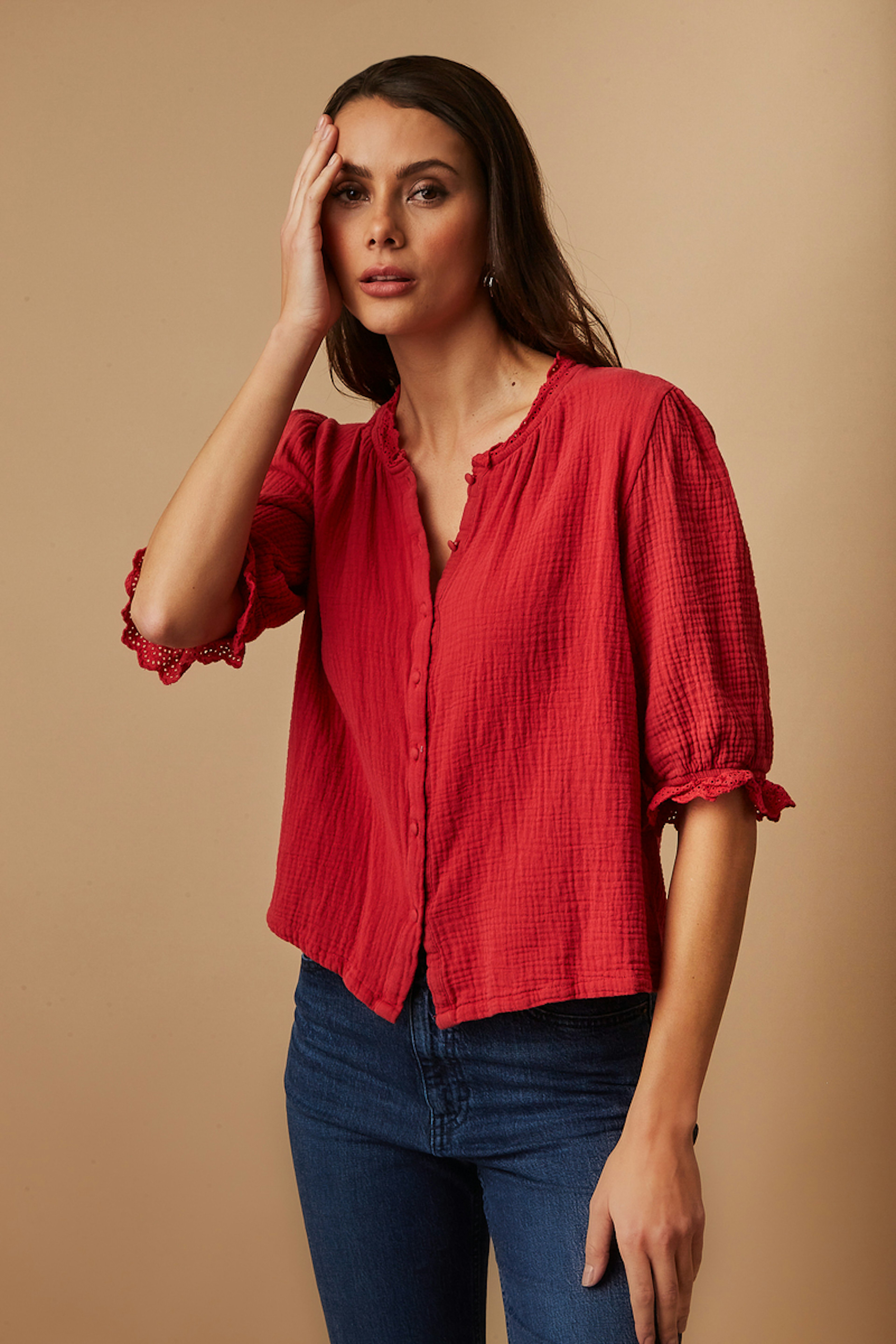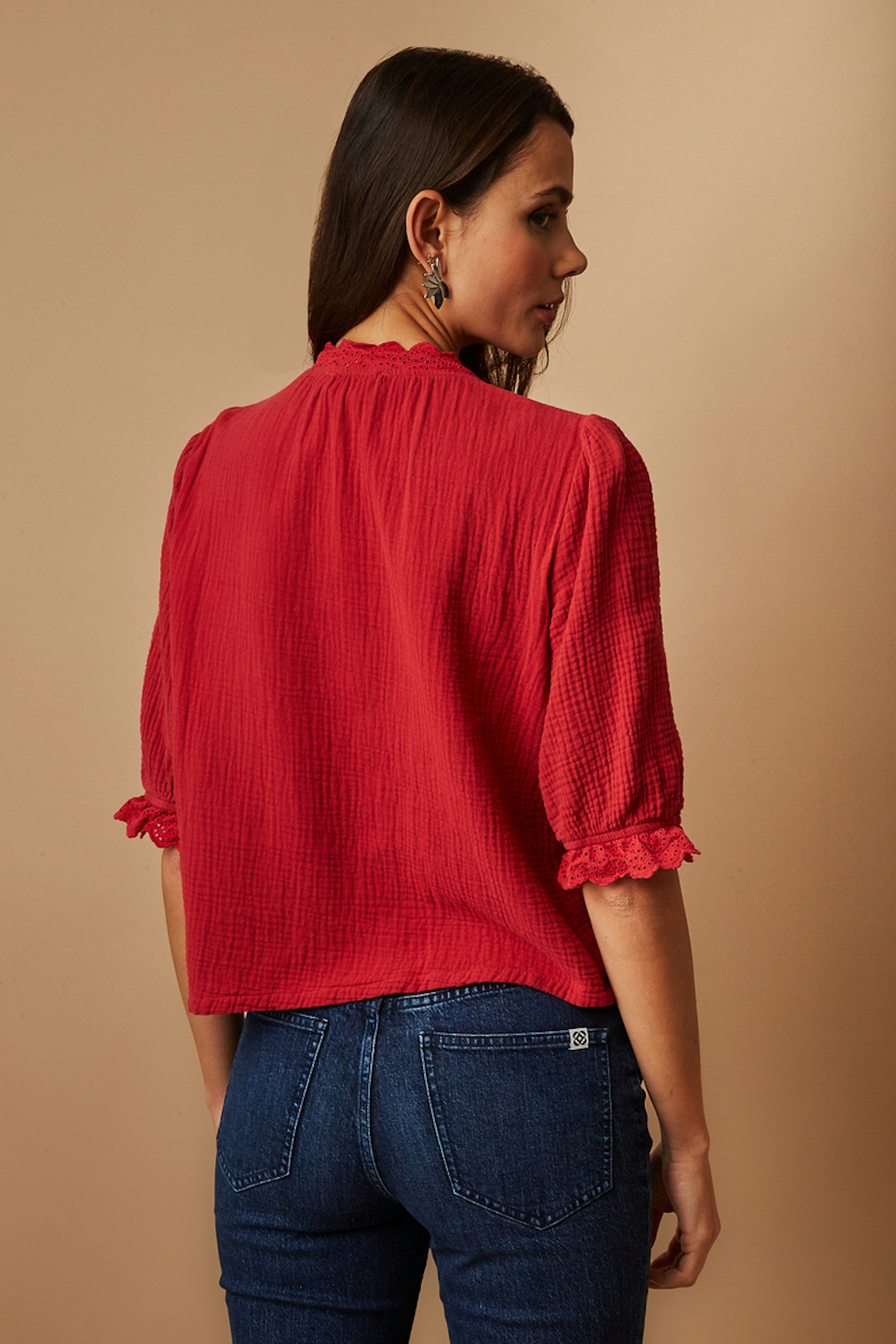 โข Notre blouse en gaz de coton rouge est l'รฉlรฉgance mรชme de notre garde-robe โข Ses manches bouffantes 3/4 avec รฉlastiques aux poignets apportent un cรดtรฉ chic et bohรจme ร cette piรจce iconique G&M โข Les dรฉtails de dentelles aux poignets et ร l'encolure ajoutent un cรดtรฉ raffinรฉ ร votre look โข La coupe classique ajoutรฉ ร la patte de boutonnage ajoutent du professionnalisme ร votre tenue