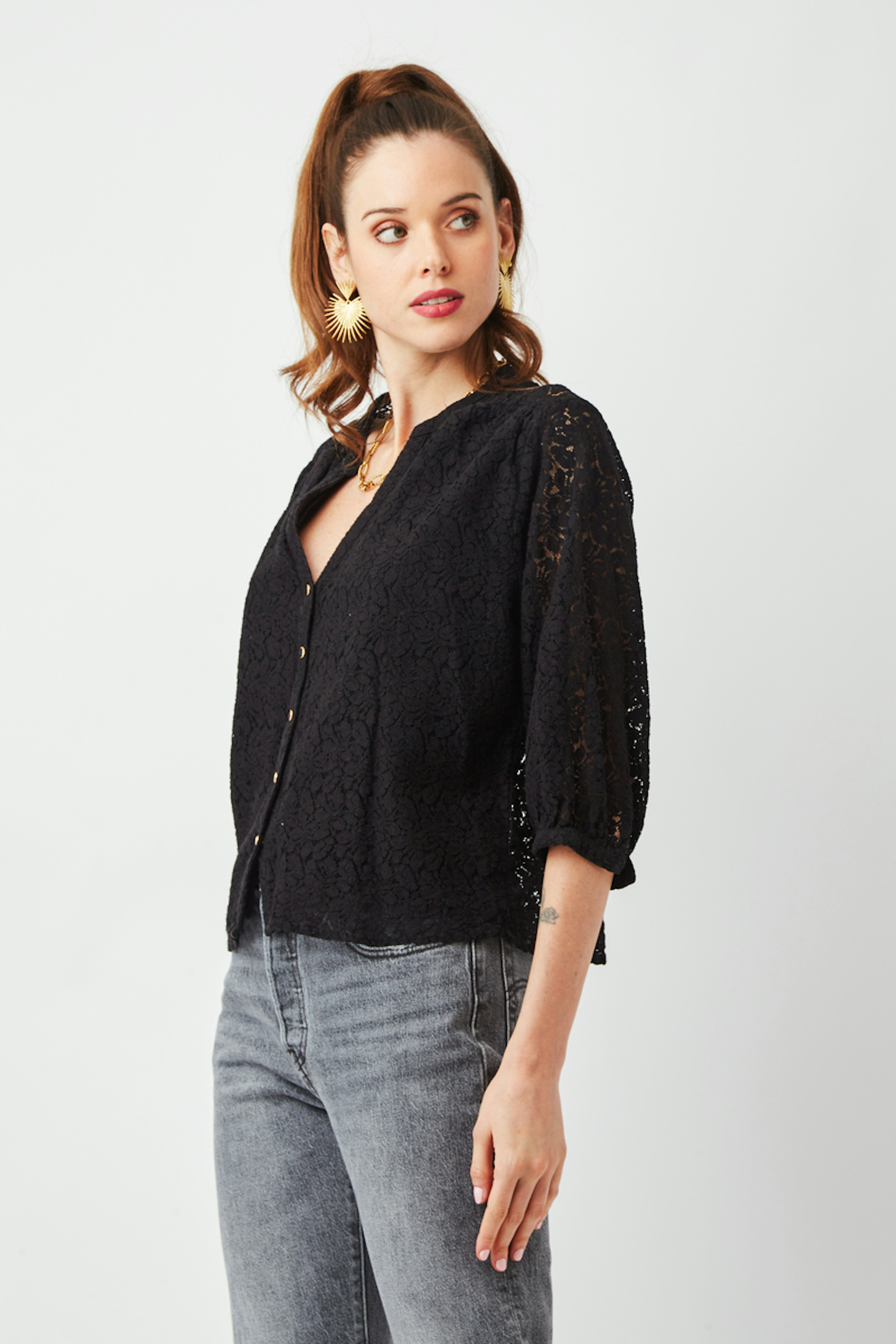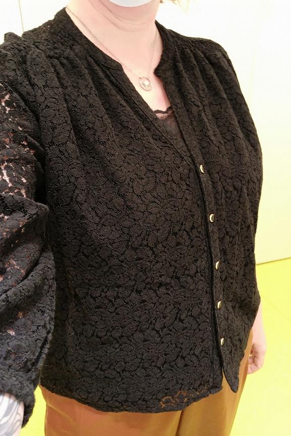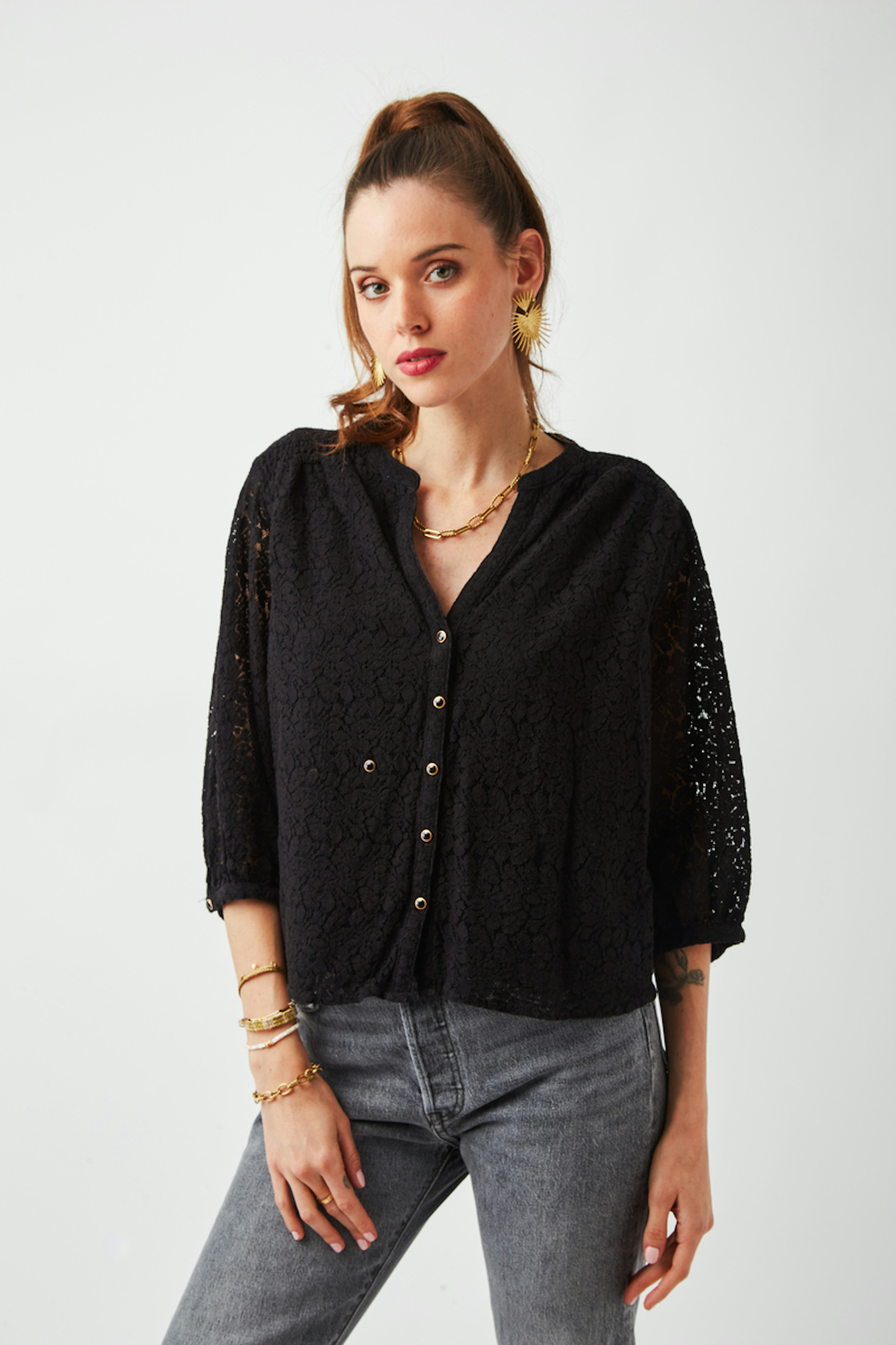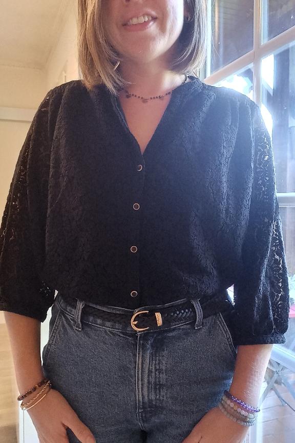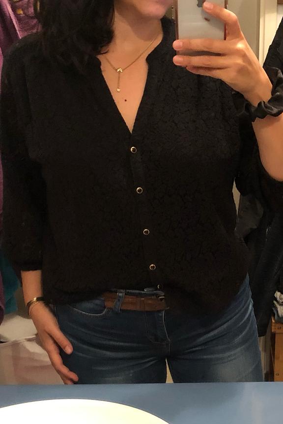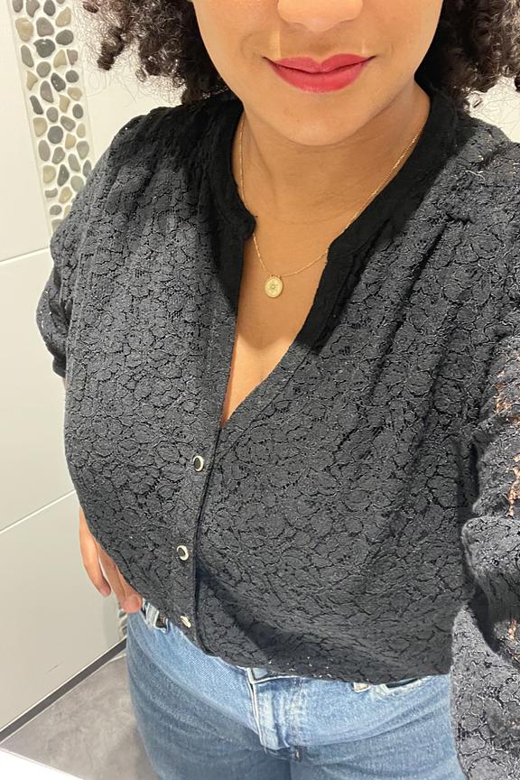 โ€ข Blouse noire ร  dentelle โ€ข Dentelle dans tout le dos et au niveau des manches โ€ข Manches 3/4 โ€ข Encolure en V avec boutons