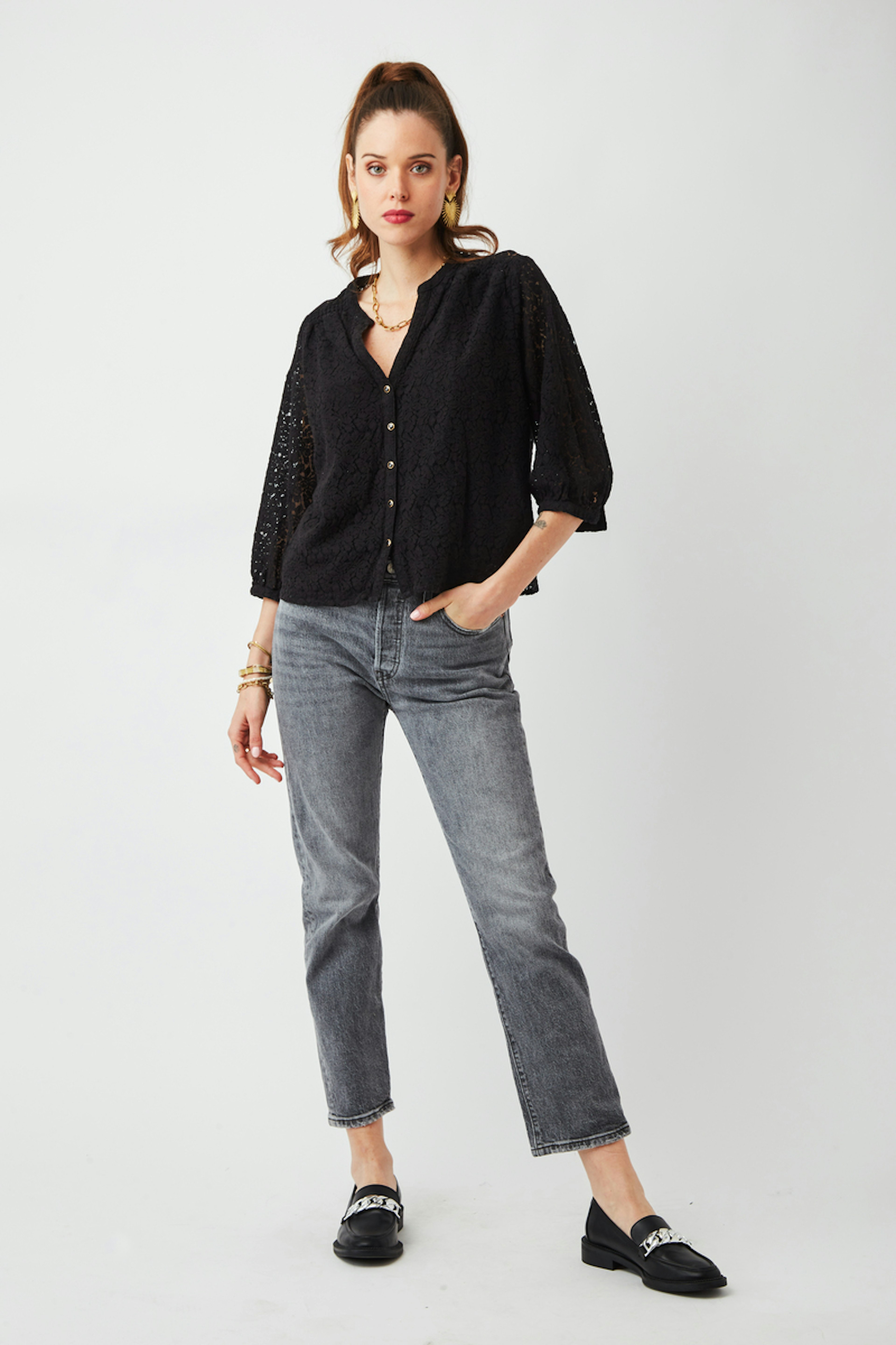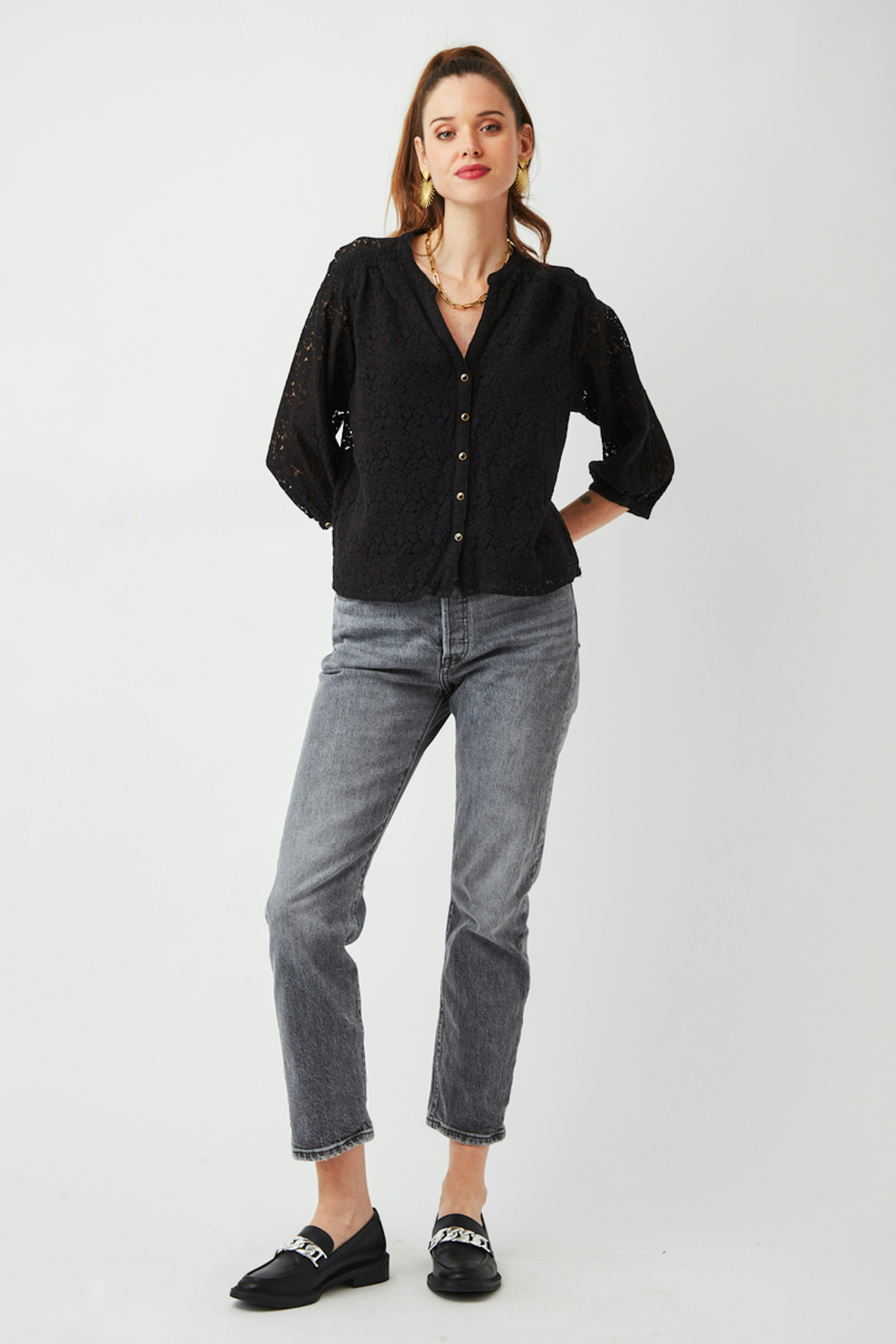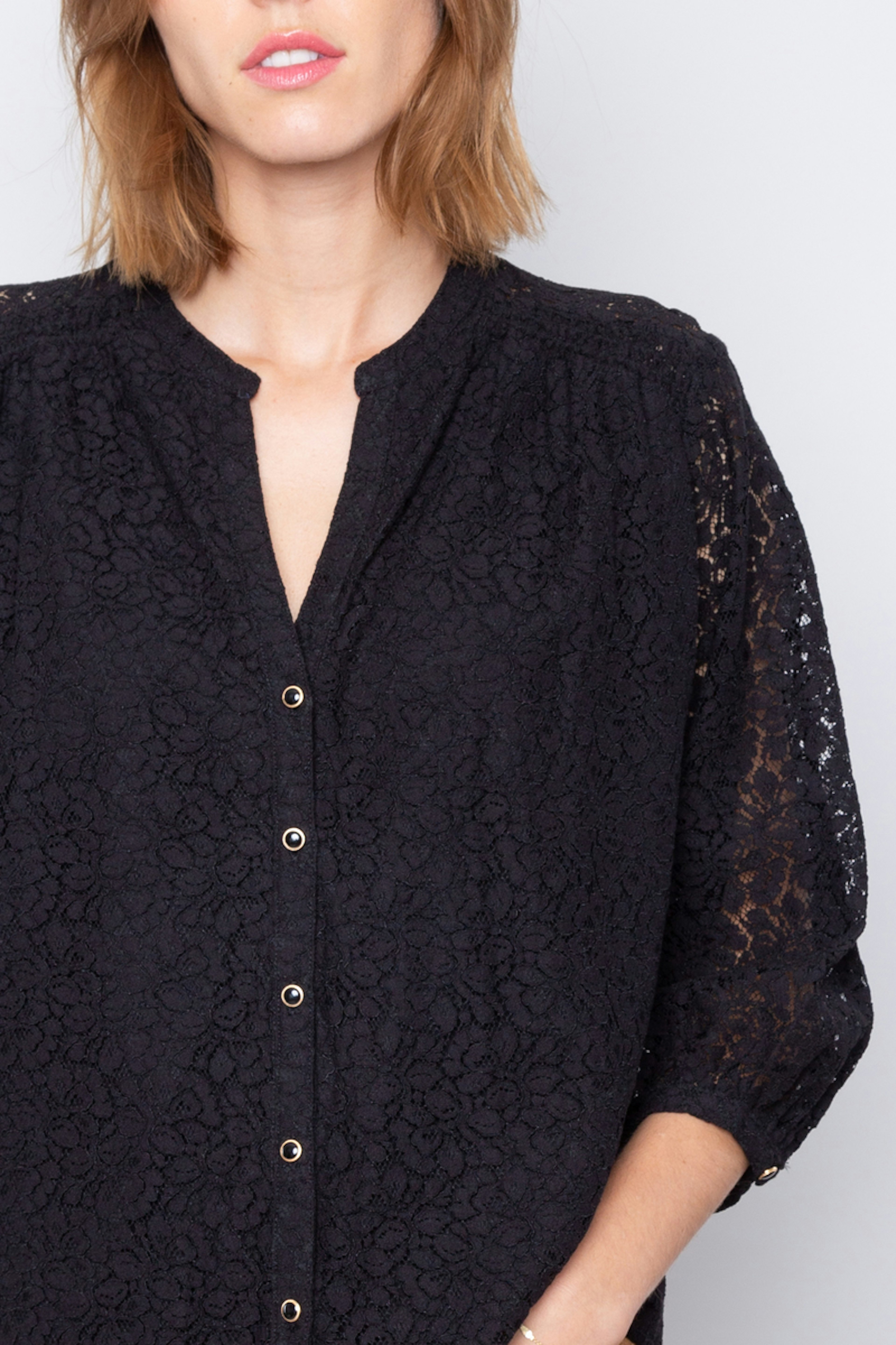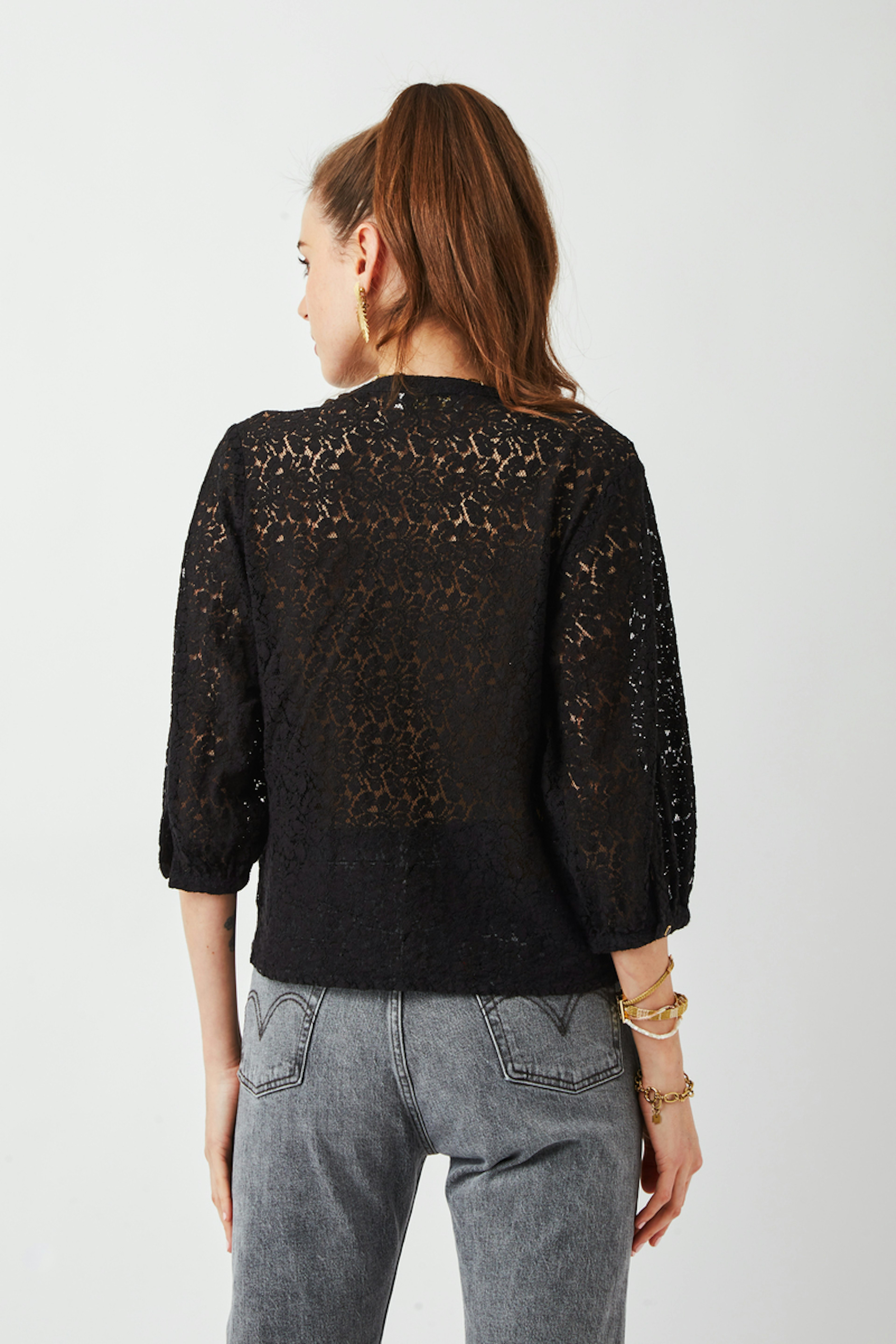 โ€ข Blouse noire ร  dentelle โ€ข Dentelle dans tout le dos et au niveau des manches โ€ข Manches 3/4 โ€ข Encolure en V avec boutons