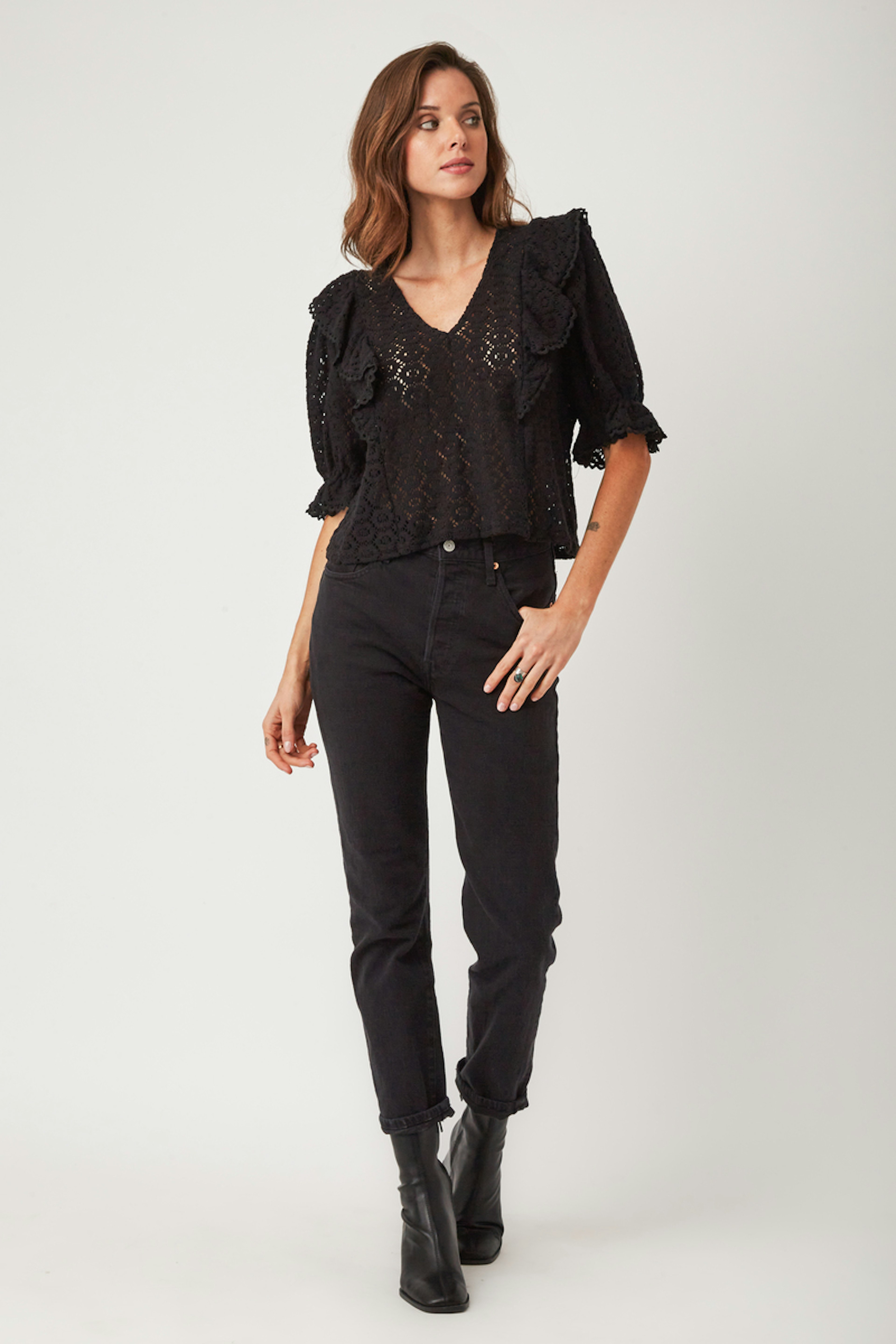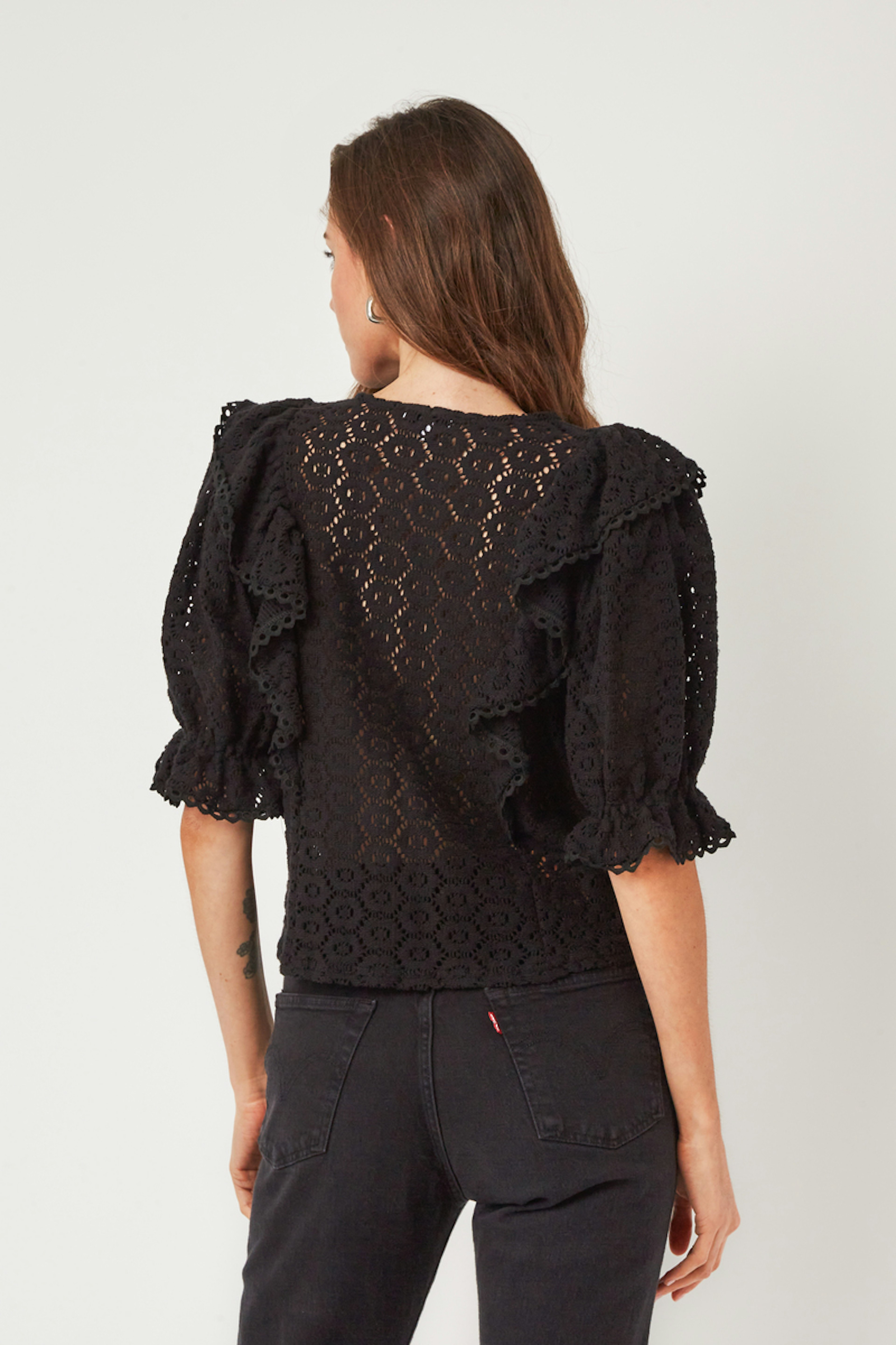 โข Haut Janice โข Manches bouffantes โข Col en V โข Transparent โข Effet maille โข Volants