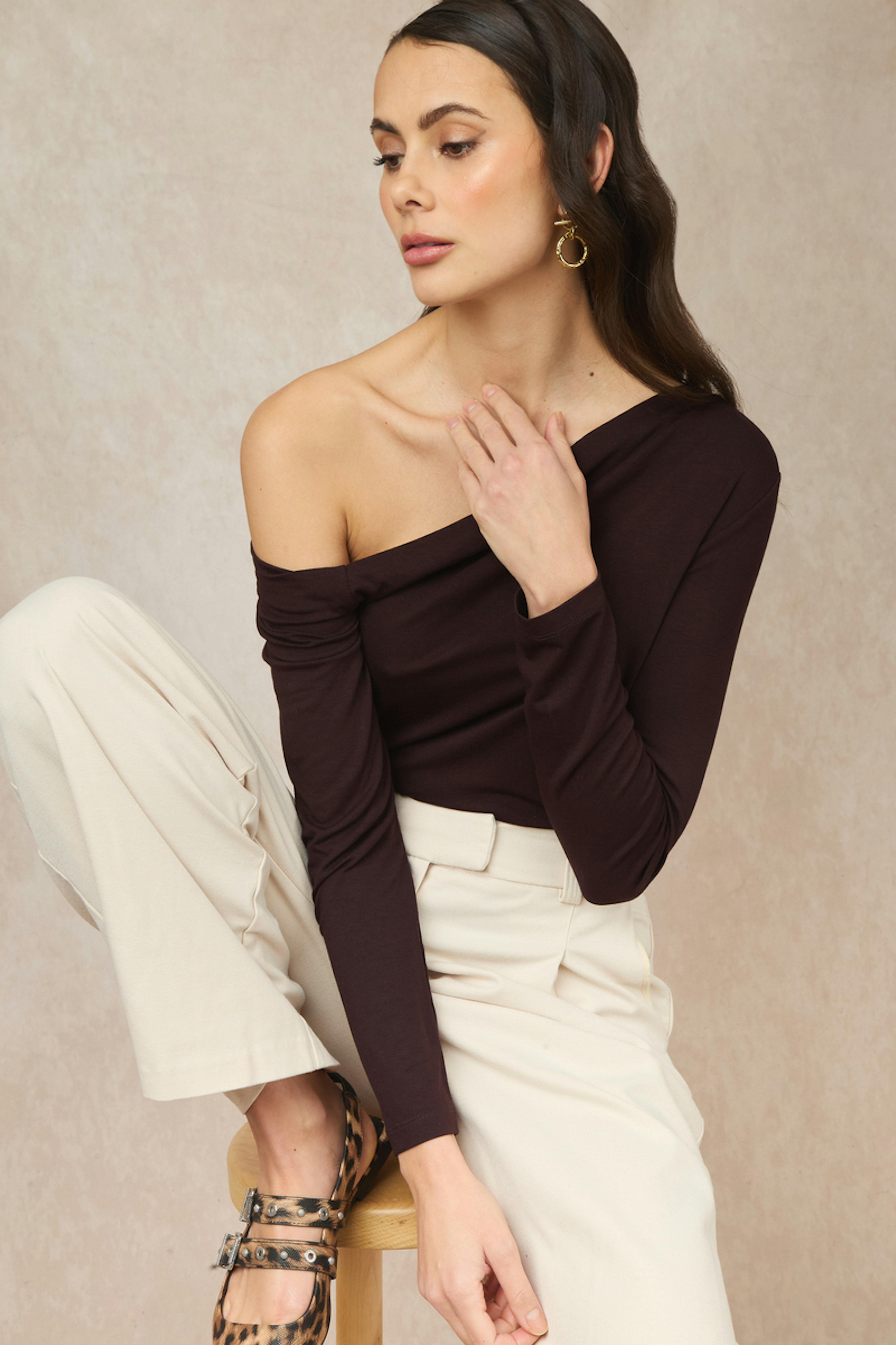 Portez ce top avec un pantalon blanc fluide et des escarpins ร motif lรฉopard pour une allure chic et audacieuse. Parfait en toute saison. โข Top asymรฉtrique โข Manches longues โข รpaule dรฉnudรฉe โข Coupe ajustรฉe โข Couleur marron