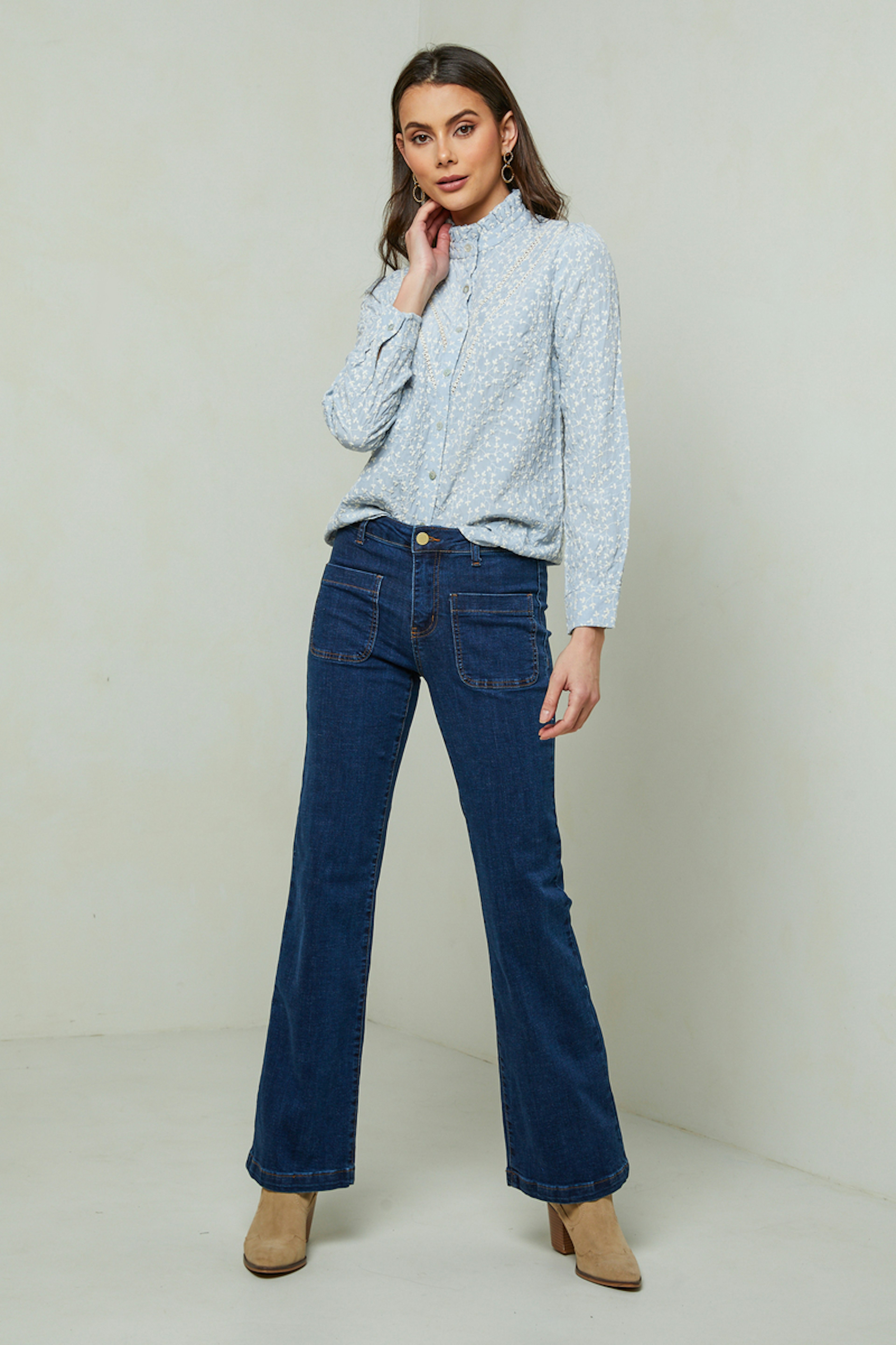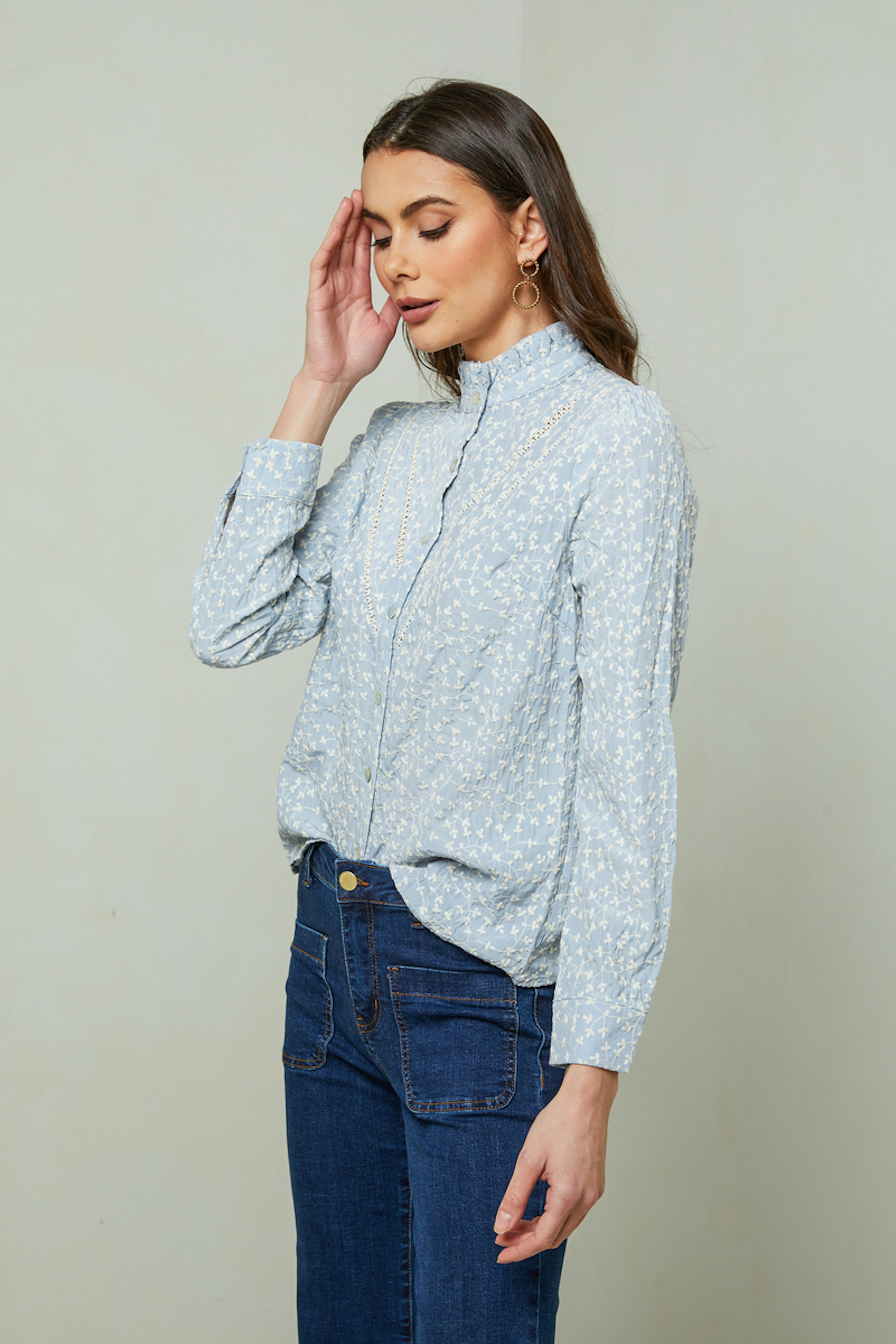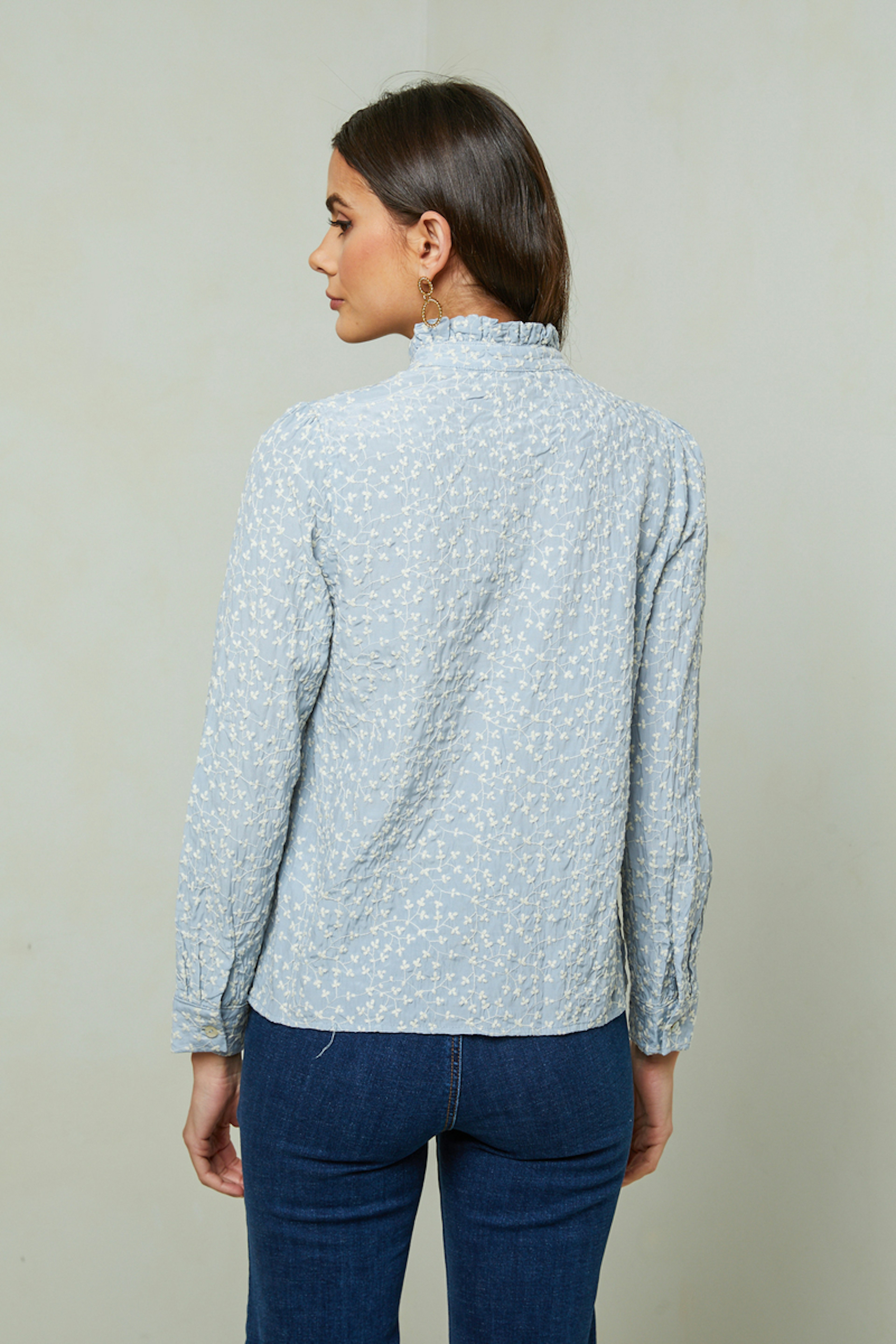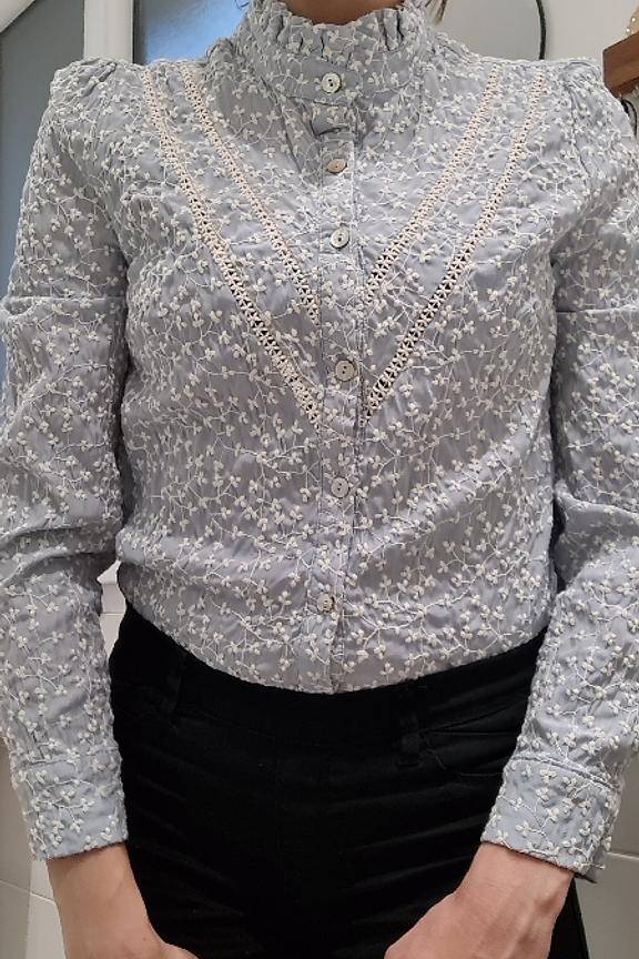 - Blouse en coton mรฉlangรฉ - Col plissรฉ - Broderie fleurs - Passementeries sur le devant - Fermeture par bouton sur le devant - Longueur (taille S) : 61,5cm - Ideal ร porter avec un jean La mannequin mesure 178cm et porte une taille S