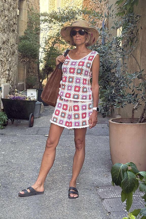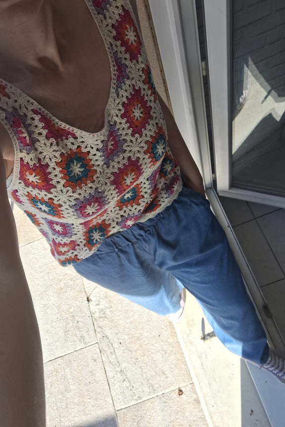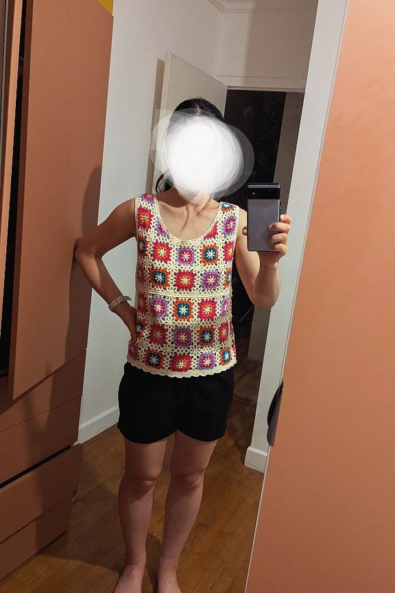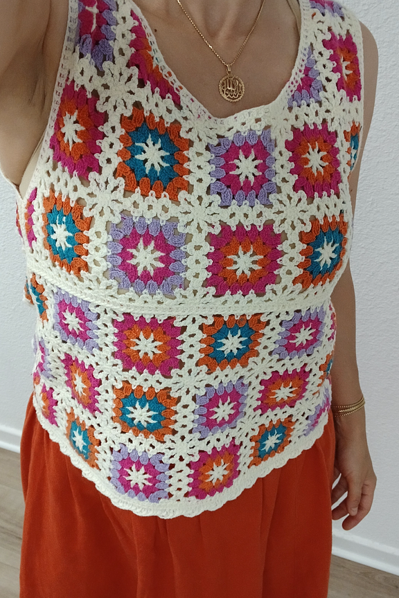 Osez l'originalité avec ce top en crochet coloré! Associez-le à un jean taille haute et des sandales pour un look estival et ludique. • Top en crochet • Coupe sans manches • Col rond • Imprimé géométrique • 100% coton