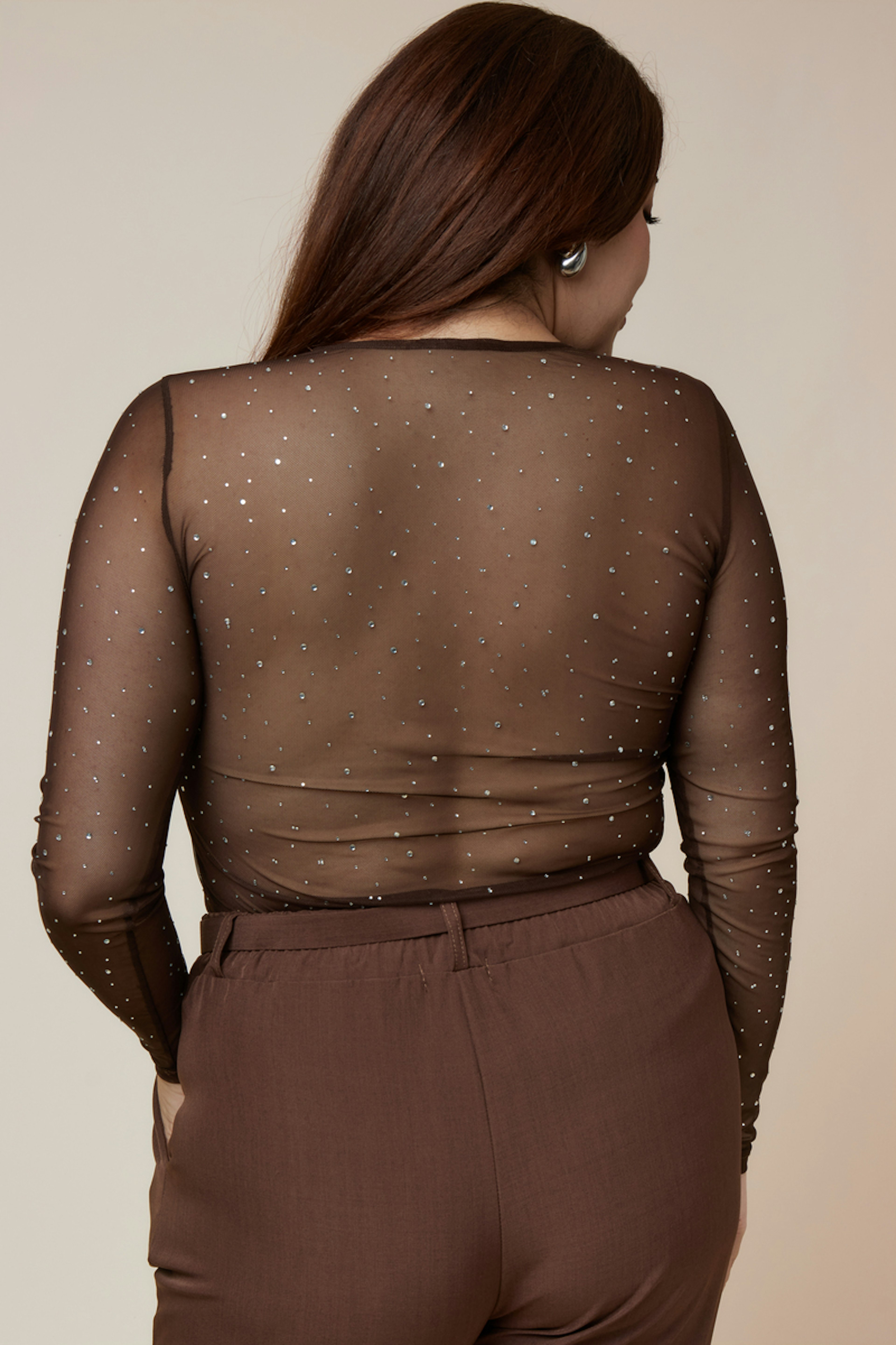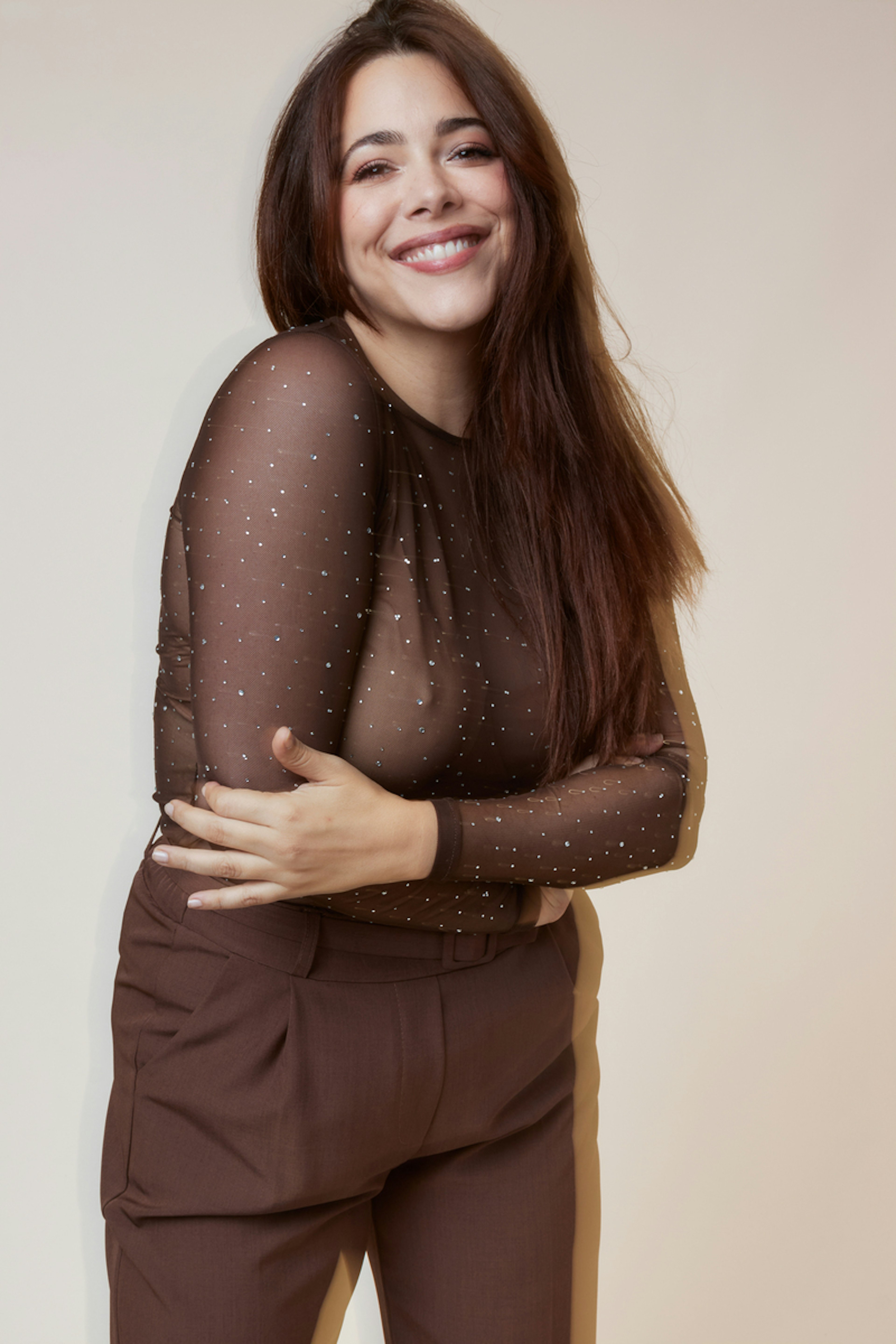 Associez ce haut transparent à des accessoires dorés et un pantalon cigarette pour une allure chic et sophistiquée. • Haut transparent à pois • Manches longues • Coupe ajustée • Encolure ronde • Imprimé à pois