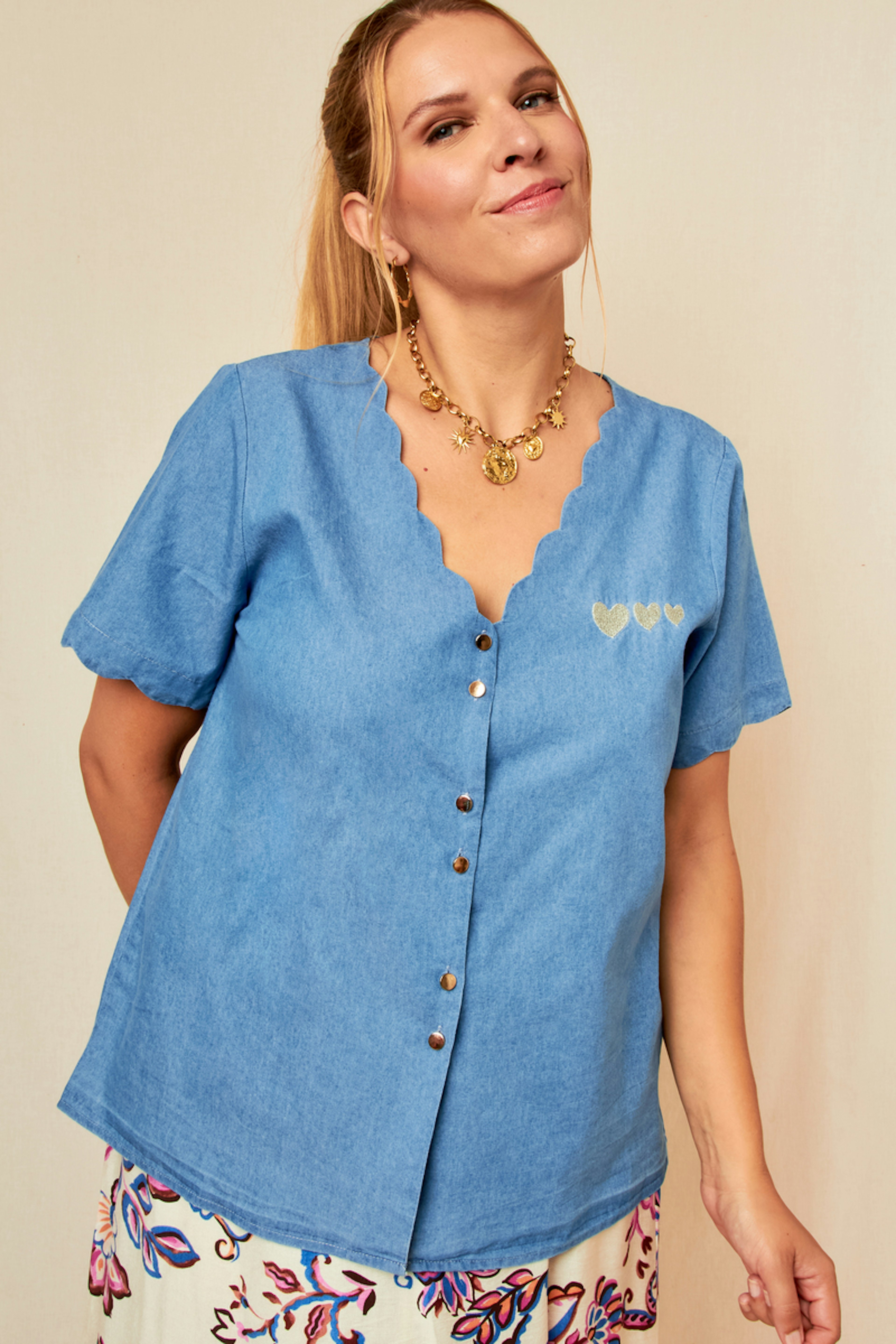 Portez ce top avec un short blanc et des sandales dorées pour une allure chic et décontractée en plein été. • Chemise en coton • Col en V festonné • Manches courtes • Fermeture boutonnée • Motif cœur sur la poitrine