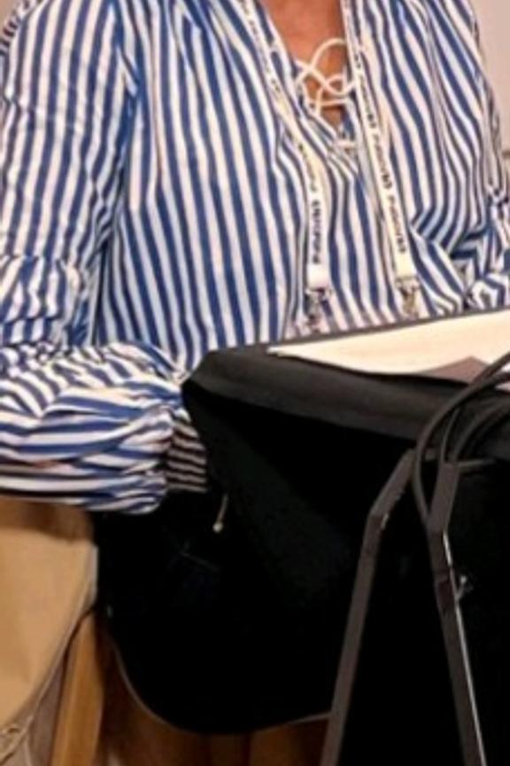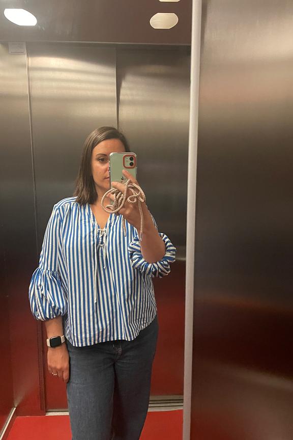 • Top légèrement trapèze, manches ballons aux poignets élastiqués • Tissu en coton rayé bleu et blanc • Encolure V et lacée • Longueur petites hanches.