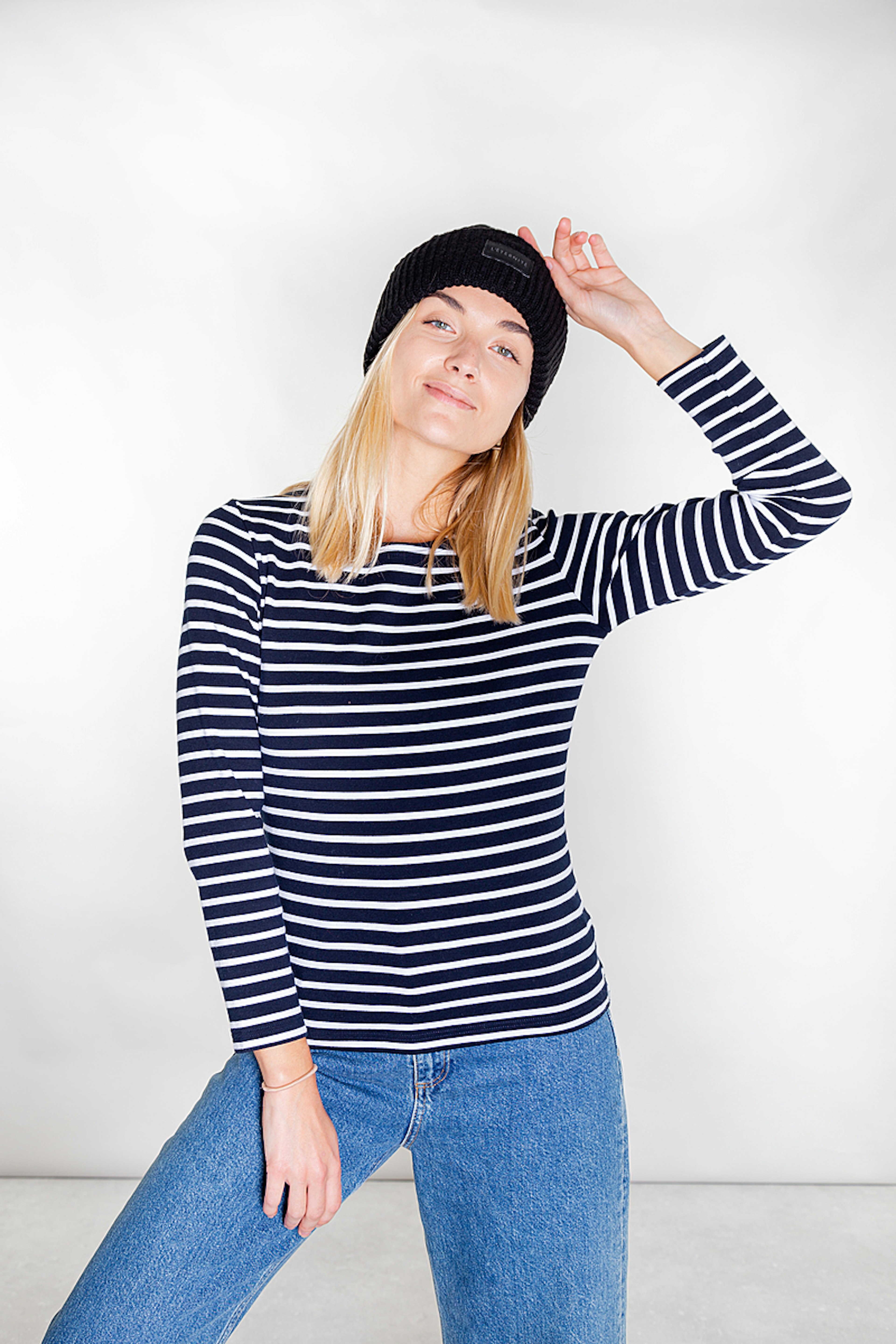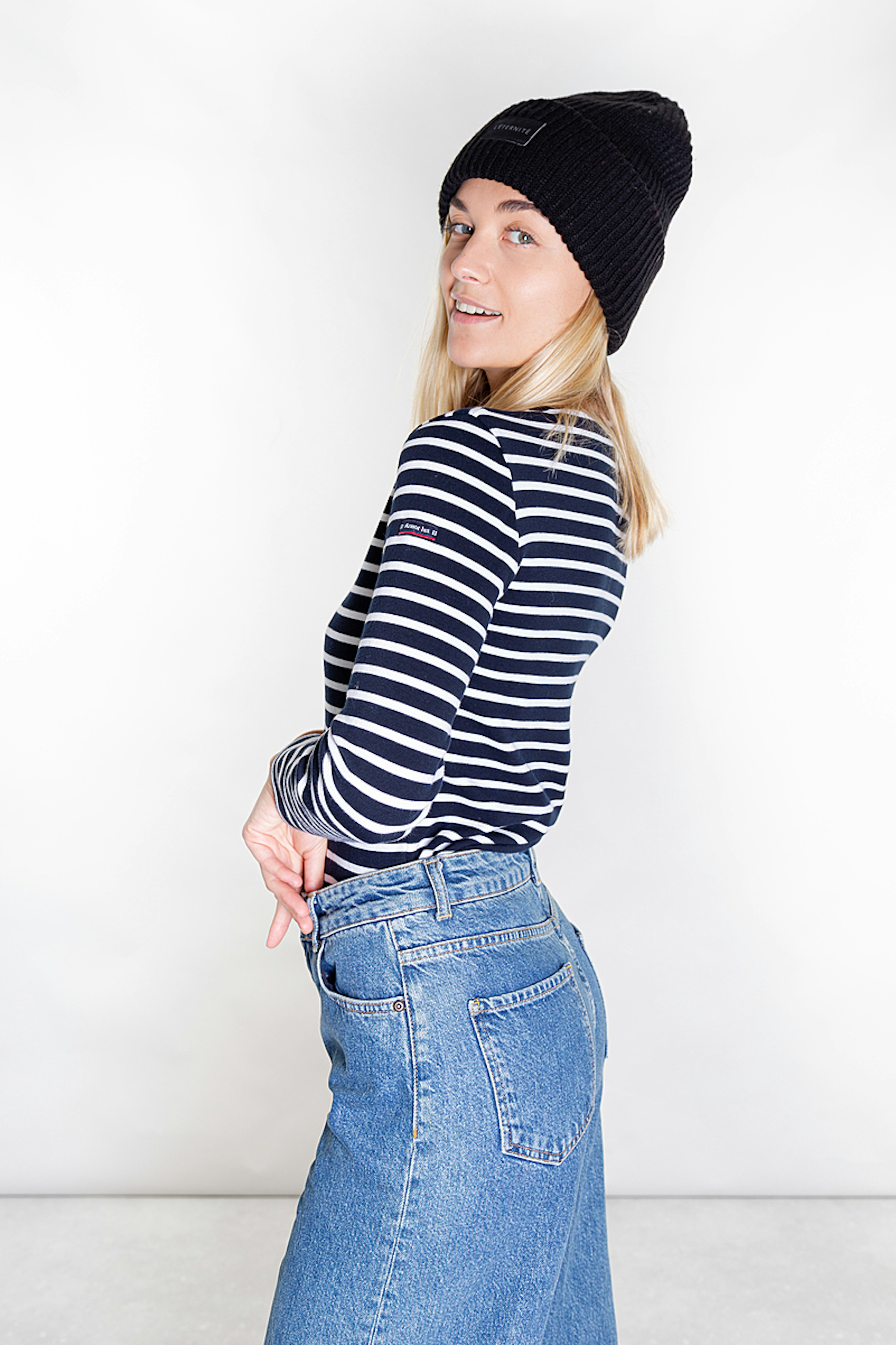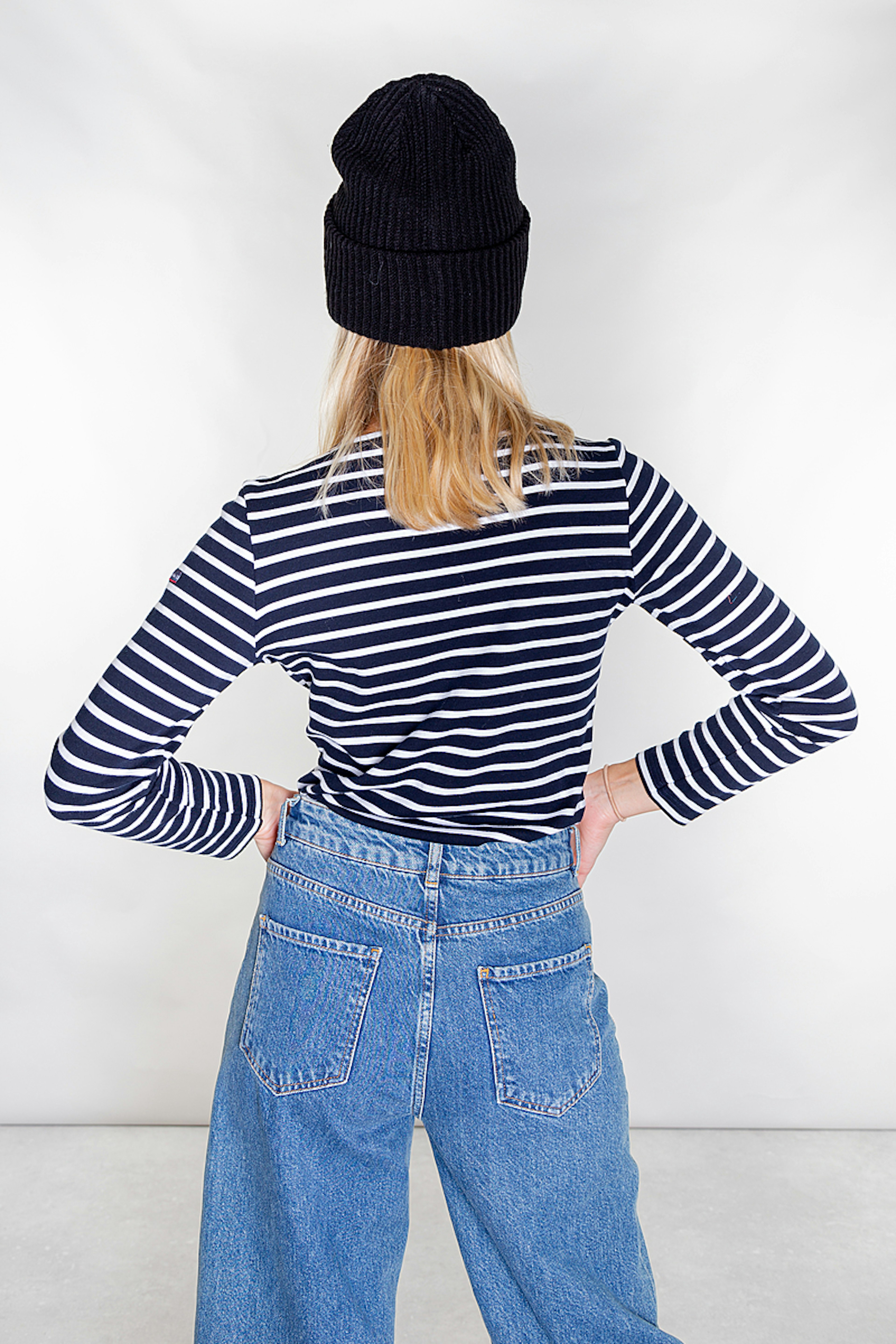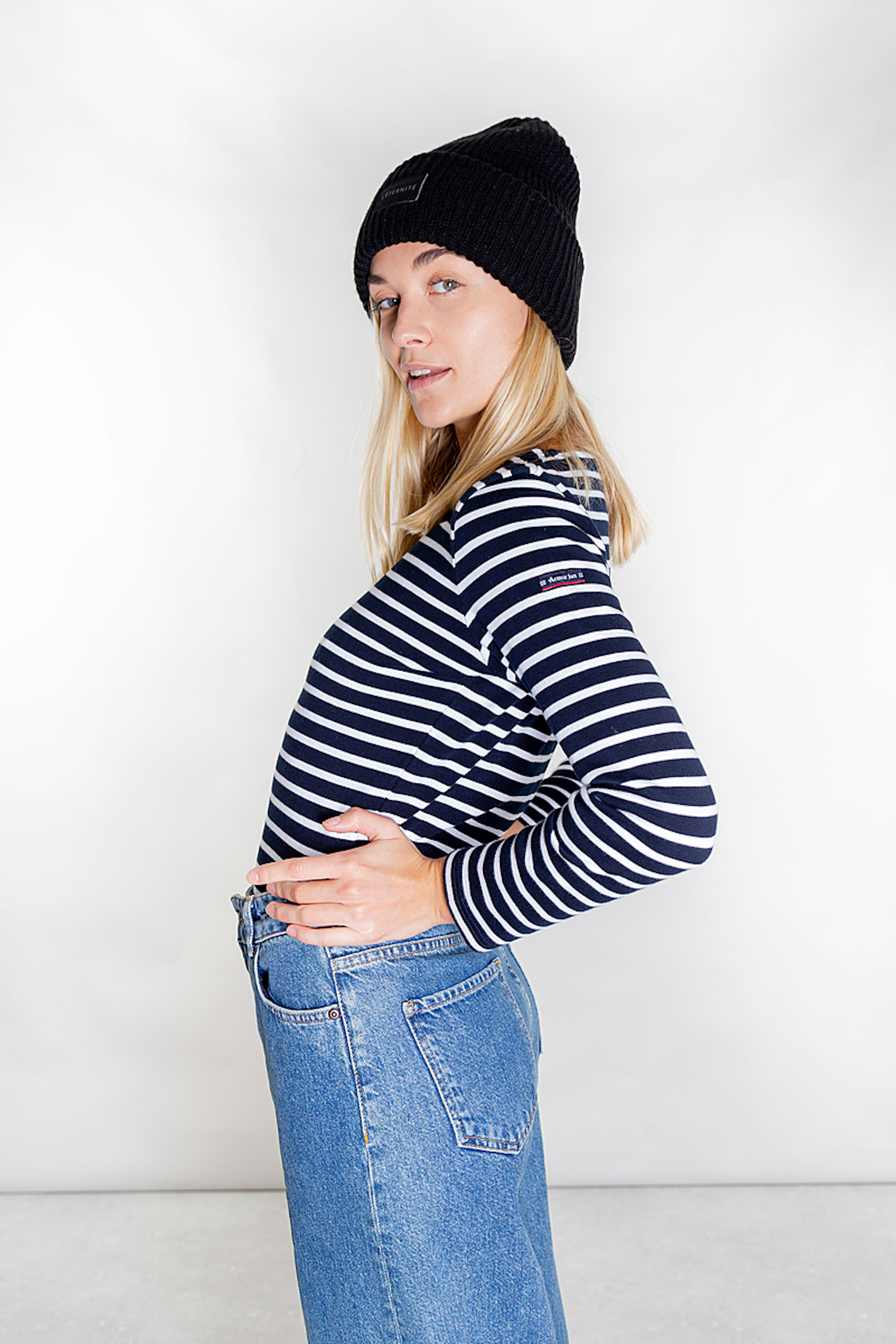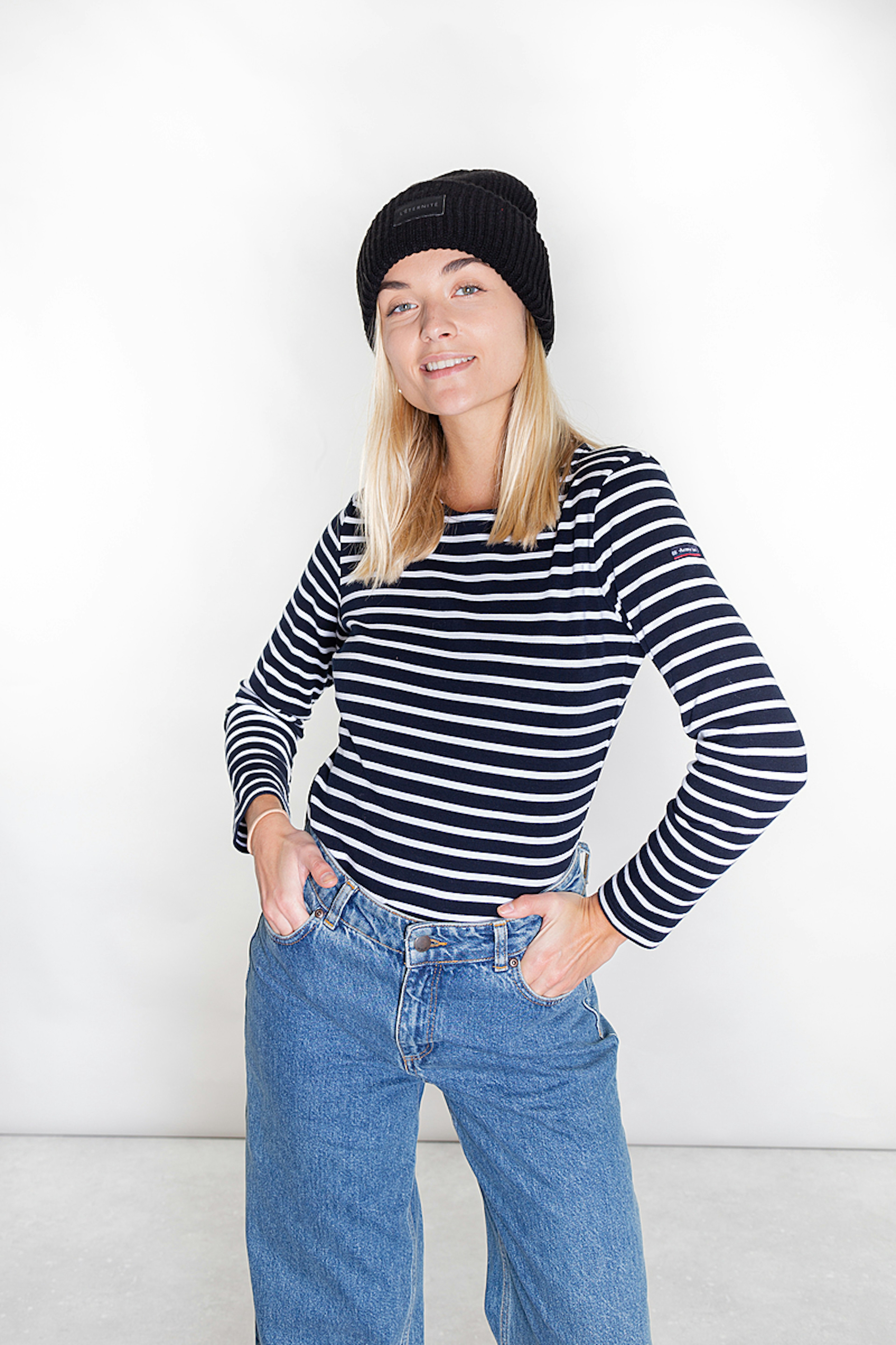 Quoi de plus indispensable quโune mariniรจre ? On a sรฉlectionnรฉ pour vous le modรจle marine et blanc Lesconil. Sa maille en coton ira au plus grand nombre dโentre vous.
