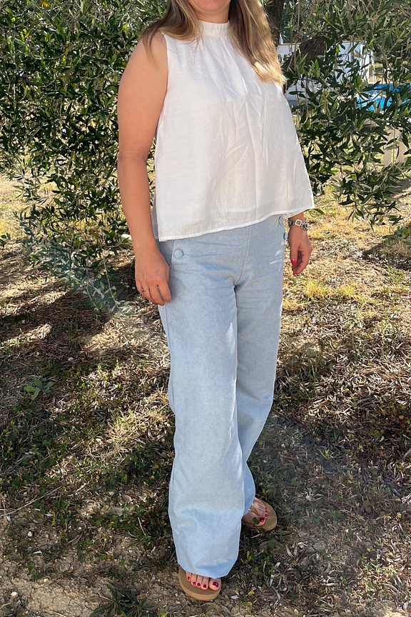 Associez ce haut blanc à un pantalon taille haute pour une allure élégante en été, parfait avec des sandales dorées. • Haut sans manches • Col montant • Coupe fluide • Noeud élégant au cou • Tissu doux et léger