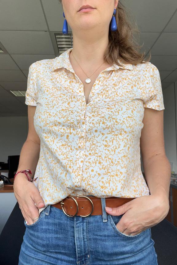 โข Chemise ร la coupe droite, fermรฉe par 8 boutons โข Manches courtes avec emmanchures froncรฉes pour une touche fรฉminine โข Imprimรฉ fleuri dรฉlicat