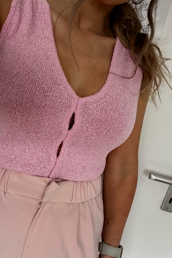 Portez ce top avec un jean taille haute et des sandales pour un look estival décontracté. • Débardeur rose sans manches • Coupe droite flatteuse • Encolure en V élégante • Ourlet légèrement arrondi • Tissu texturé doux