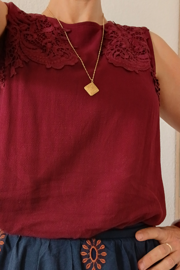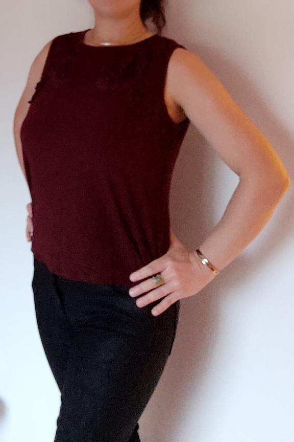 Associez ce top rouge ร un jean taille haute et des sandales dorรฉes pour un look estival raffinรฉ et dรฉcontractรฉ. โข Top sans manches โข Dรฉtails en dentelle โข Col rond โข Coupe fluide โข Tissu lรฉger et confortable