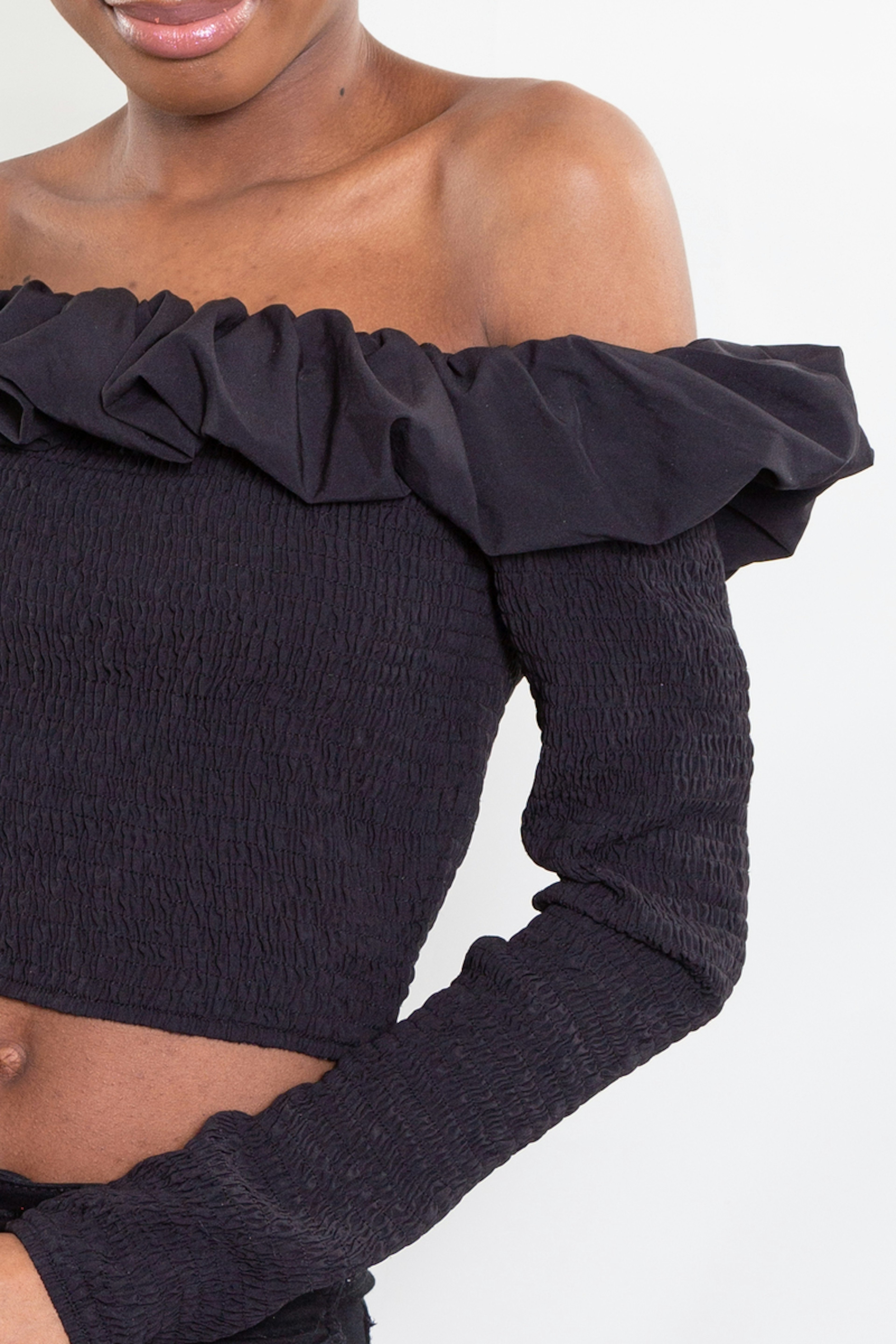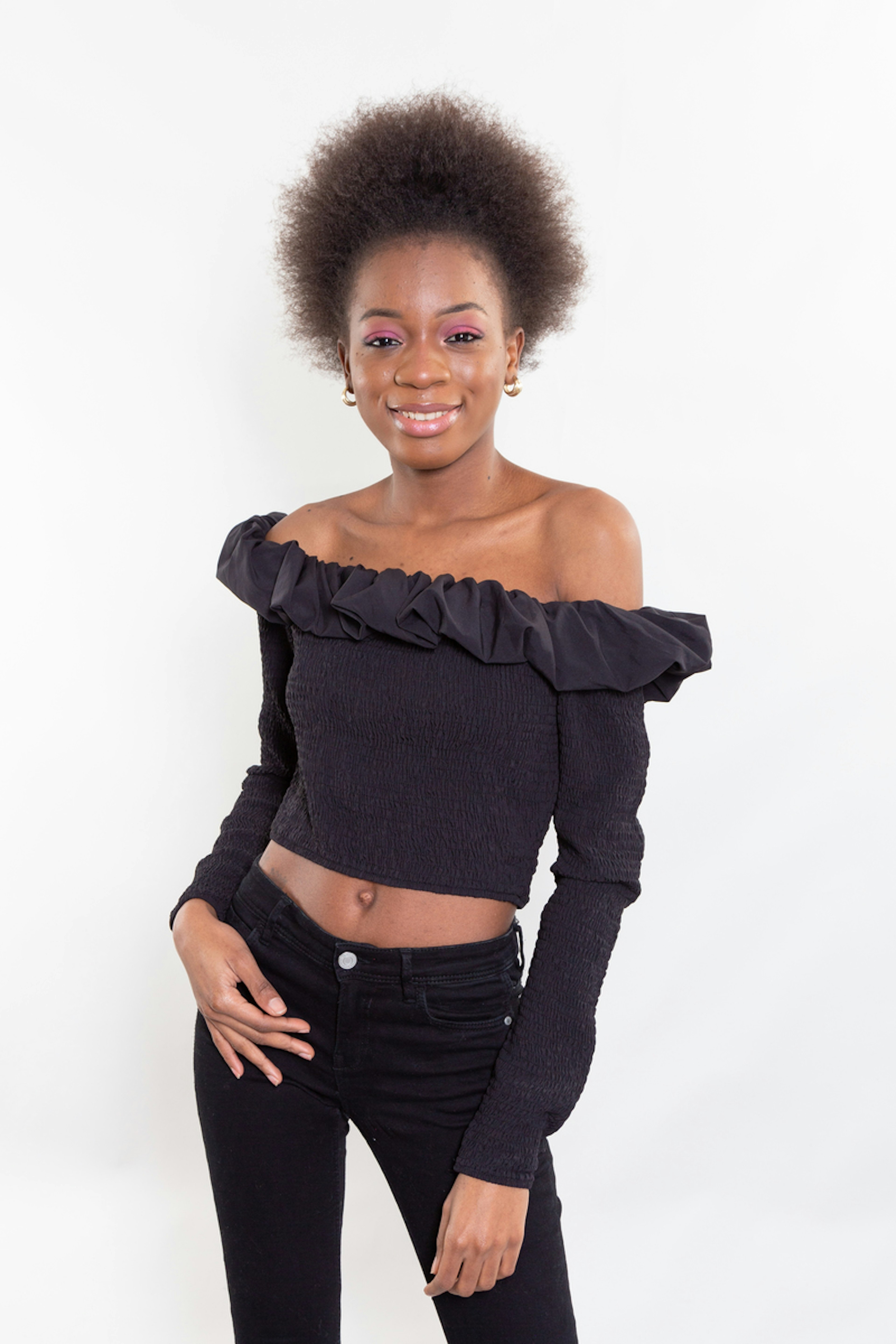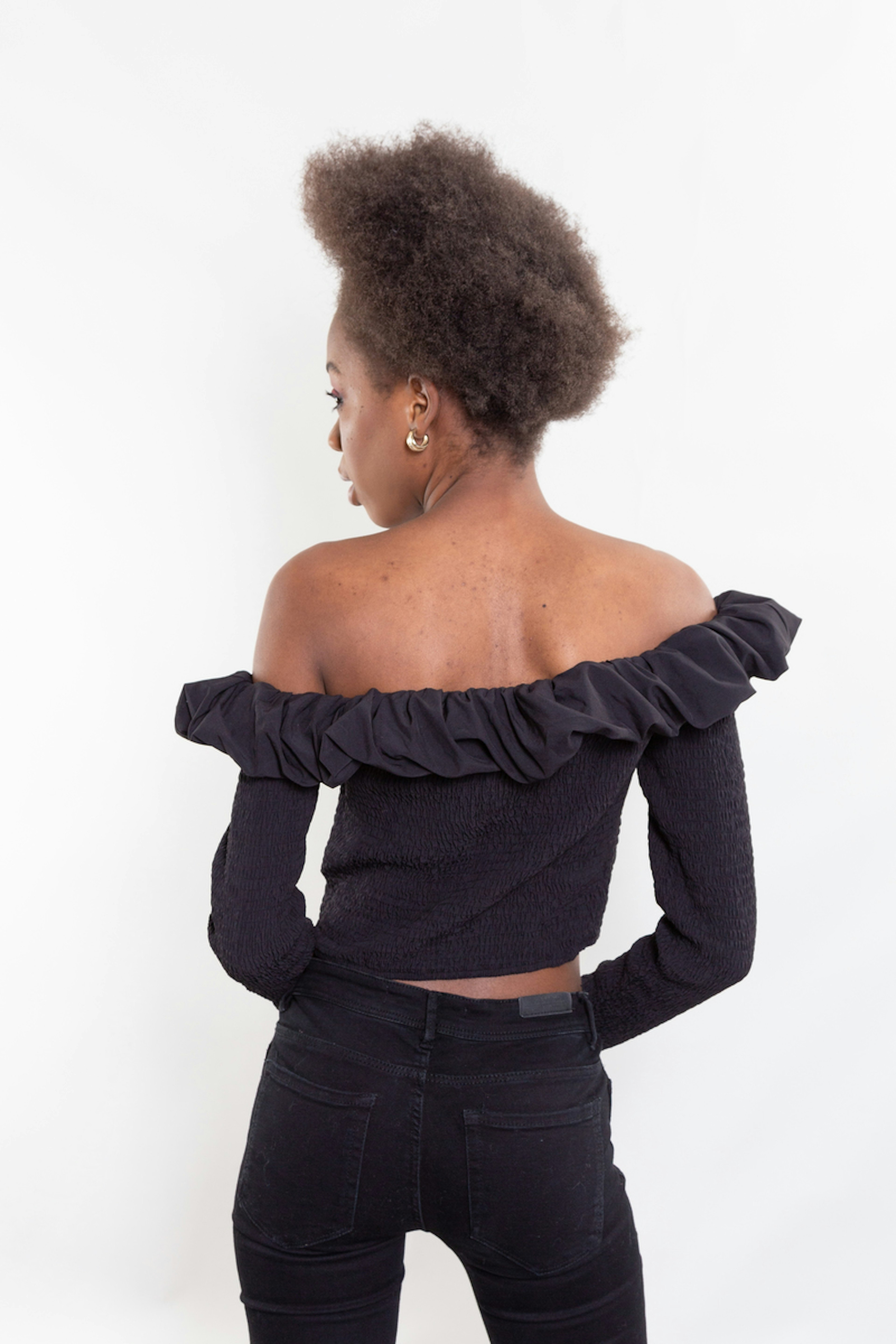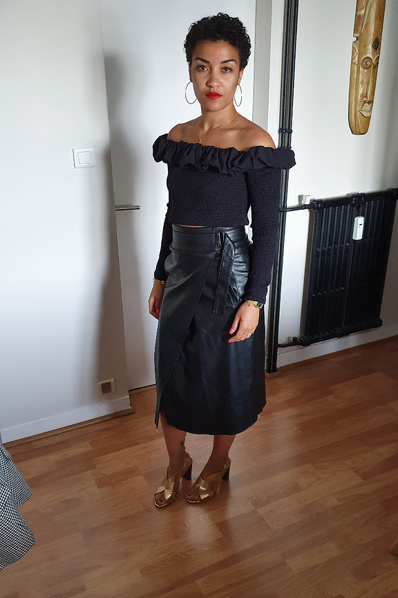 Portez le haut Marge prรจs du corps avec un jean taille haute. On est fan de son encolure Bardot et de son coloris basique noir.