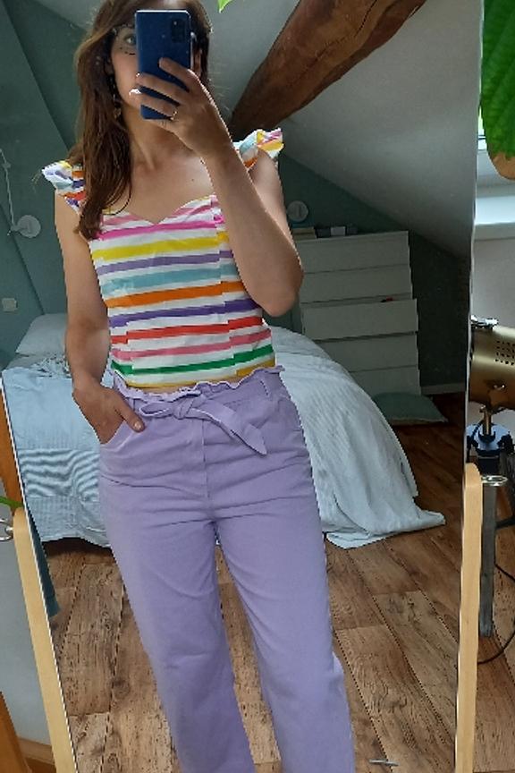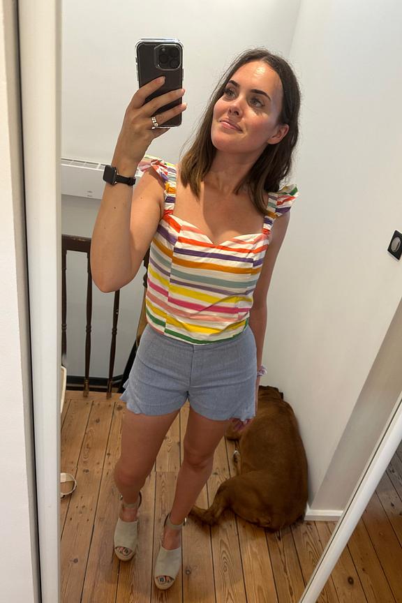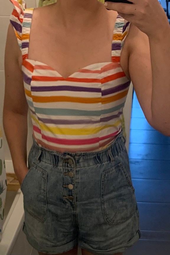 Le top canicule compatible qui mettra en valeur vos meilleurs atouts grรขce ร son dรฉcolletรฉ coeur ! โข Haut crop top ร manches volantรฉes โข Imprimรฉ rayรฉ multicolore โข Idรฉal avec un short en jean taille haute !