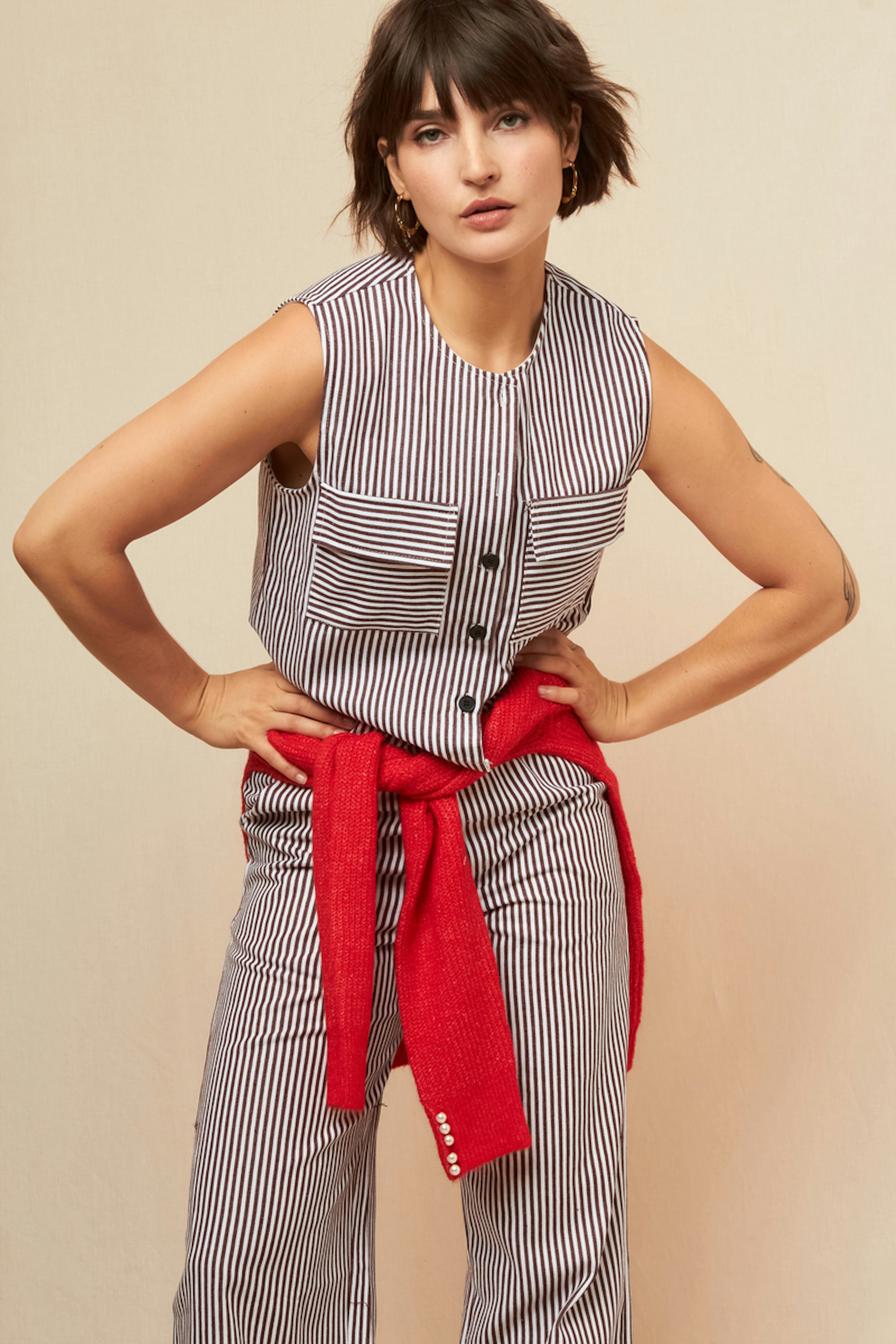 Un style marinière modernisé, ideal avec un jean blanc et des baskets pour un look estival. • Chemisier sans manches rayé • Coupe droite et décontractée • Encolure ronde et épurée • Fermeture boutonnée frontale • Deux poches poitrine fonctionnelles