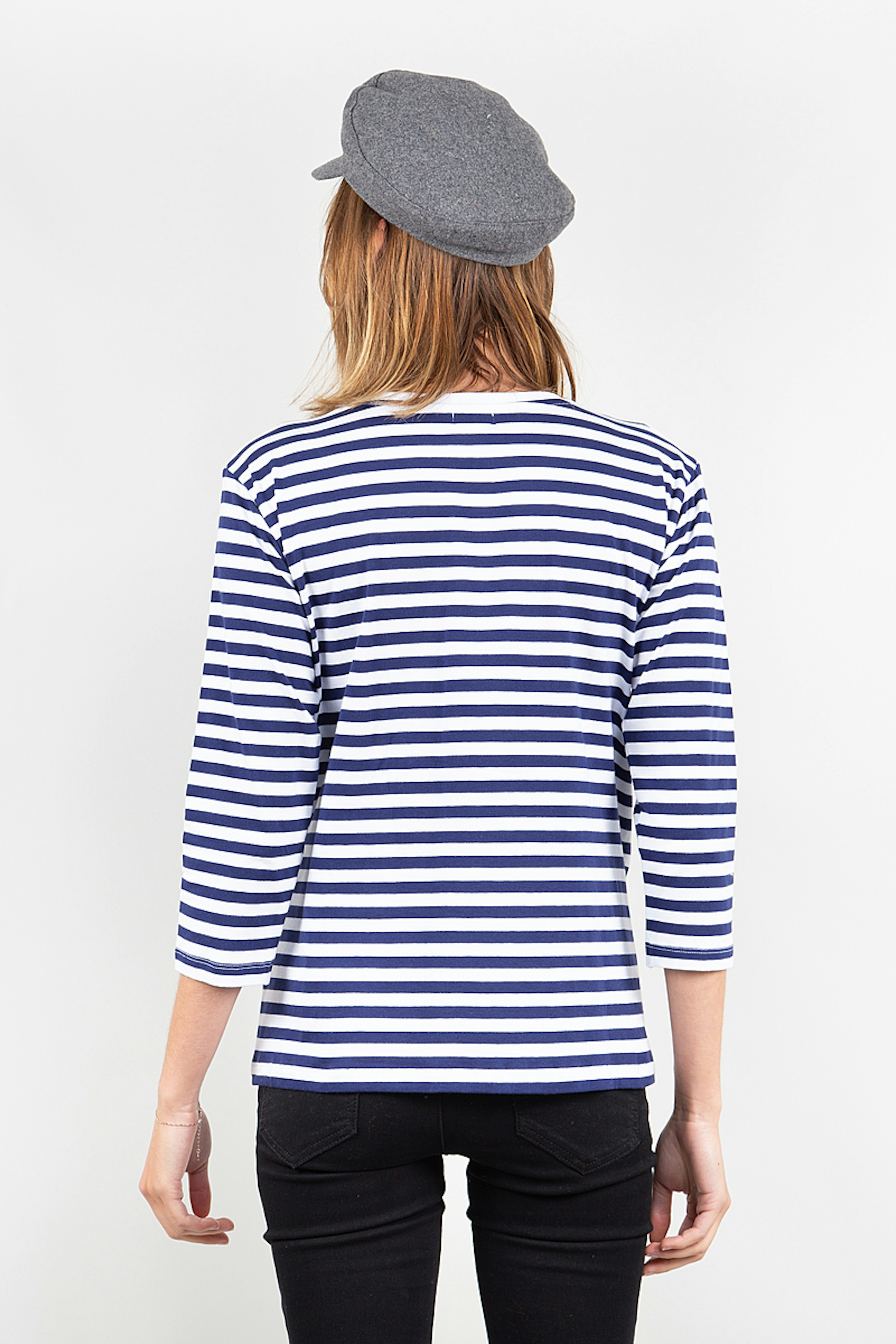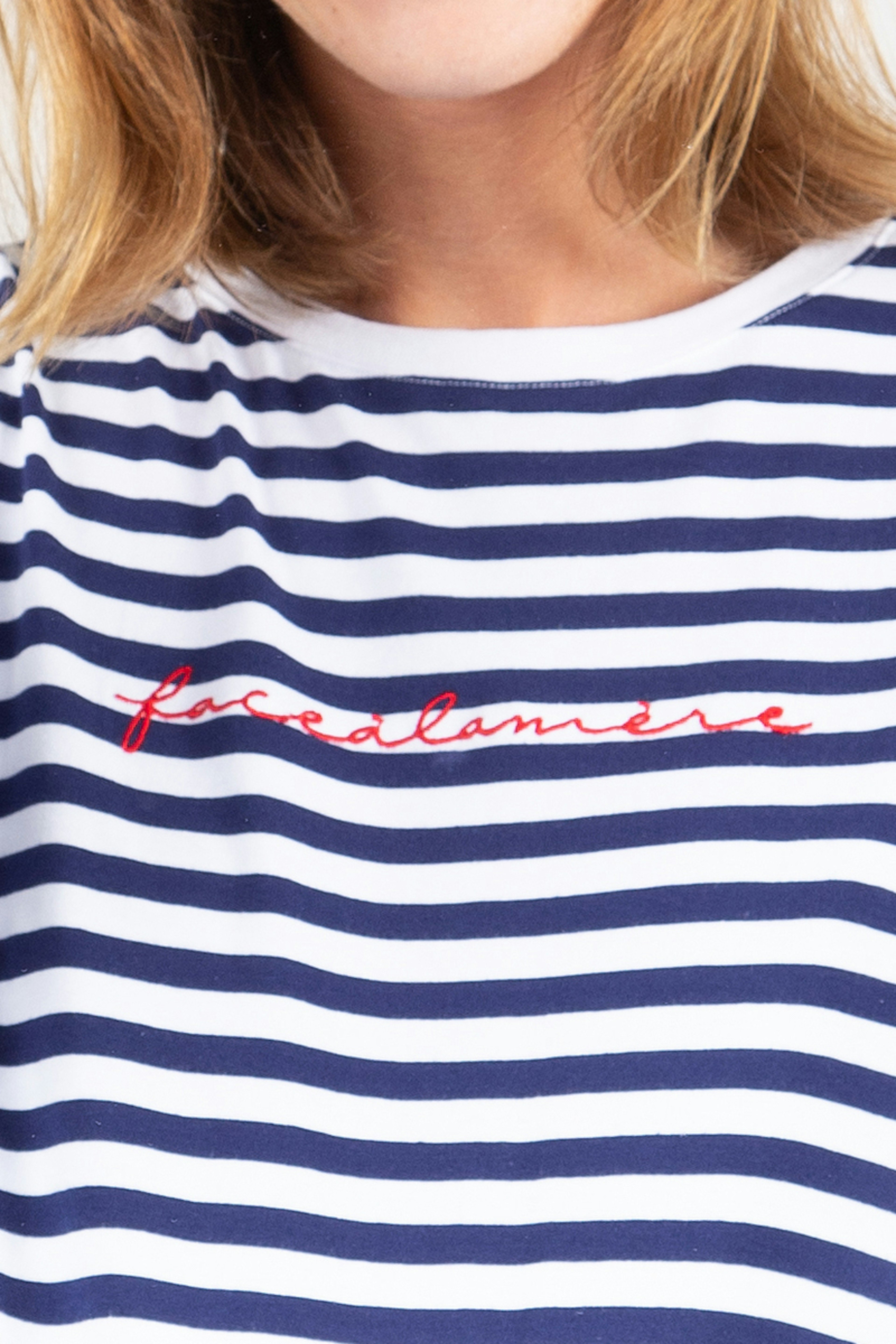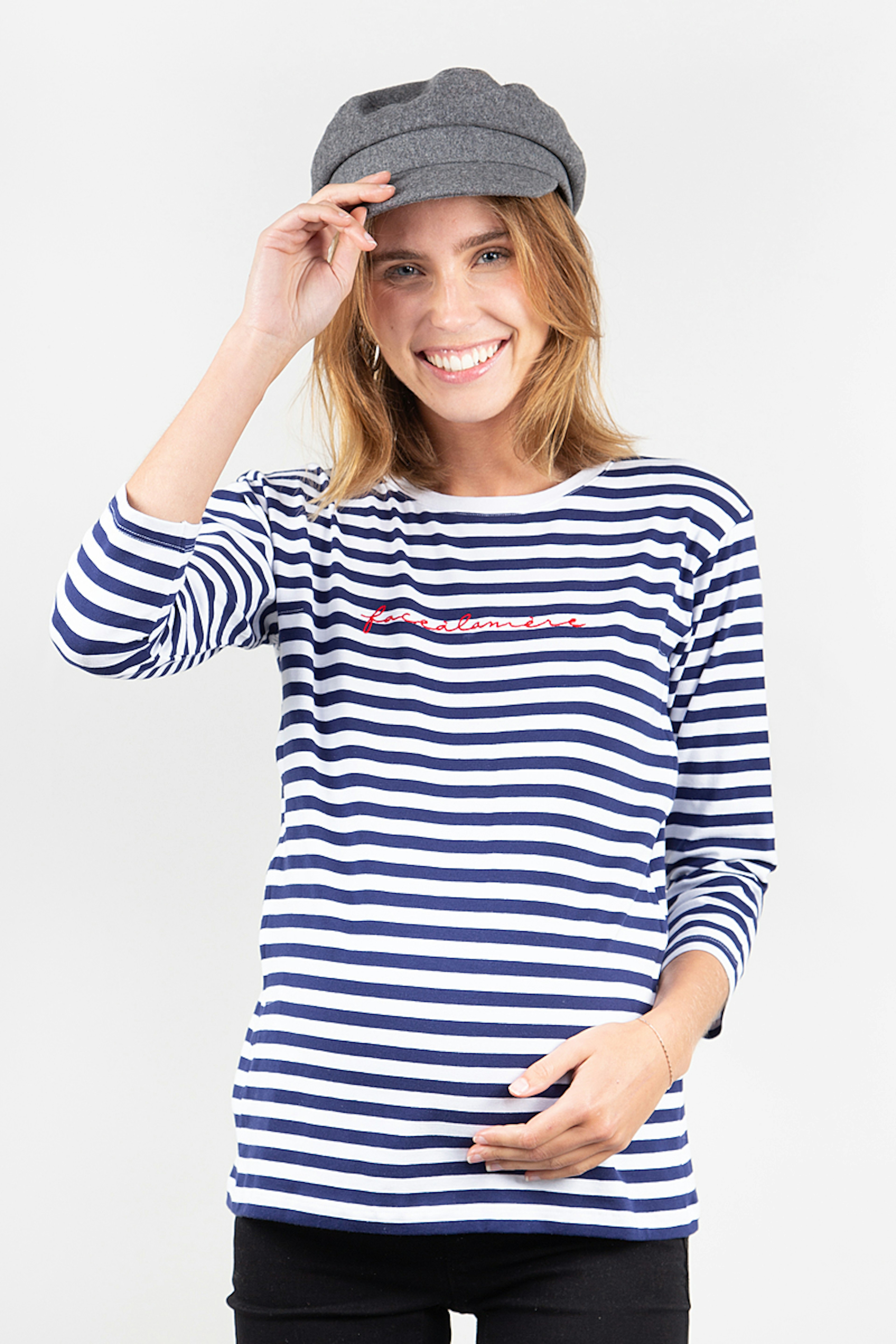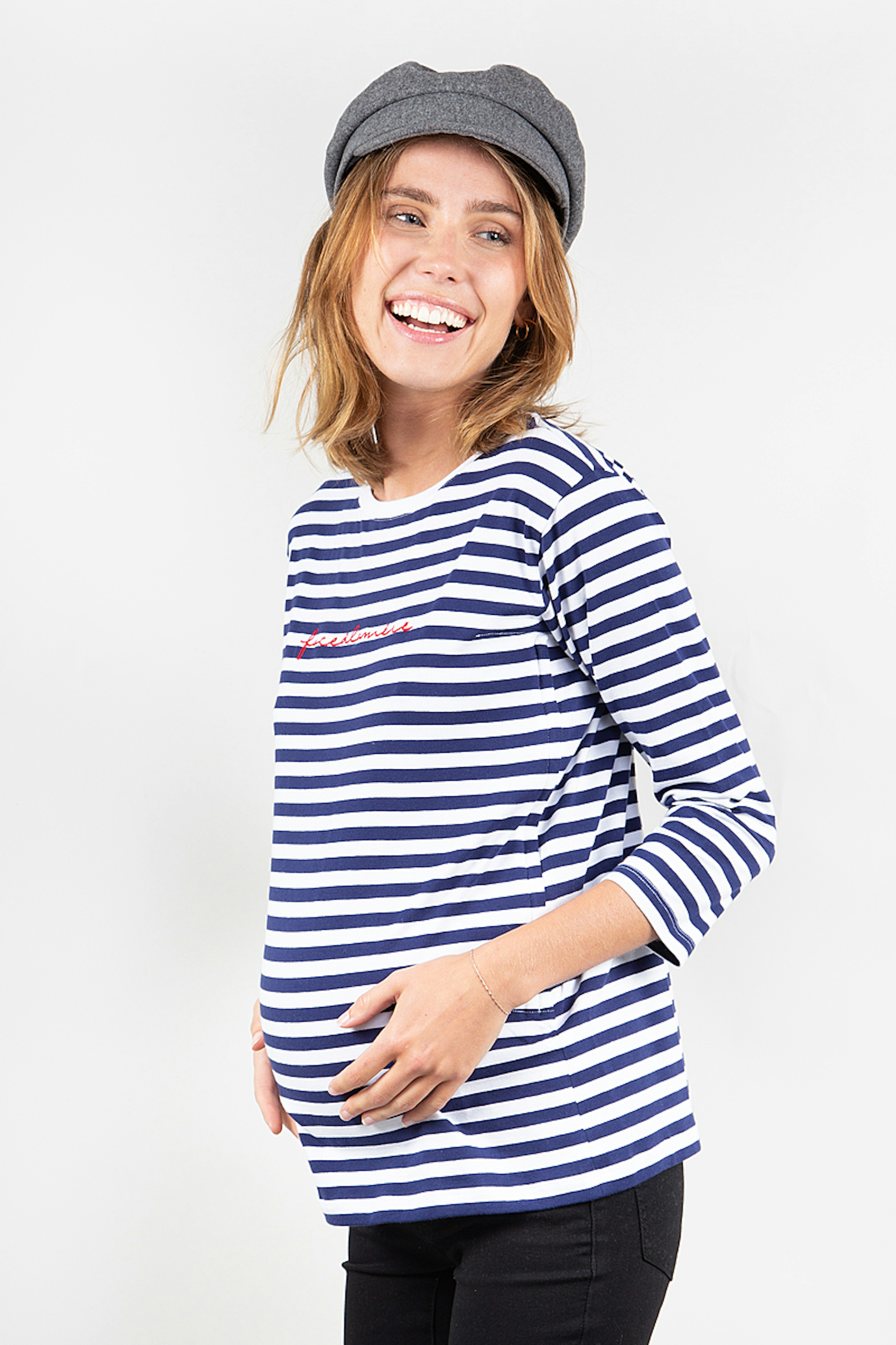 Tajinebanane revisite la mariniรจre en nous proposant son incontournable top "Face ร la mรจre" dans lequel vous pourrez allaiter en toute tranquilitรฉ. โข Mariniรจre avec broderie rouge "Face ร la mรจre" โข Coupe fit et รฉvolutive โข Double ouvertures + zips pour fermetures โข Bande de Jersey aฬ lโinteฬrieur pour assurer une discreฬtion optimale โข Manches 3/4 โข Fabriqueฬ au Portugal โข Certification OEKO-TEXยฎ