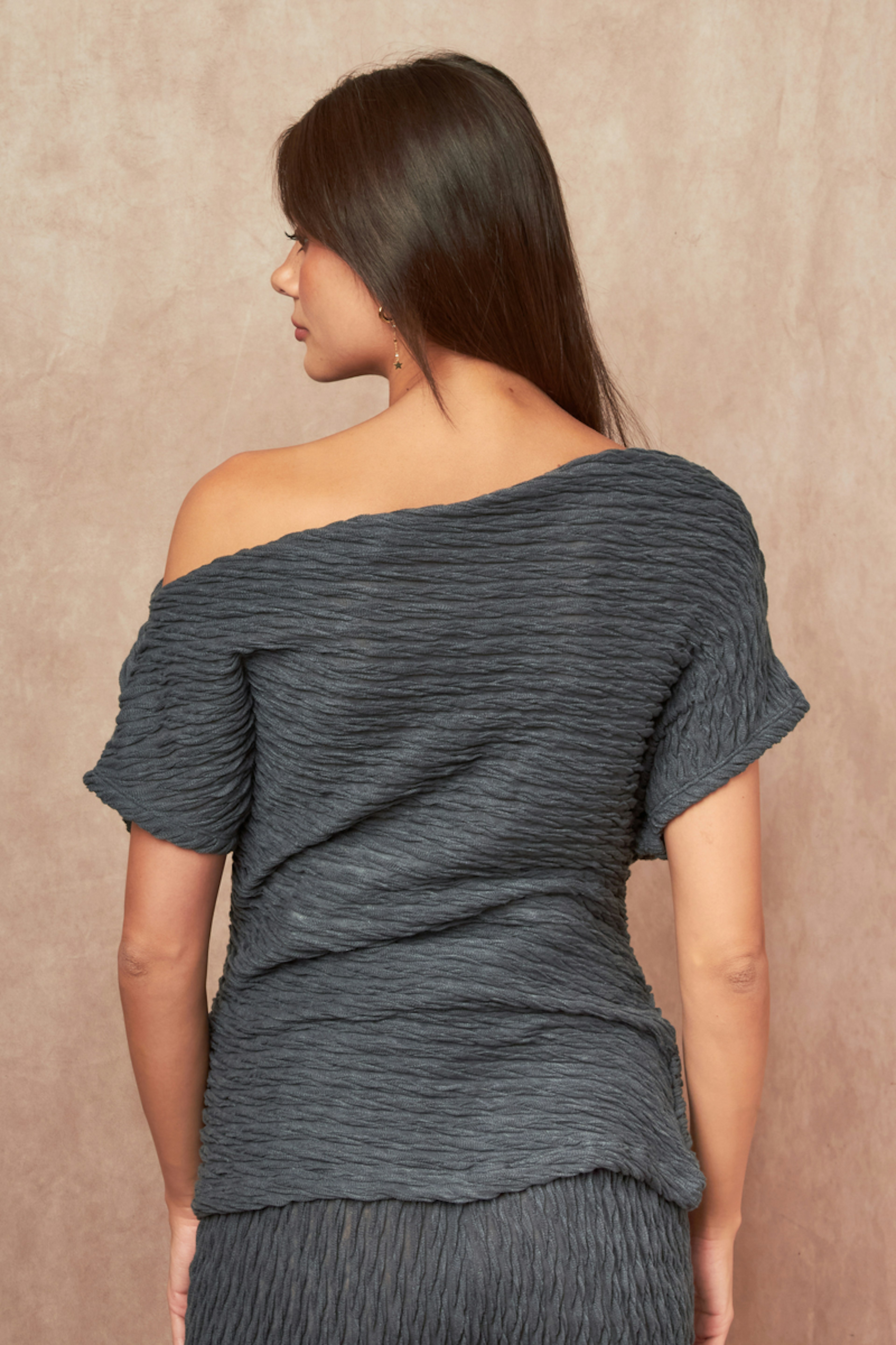 Pour un look estival chic, associez ce haut avec un pantalon blanc léger et des sandales dorées. • Haut asymétrique • Coupe ample • Tissu texturé • Style à une épaule • Élégance décontractée