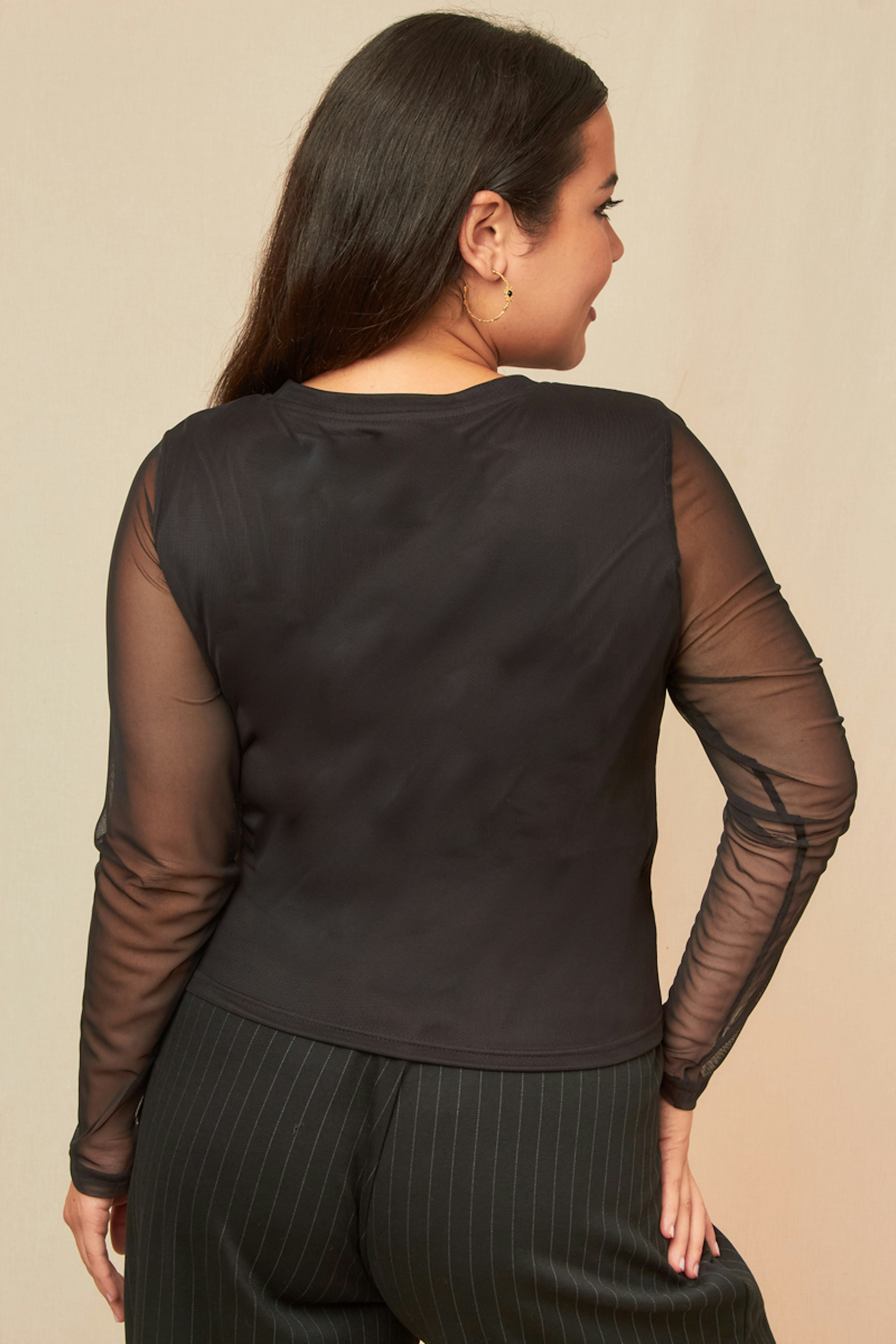 Portez ce top avec un pantalon taille haute et des bottines pour un look chic et moderne, parfait en toute saison. • Top en tulle • Manches longues transparentes • Col rond classique • Coupe ajustée • Doux et extensible