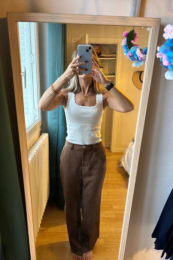 “Fait un super décolleté et matière très agréable mais un peu court à mon goût. Peut être porté avec des tailles hautes”