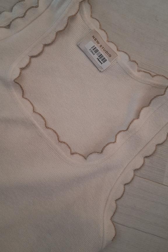 Associez ce haut à une jupe midi colorée et des sandales à talons pour un look estival élégant. • Top en viscose • Coupe ajustée sans manches • Décolleté carré festonné • Bords ondulés • Idéal pour l'été