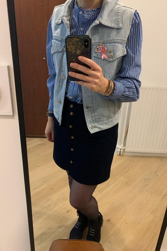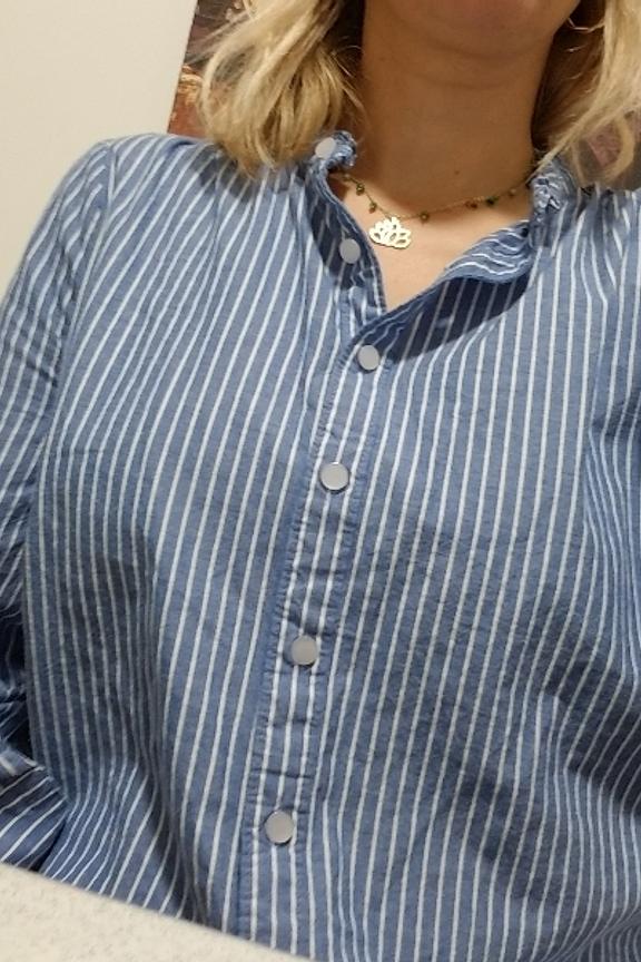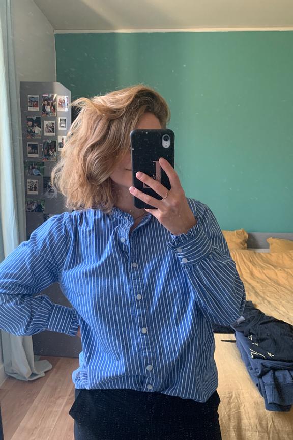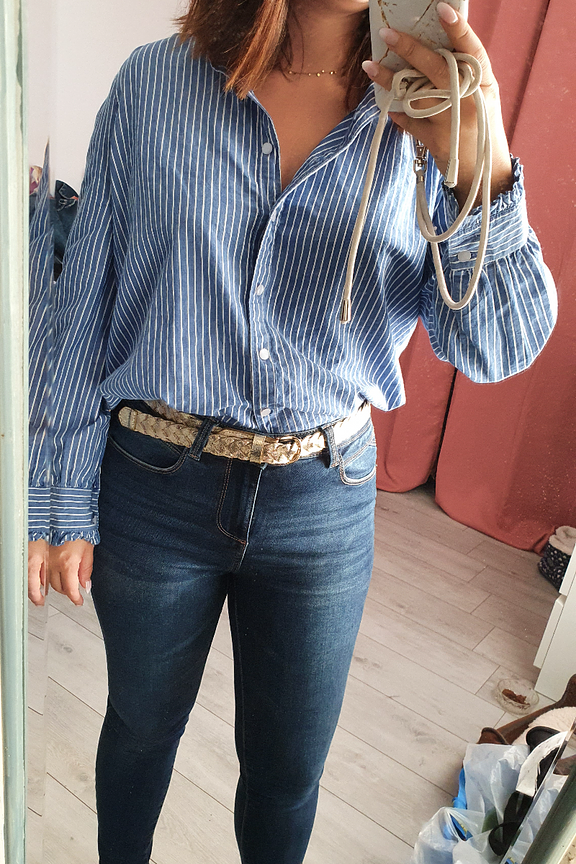 โข Chemise tendance bleu ร rayures blanches โข Boutons sur le devant โข Manches longues resserrรฉes aux poignets โข Volants au niveau du col et des manches