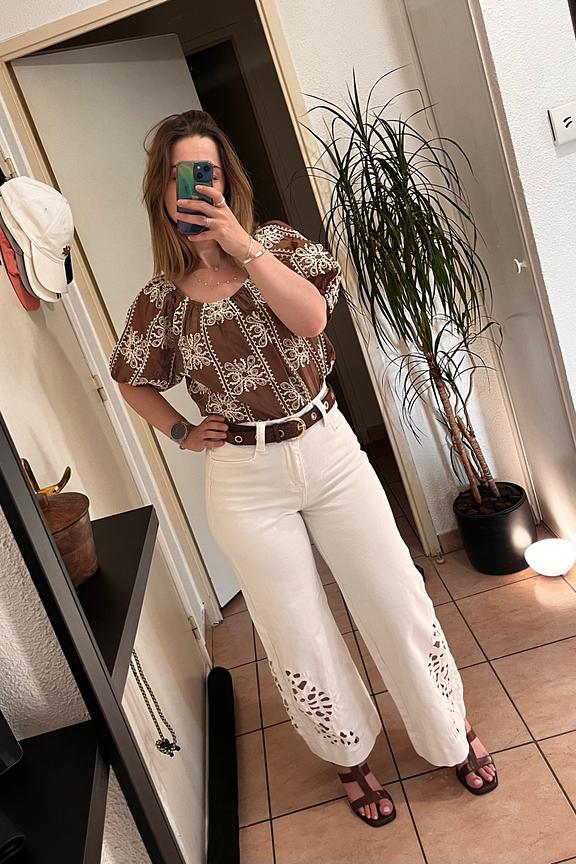 Portez ce top bohรจme avec un jean blanc et des sandales pour un look estival dรฉcontractรฉ. Parfait pour les soirรฉes d'รฉtรฉ! โข Top en voile lรฉger โข Coupe droite fluide โข รpaules dรฉnudรฉes โข Manches bouffantes โข Motif floral